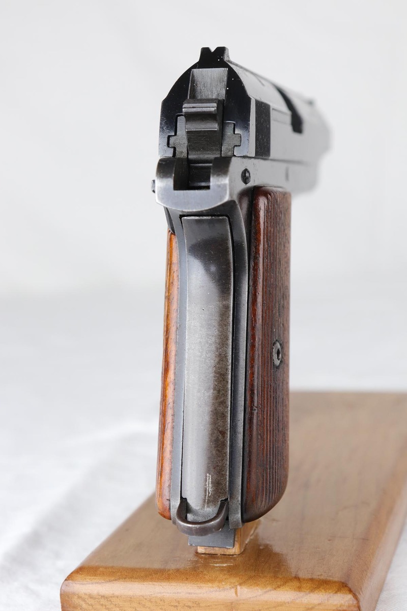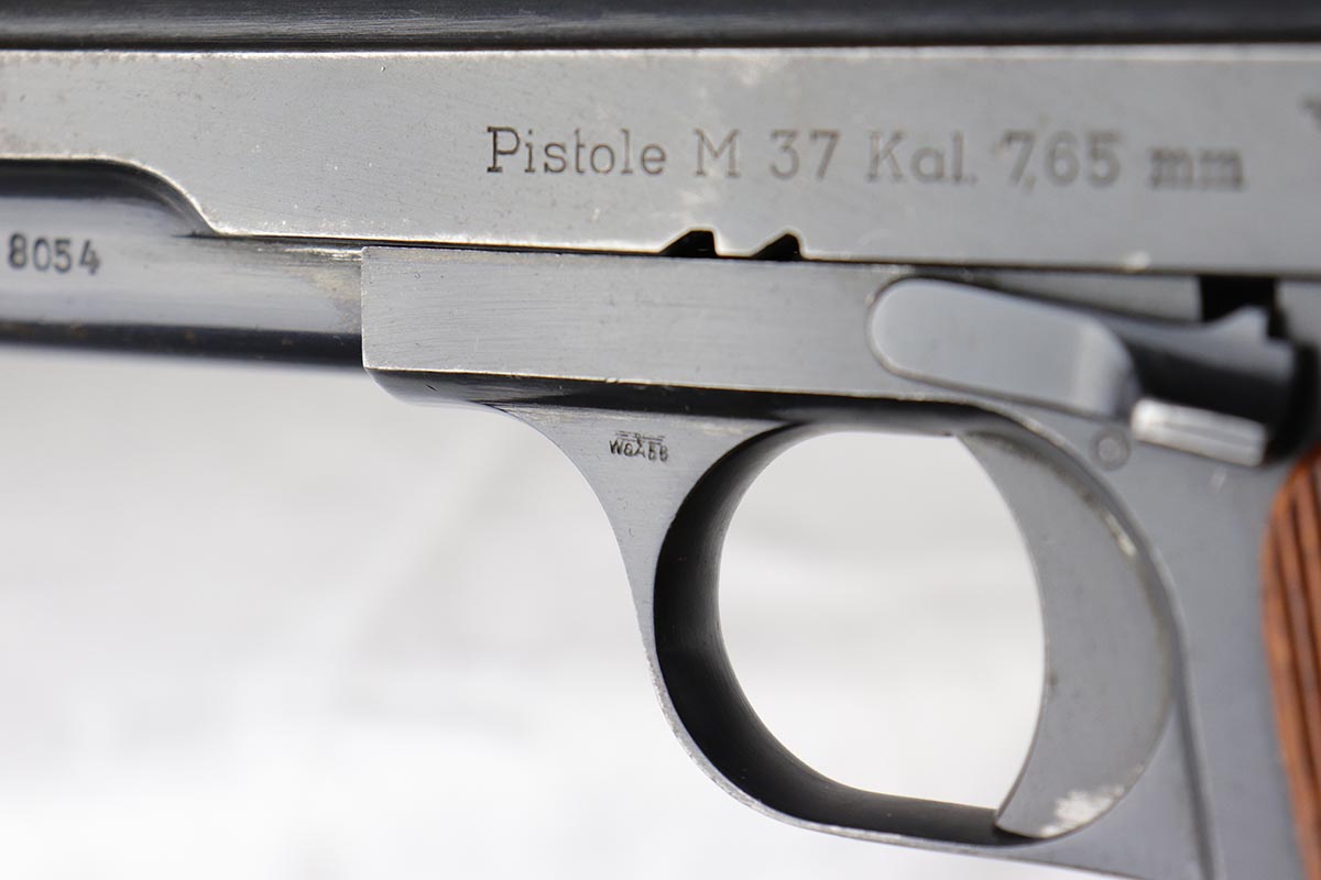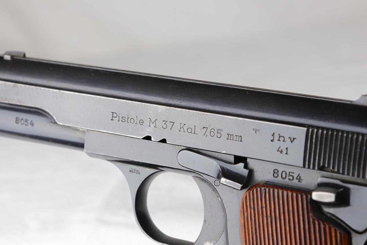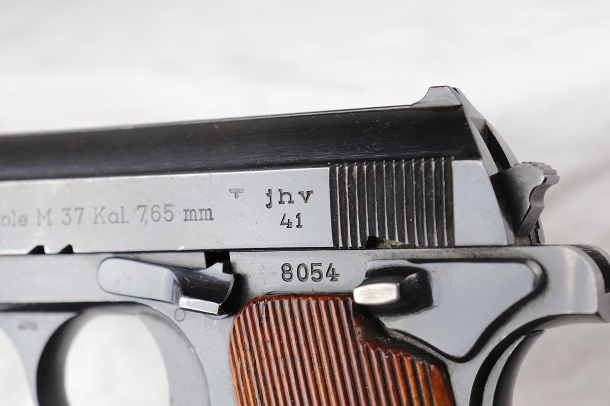 3/26/18 – This is an all matching and original Femaru M37 pistol, marked jhv 41 on the slide. This is an early four-digit serial for this first Nazi contract pistol, one of ~30,000 jhv 41’s issued. The slide legend is a little different on these early guns, and easily noticeable when compared side by side. The bluing rates at about 92% with minor slide wear and a back strap showing thinning and patina. The magazine is numbered to the pistol. The bore has strong rifling with minor frosting. Excellent grips. We also have an early variation 41 dated tropical holster for this gun available in our HOLSTER section.