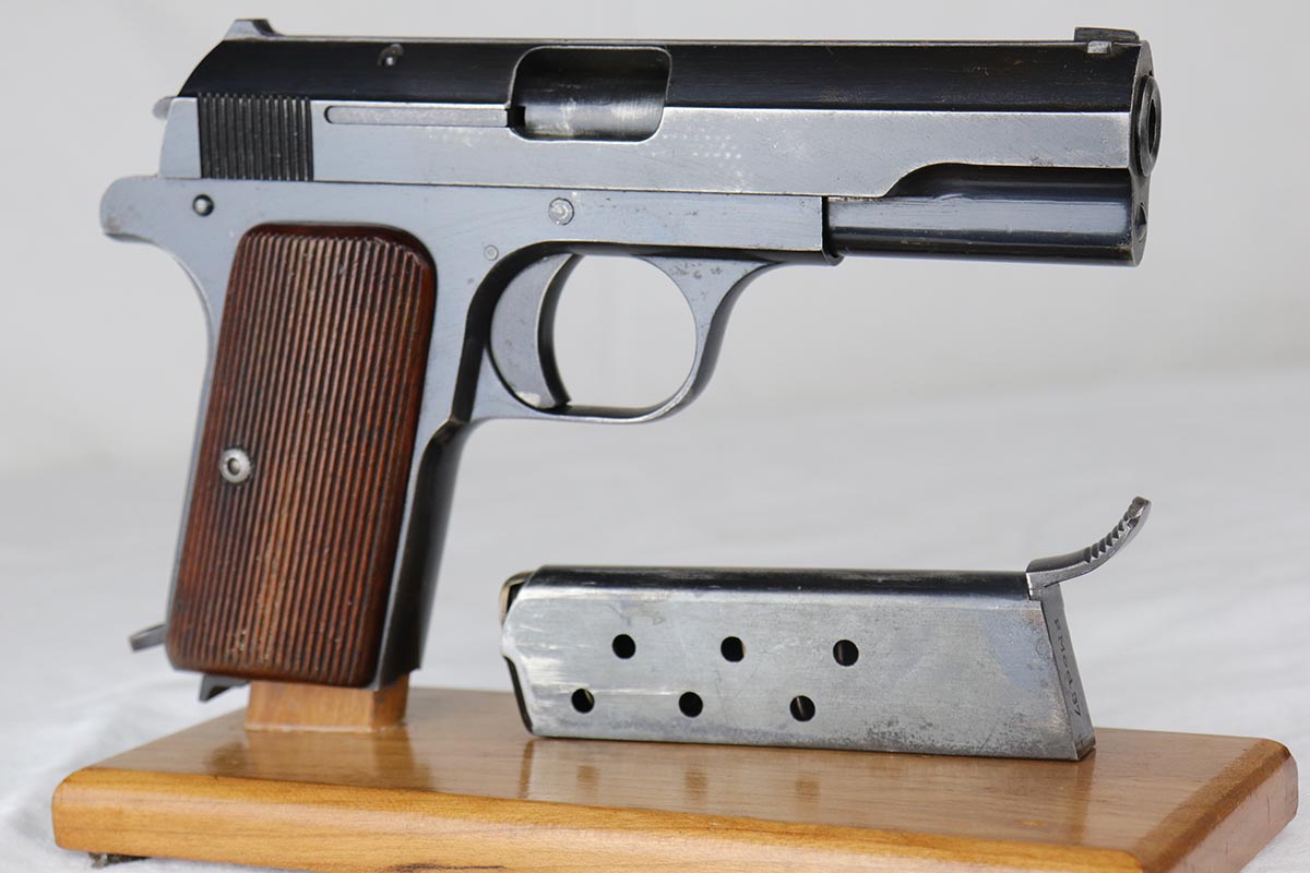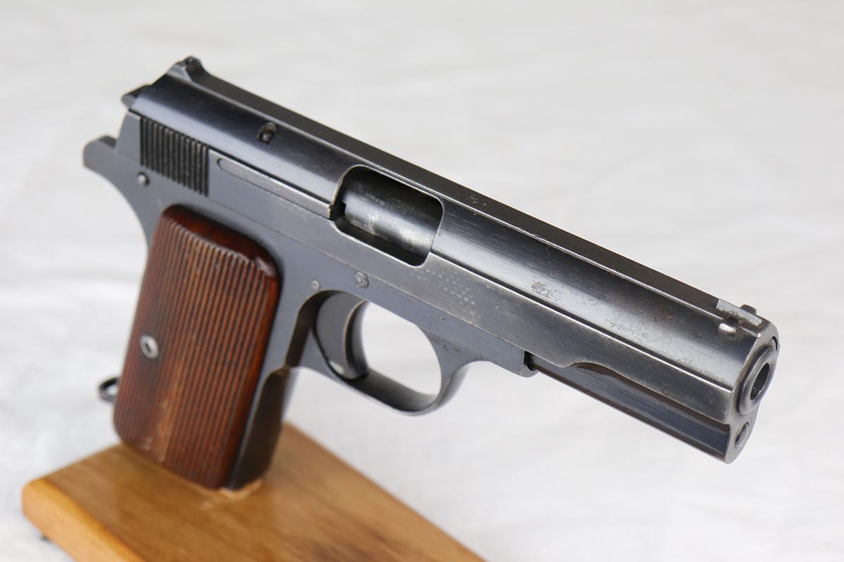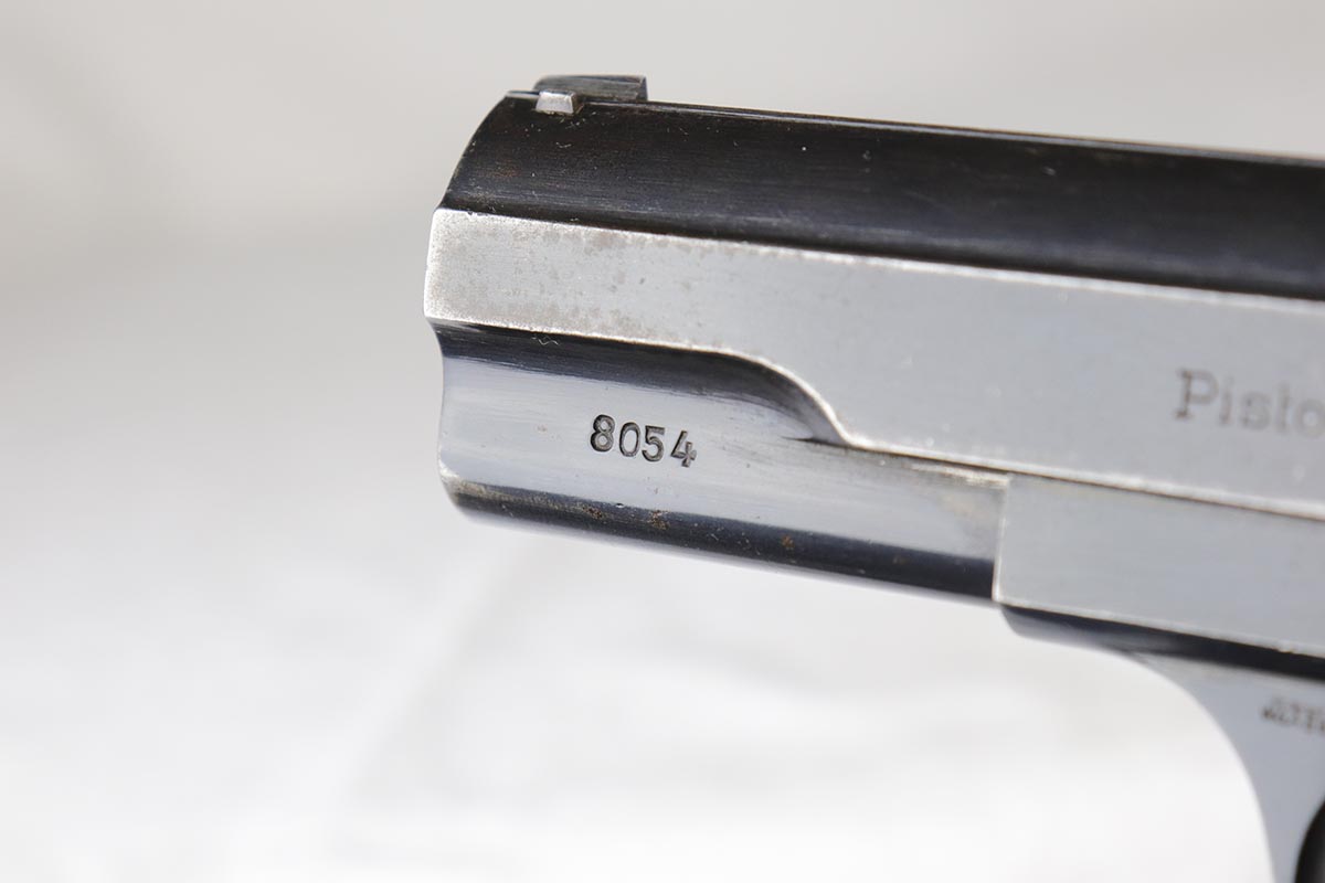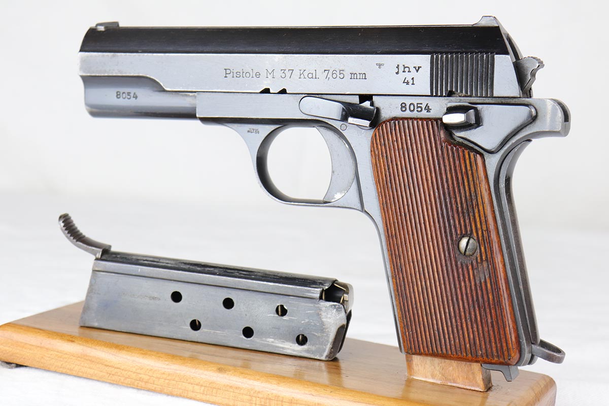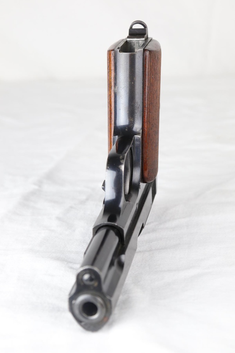 3/26/18 – This is an all matching and original Femaru M37 pistol, marked jhv 41 on the slide. This is an early four-digit serial for this first Nazi contract pistol, one of ~30,000 jhv 41’s issued. The slide legend is a little different on these early guns, and easily noticeable when compared side by side. The bluing rates at about 92% with minor slide wear and a back strap showing thinning and patina. The magazine is numbered to the pistol. The bore has strong rifling with minor frosting. Excellent grips. We also have an early variation 41 dated tropical holster for this gun available in our HOLSTER section.