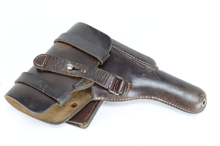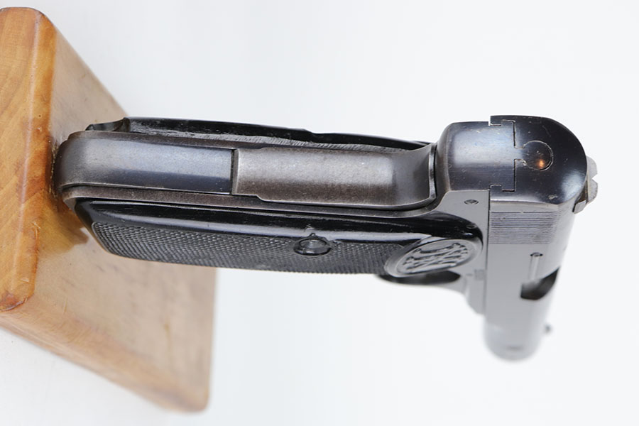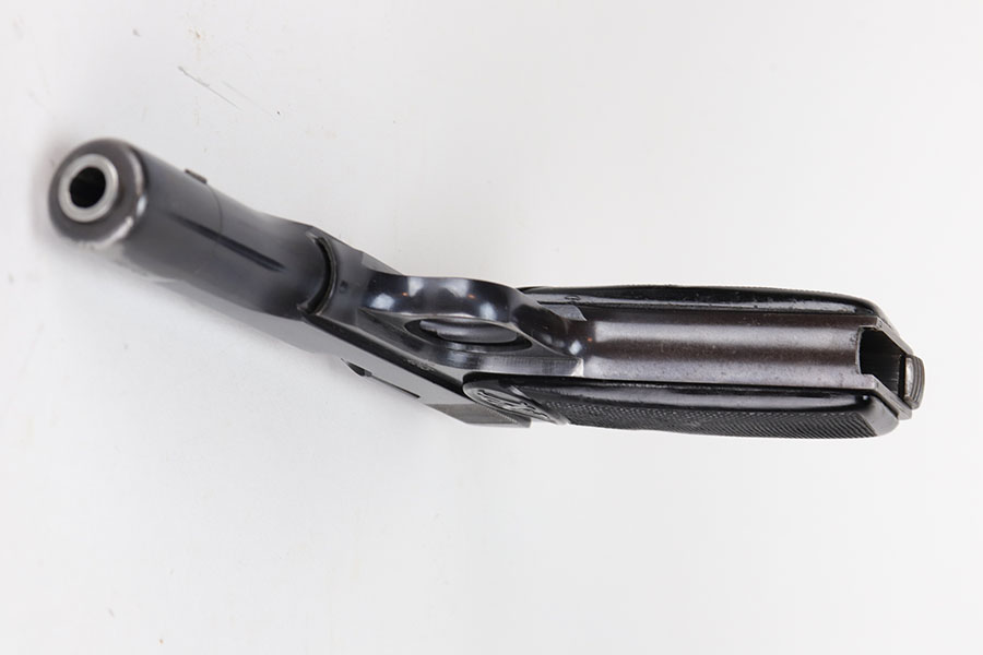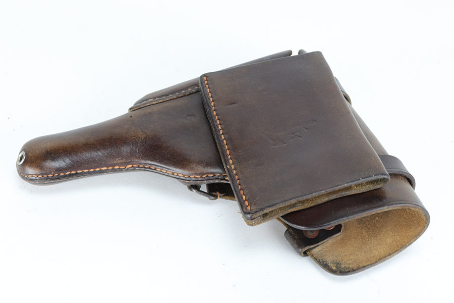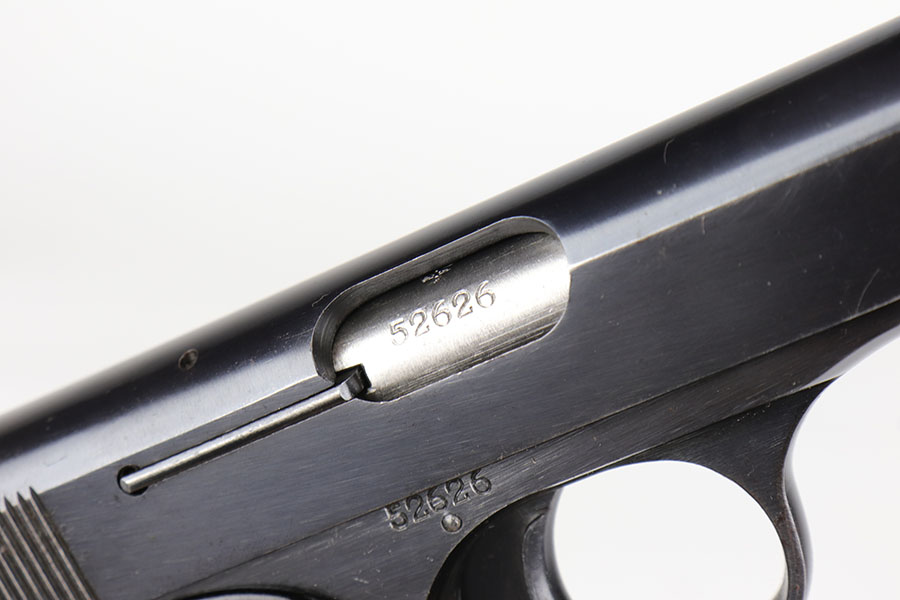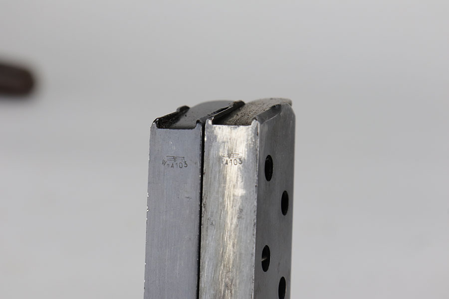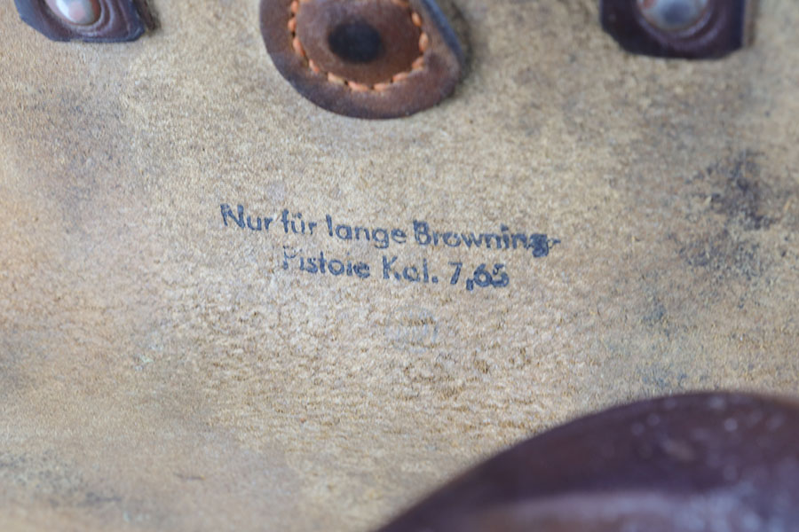 10/23/20 – This is a nice example of a complete and fairly early Nazi FN Browning M1922 rig. It’s one of the first ~30,000 produced by the Germans and has the earlier WaA103 proofs on slide and frame. The pistol has all matching numbers and about 90% of the original blue. Muzzle wear from the holster is standard but also some thinning and patina on the grip safety and front strap. Excellent bore. Nice, early grips with the cutout for the lanyard ring. Both magazines feature WaA103 proofs on spine, too. Holster is HK marked on the back with internal inkstamp. It’s in good condition aside from minor cracking around the mag pouch and some notable wear on the closure strap.