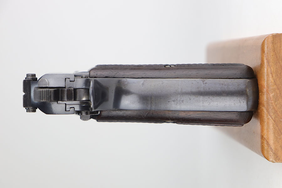 11/11/20 – This is a rare and very early Nazi FN Browning High Power with tangent sight and WaA613 proofs on slide, frame and barrel. The pistol has excellent bluing in the profile view, though there’s minor freckling on each side of the slide. Most of the finish loss is on the front strap, with a little more thinning and oxidation on the back strap. The rare magazine also has WaA613 proof. Bore has strong rifling and minor frost.