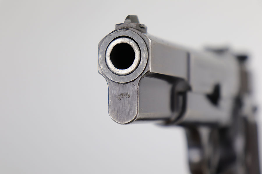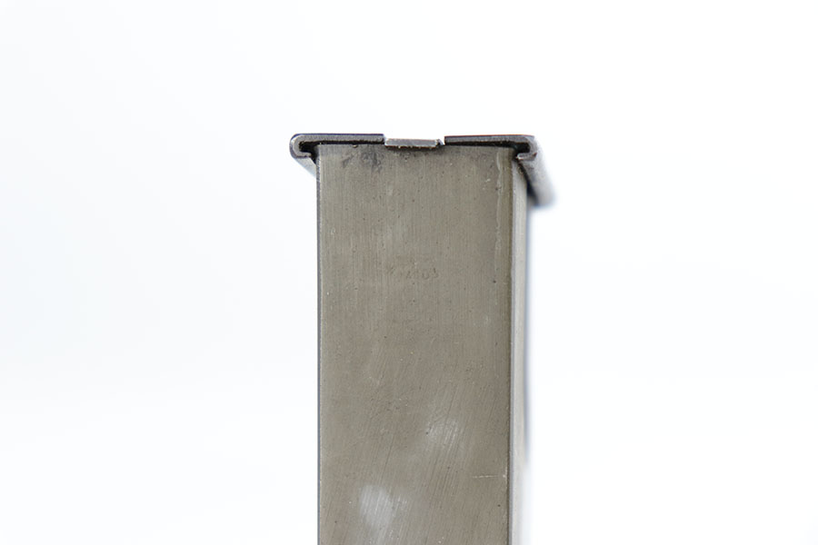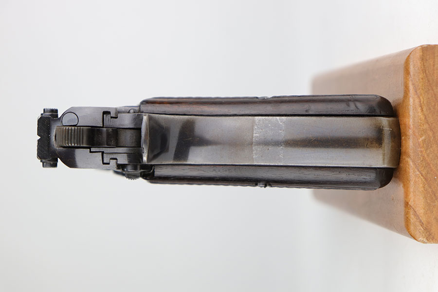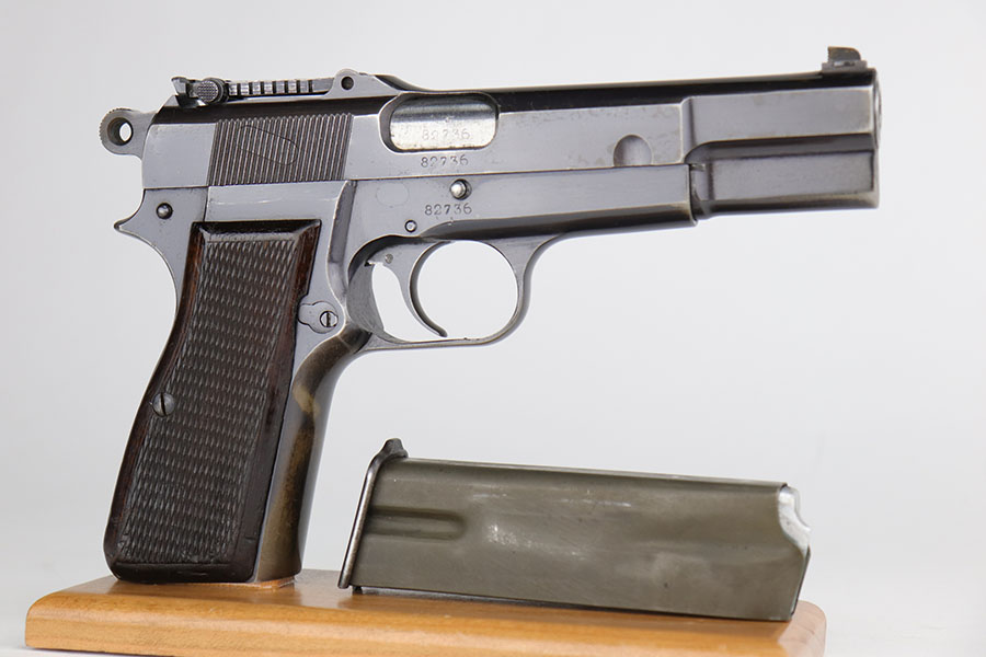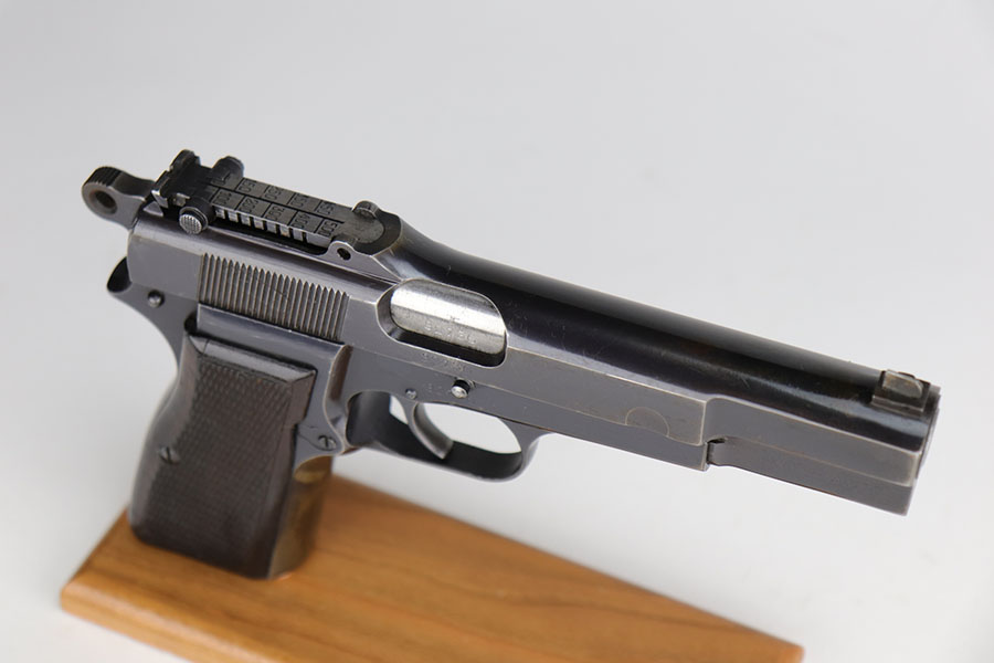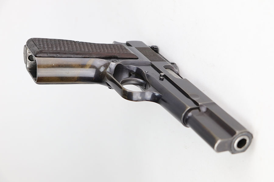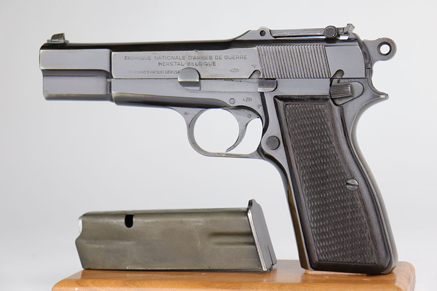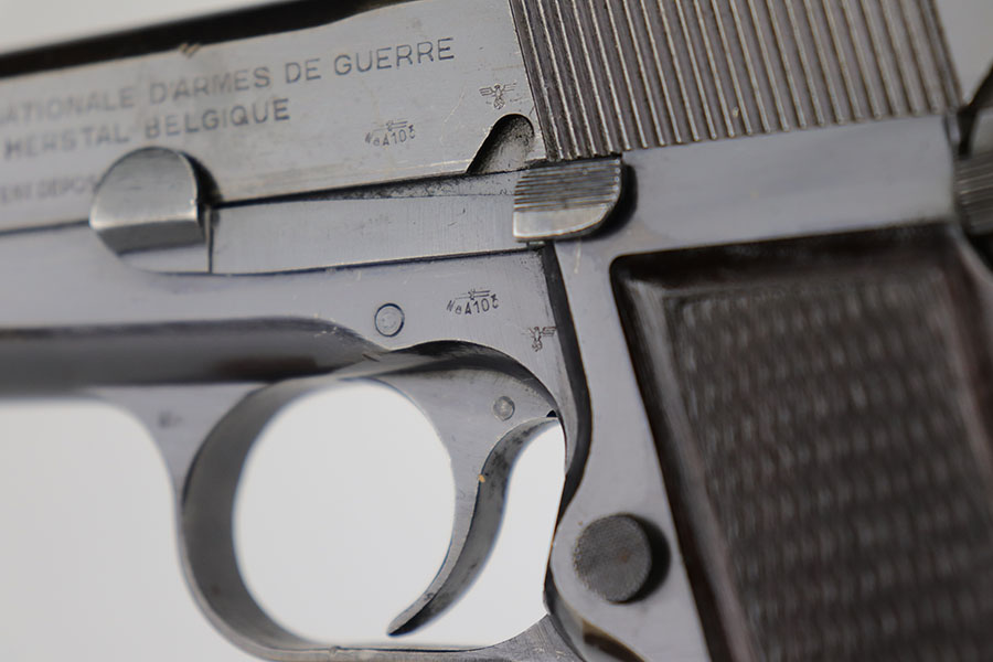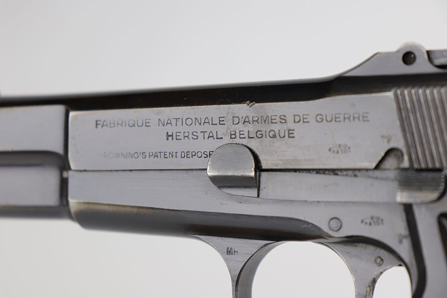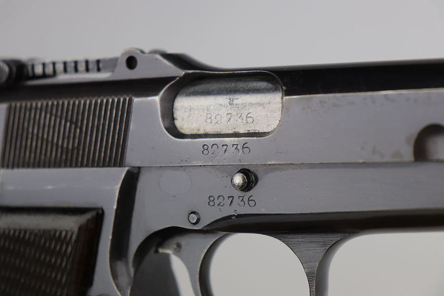 11/19/20 – This is an early Nazi FN Browning High Power with tangent rear sight and desirable WaA103 proofs on slide and frame. The magazine also has a WaA103 proof but it’s quite faint. The pistol has about 80-85% of the original blue with an excellent profile but most of the wear and patina on the straps. The rear strap also has a rigid horizontal patch of bluing loss as if a piece of tape or something similar was once on it. The bore and grips are excellent. All matching numbers throughout.