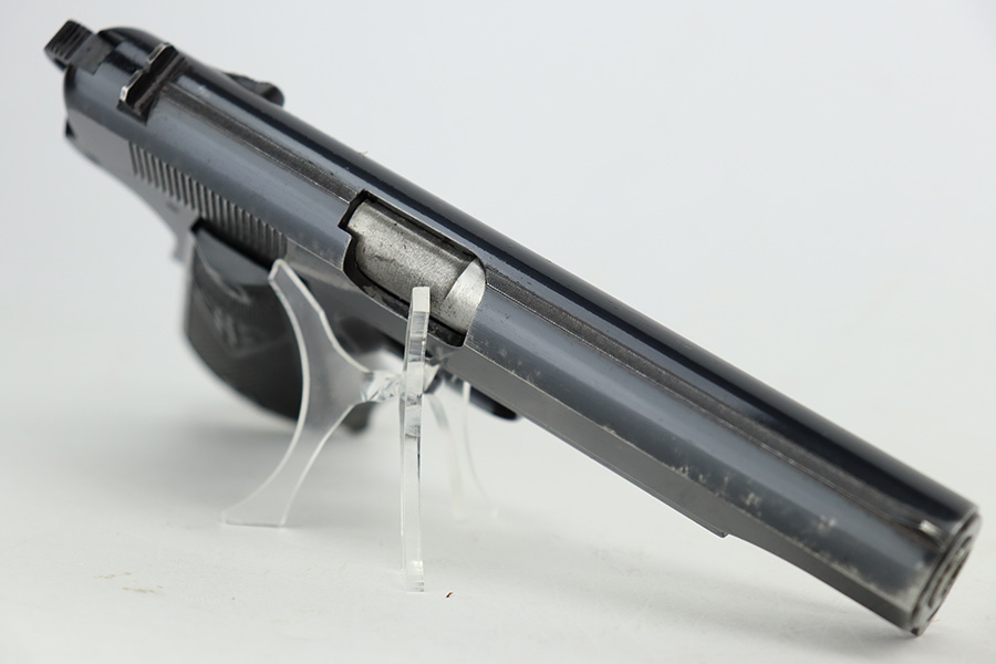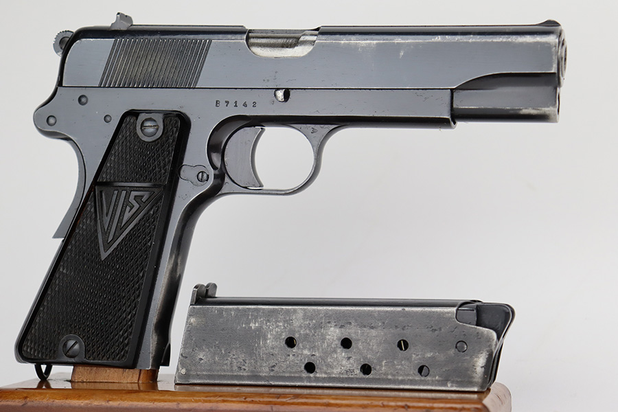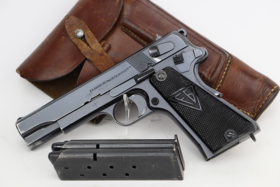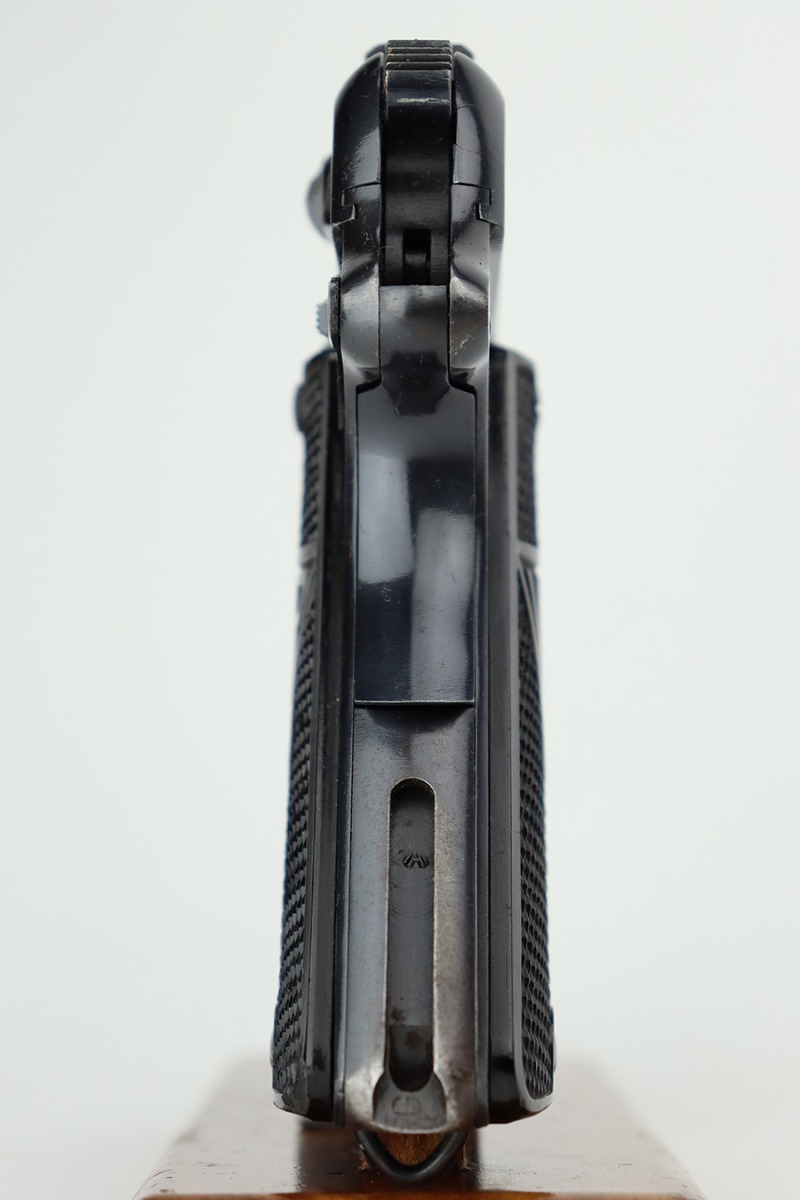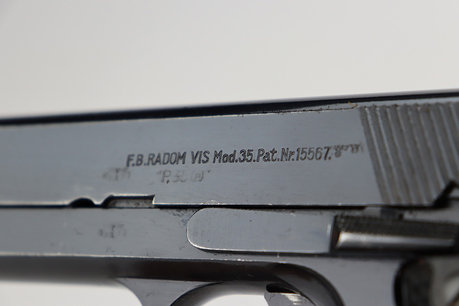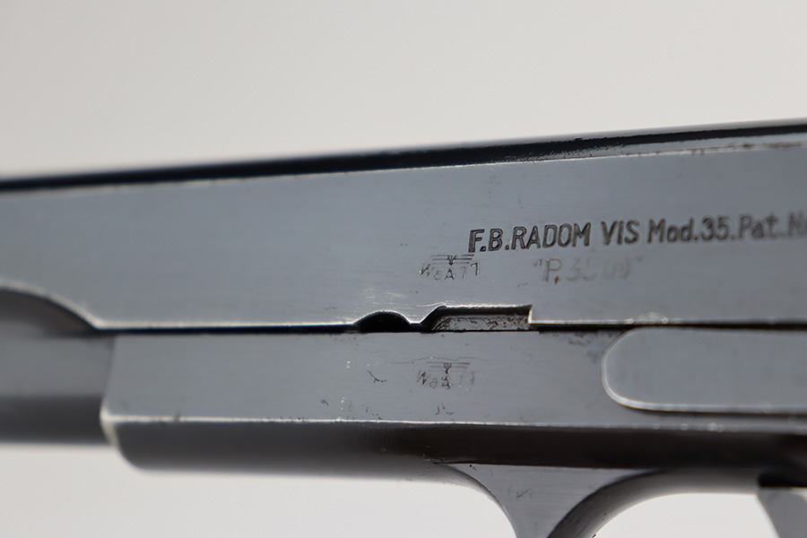 6/22/23 – This is an early and desirable Nazi Radom VIS Model 35 with slotted frame and three lever design. All matching with the proper “Waffen 77” and “Eagle 623” Nazi military acceptance proofs. Comes as a rig with a nice tan leather holster (faint ink stamps on the inside) and two period-correct but un-marked magazines. The gun itself has retained about 92-93% of its original high polish finish. The majority of the wear is on the front strap, but there is also minor muzzle wear, and light spotty wear along the right side of the slide. Fitted with very nice period-correct black bakelite grips. Very nice bore with strong rifling, but there is some very light freckling in the grooves.