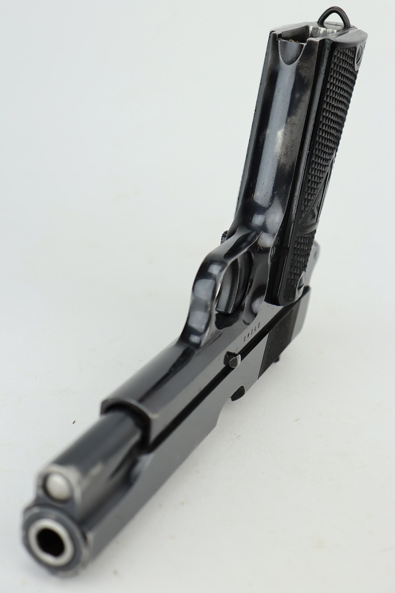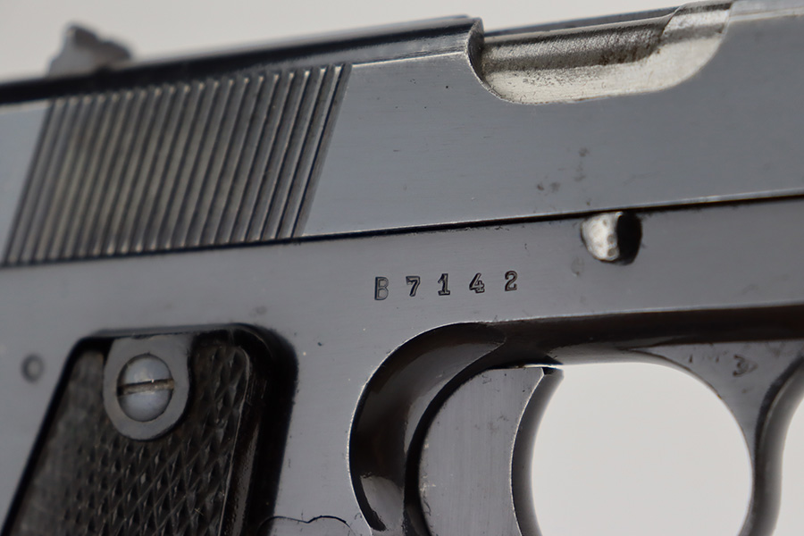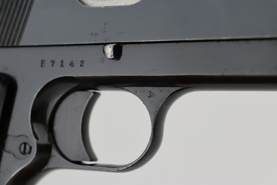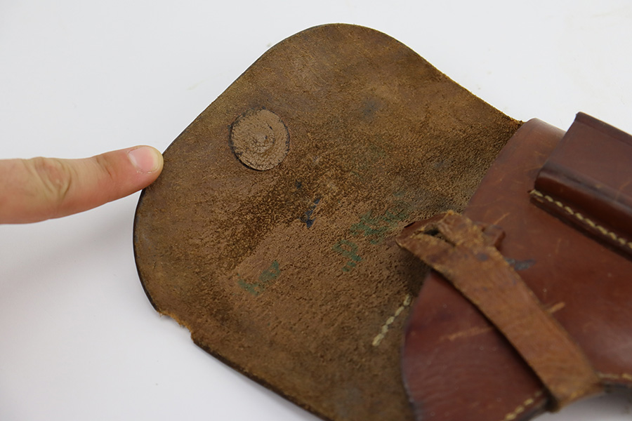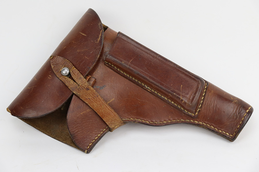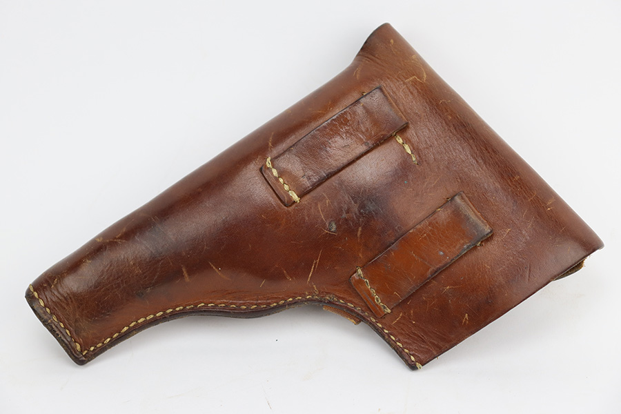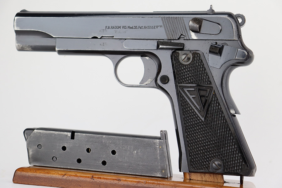 6/22/23 – This is an early and desirable Nazi Radom VIS Model 35 with slotted frame and three lever design. All matching with the proper “Waffen 77” and “Eagle 623” Nazi military acceptance proofs. Comes as a rig with a nice tan leather holster (faint ink stamps on the inside) and two period-correct but un-marked magazines. The gun itself has retained about 92-93% of its original high polish finish. The majority of the wear is on the front strap, but there is also minor muzzle wear, and light spotty wear along the right side of the slide. Fitted with very nice period-correct black bakelite grips. Very nice bore with strong rifling, but there is some very light freckling in the grooves.