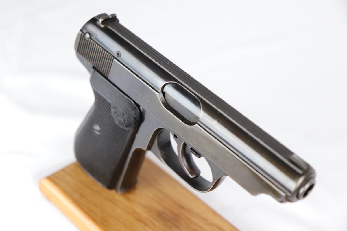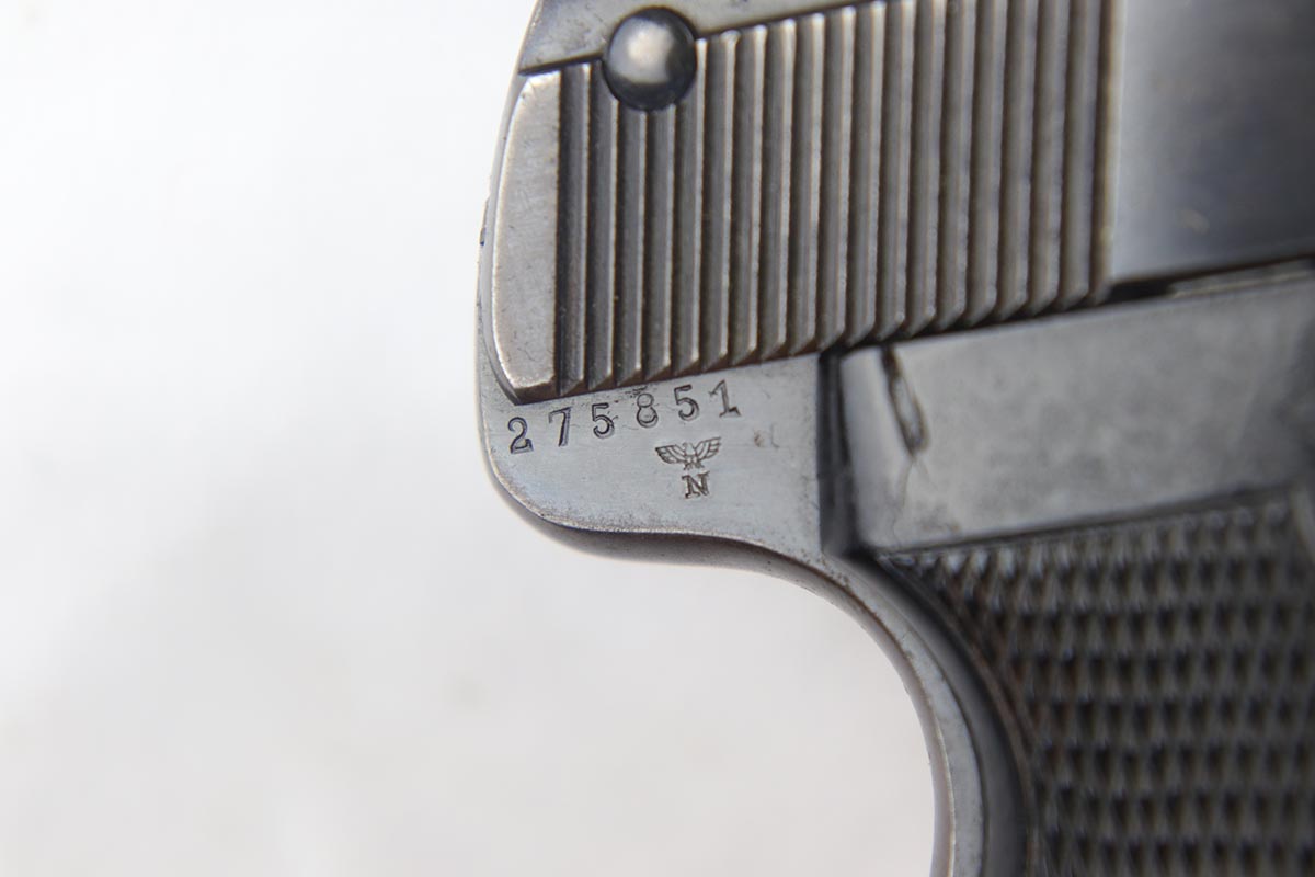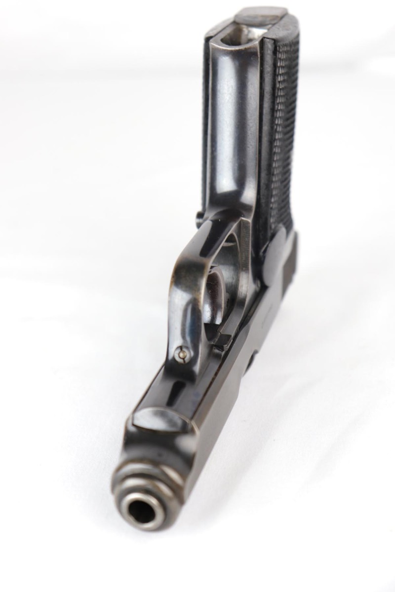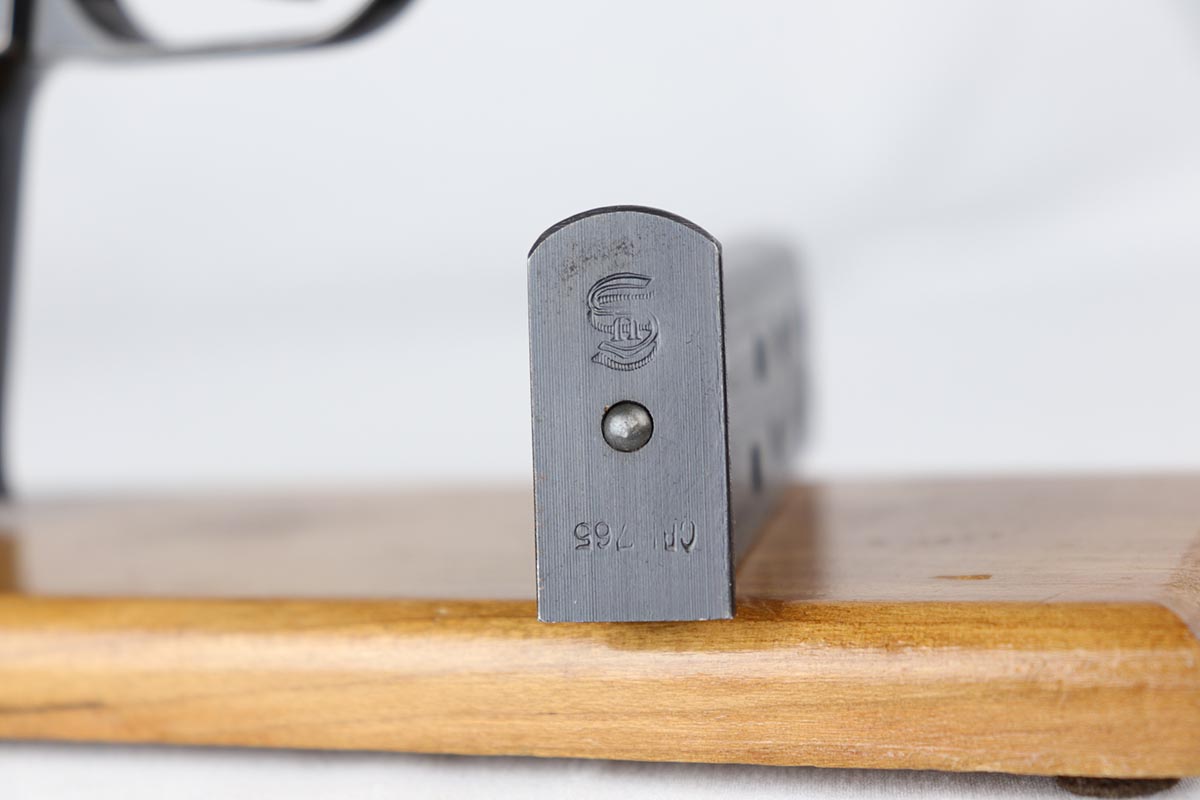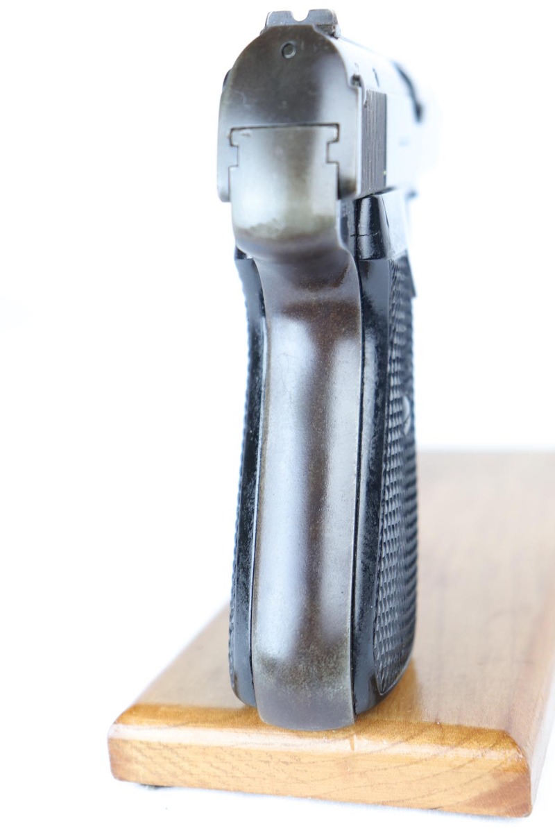 7/17/18 – This is an early Nazi issued Sauer 38h with original high-polish blued finish. The pistol is original and correct with 85-90% blue remaining. It has a nice profile view but the right side of the slide and the back strap show considerable browning. There is also some muzzle wear on the left side. Very nice original grips and magazine with no notable flaws. Excellent bore.