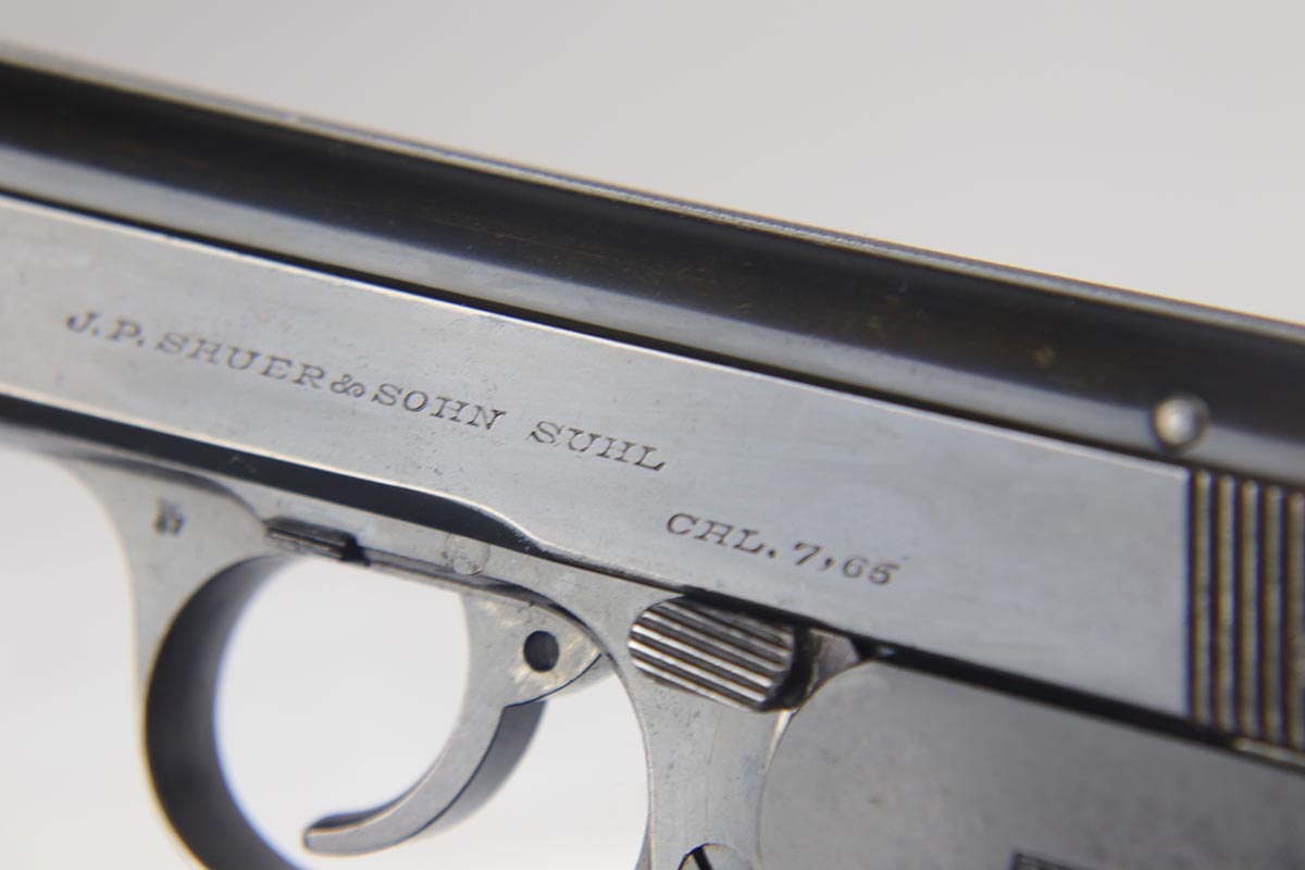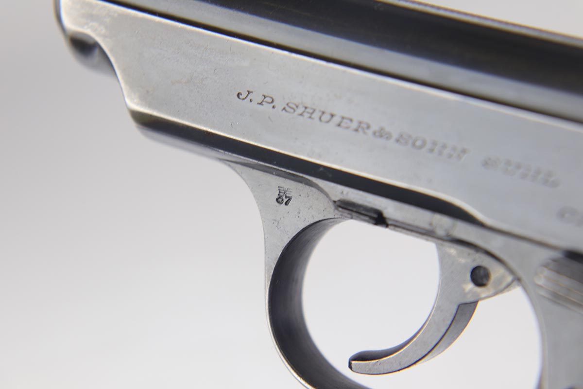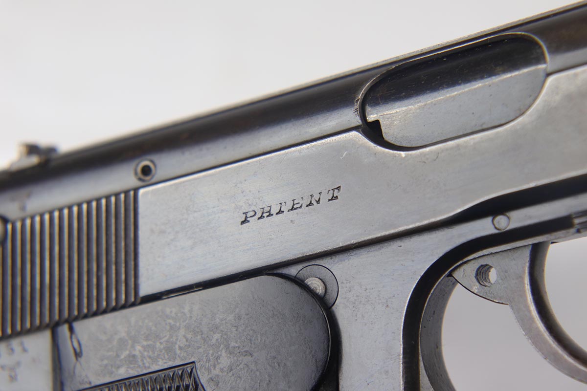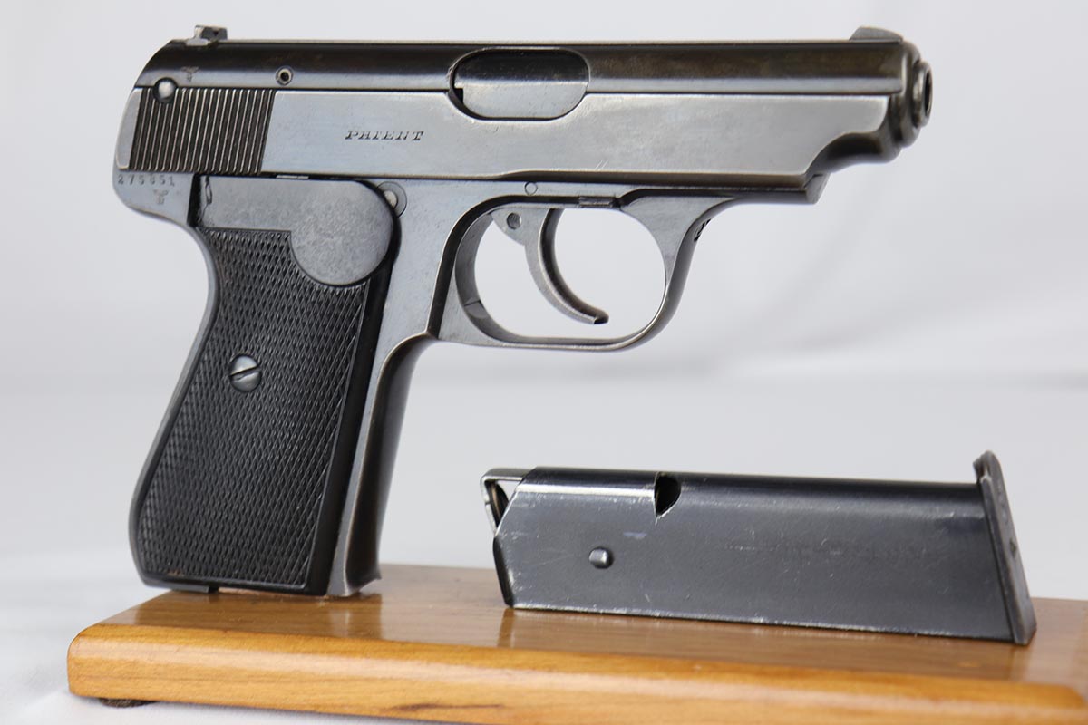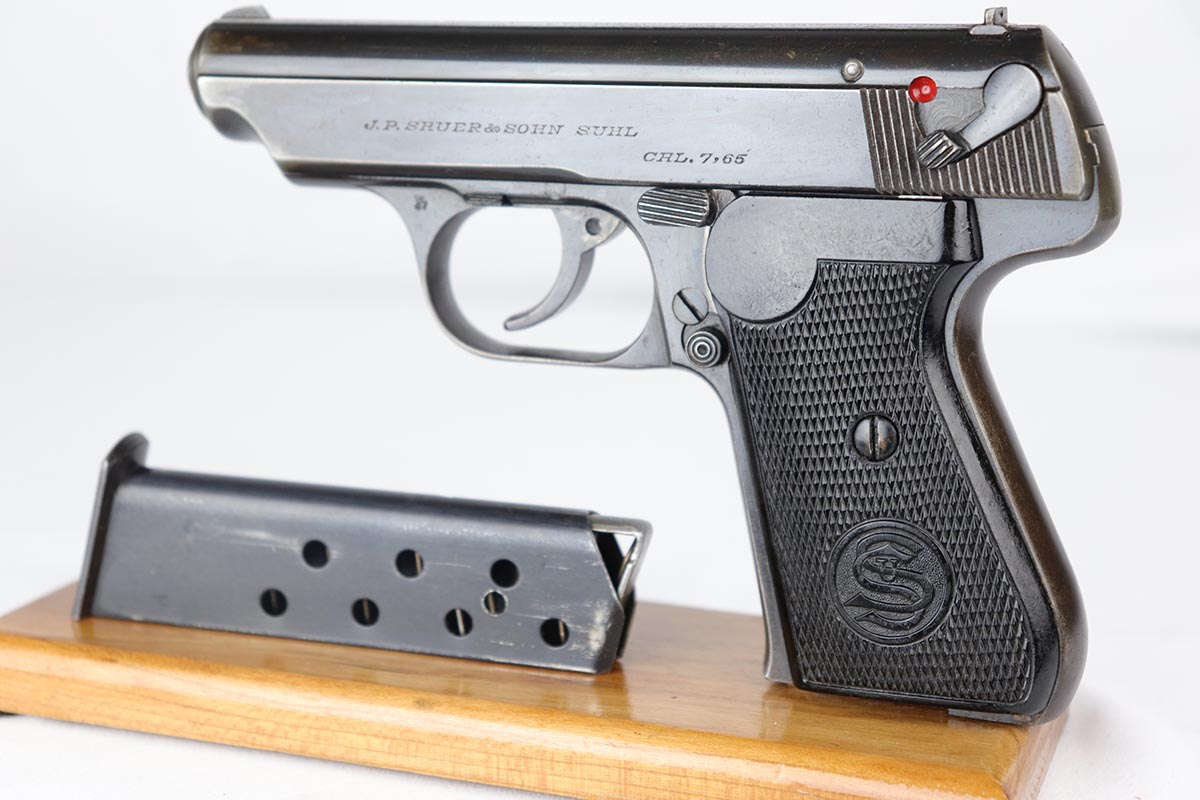 7/17/18 – This is an early Nazi issued Sauer 38h with original high-polish blued finish. The pistol is original and correct with 85-90% blue remaining. It has a nice profile view but the right side of the slide and the back strap show considerable browning. There is also some muzzle wear on the left side. Very nice original grips and magazine with no notable flaws. Excellent bore.