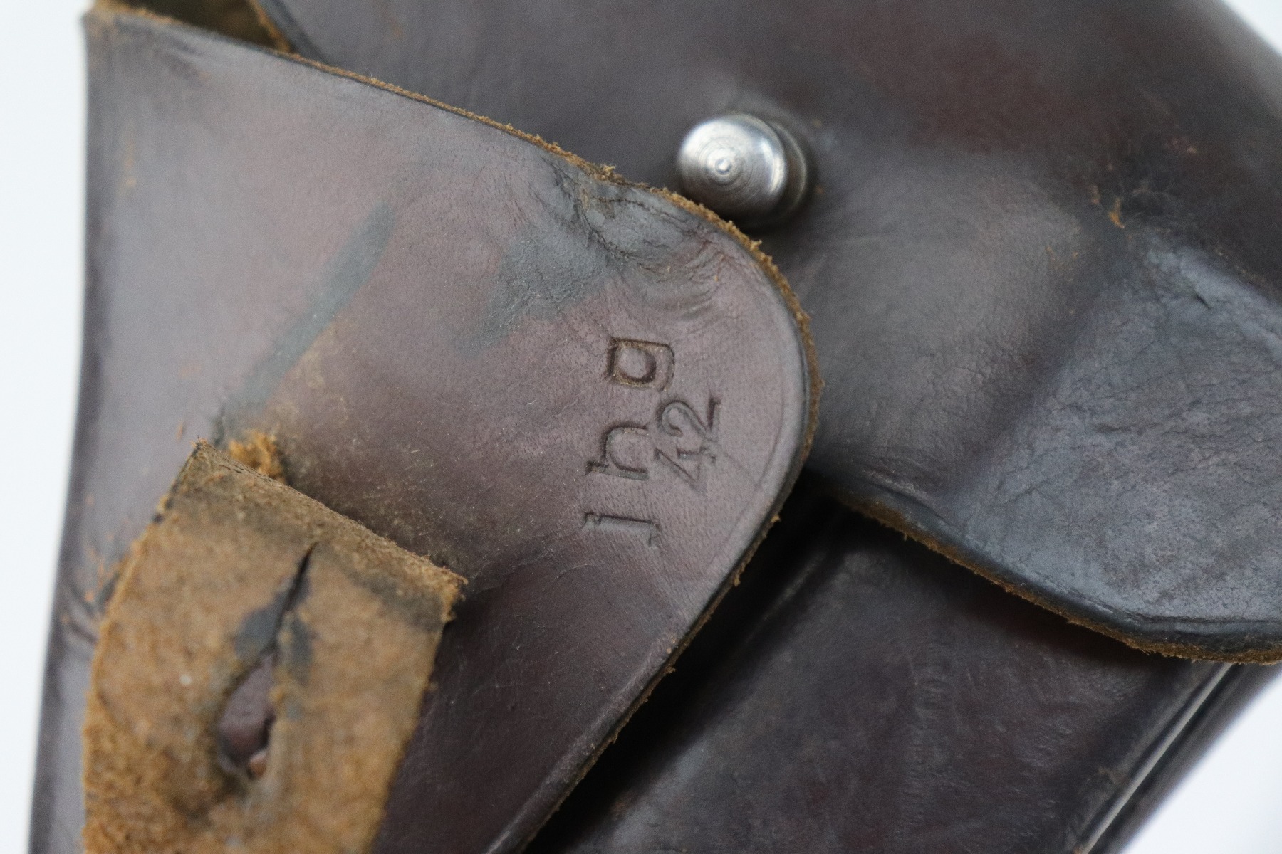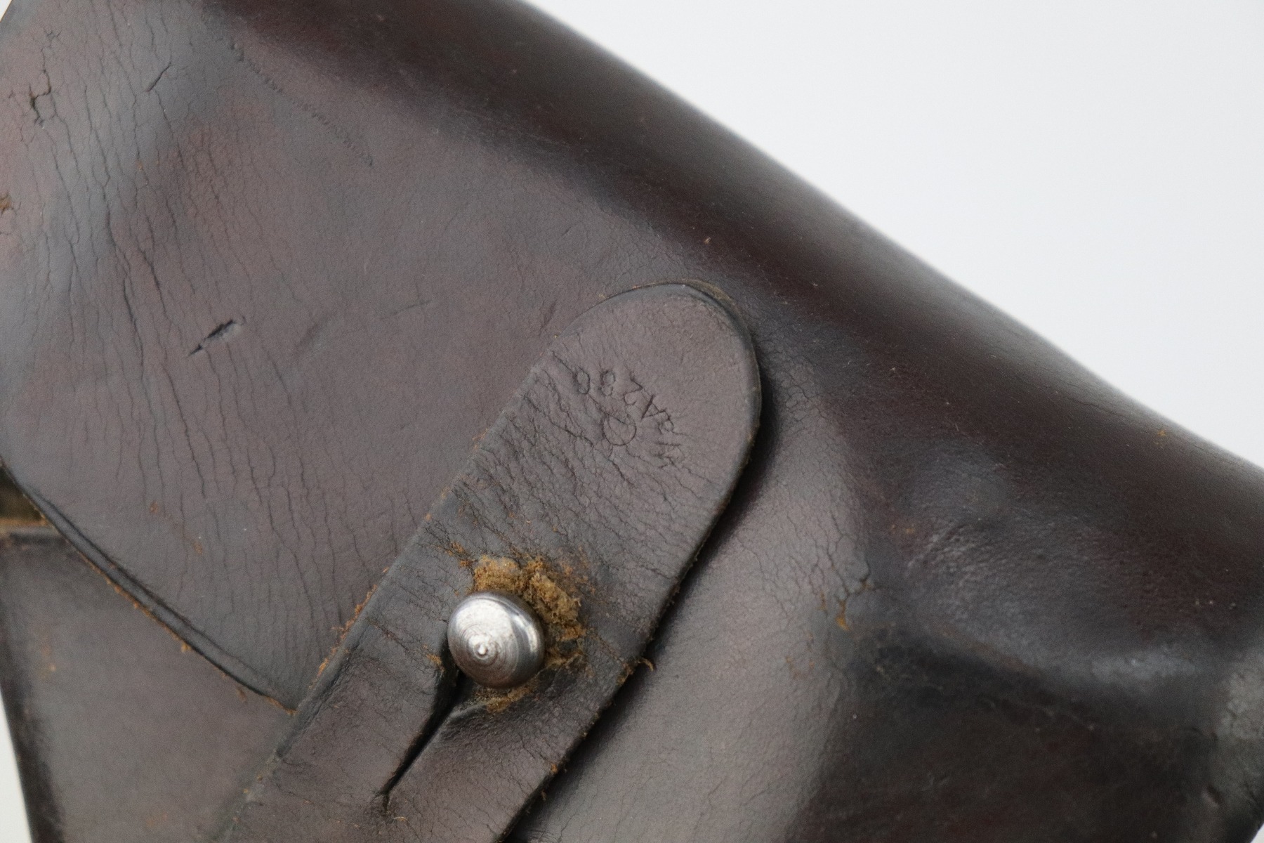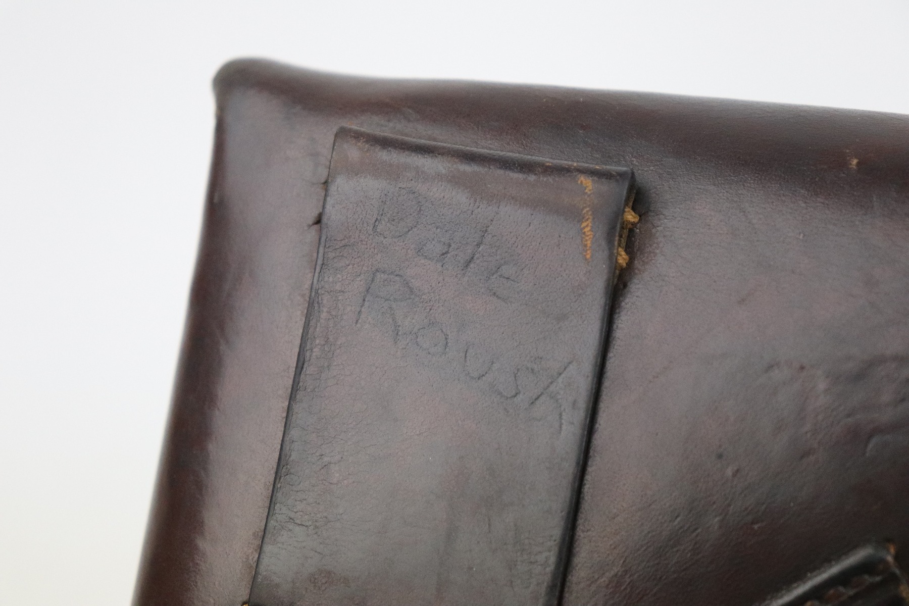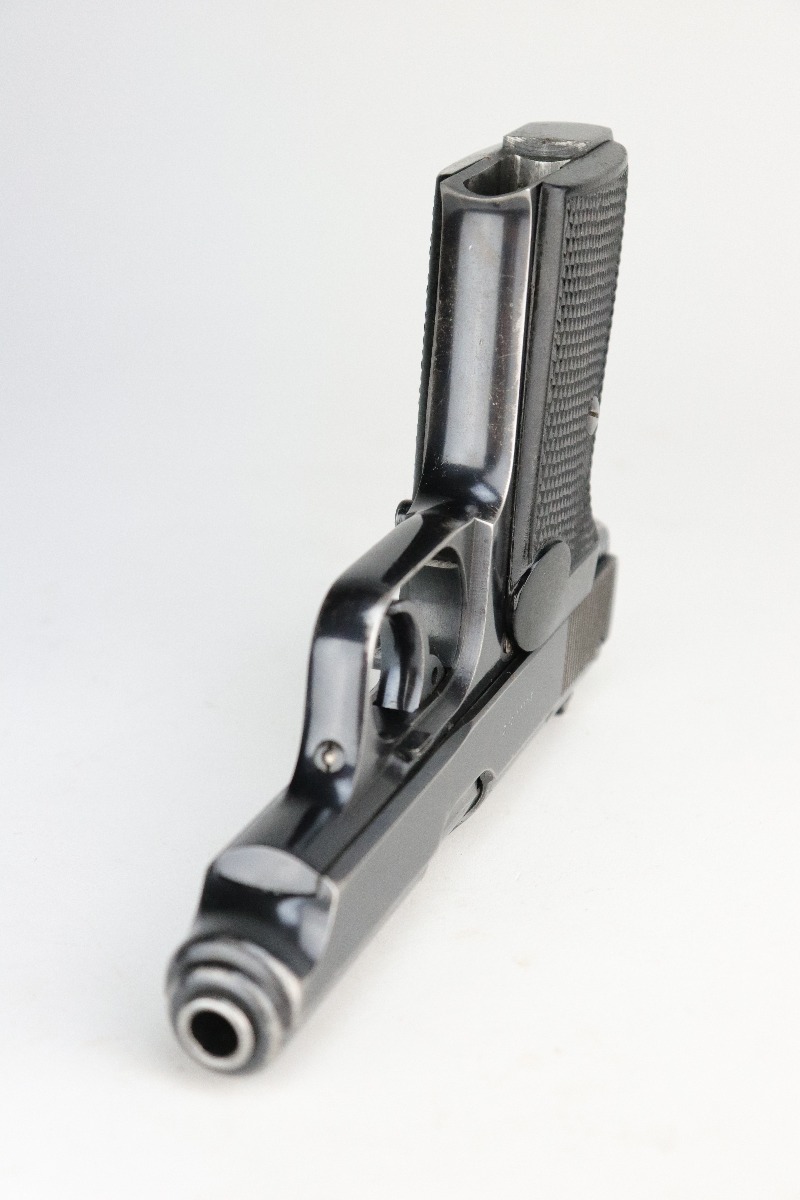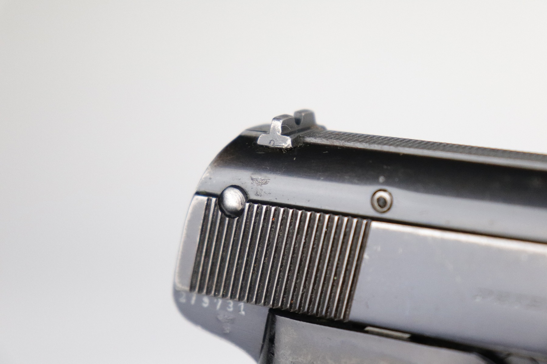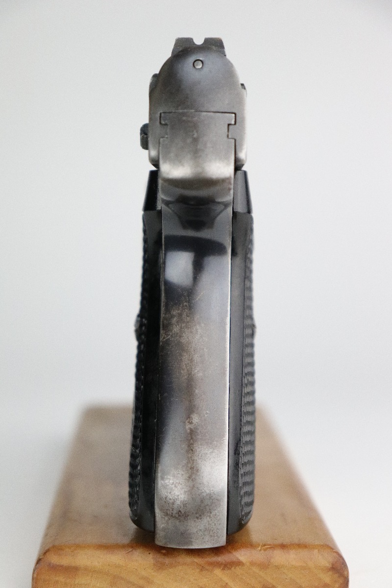 8/14/20 – This is an original Sauer 38h rig issued to the Nazi military in 1940. It is an early production example. The gun comes with a holster and two original, period-correct magazines. The gun has the proper “Eagle 37” Nazi military acceptance proof on the tang. It is in very nice condition overall, retaining about 85% of its original bluing. Generally, there is muzzle and high edge wear. There are also light surface scratches and a few small spots of wear along both sides of the slide. The back strap of the gun is thin and there is spotty wear on the front strap. The bore is minty – shiny with strong rifling. Excellent original grips. The holster is waffenamt and dated 1942. It is generally in very nice condition except that someone etched their name into the back.