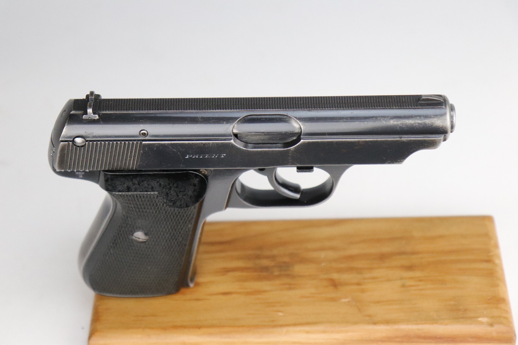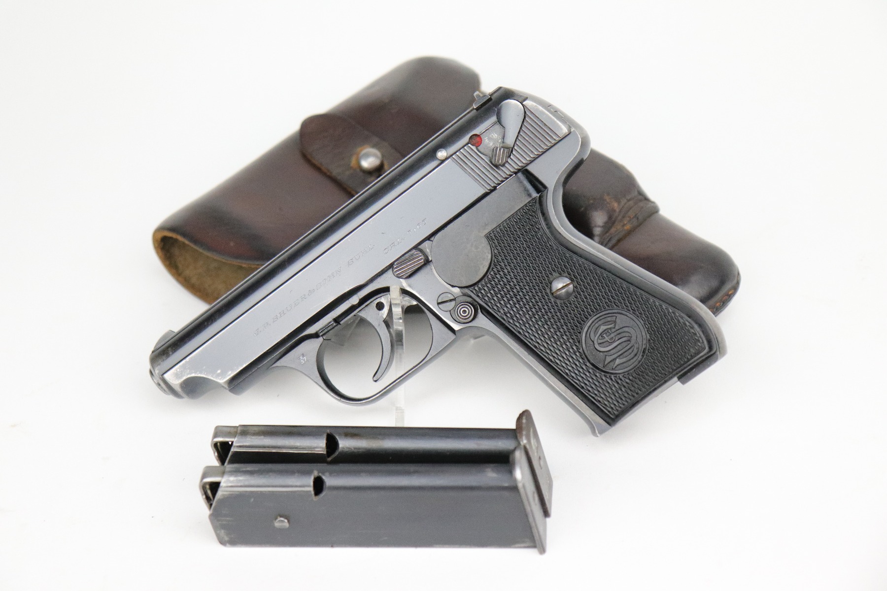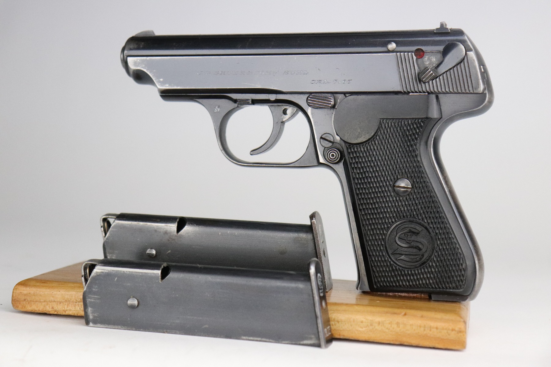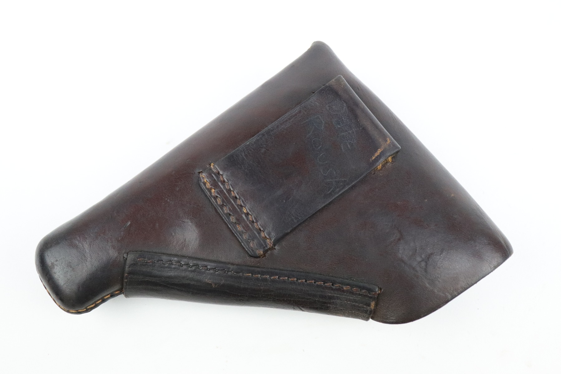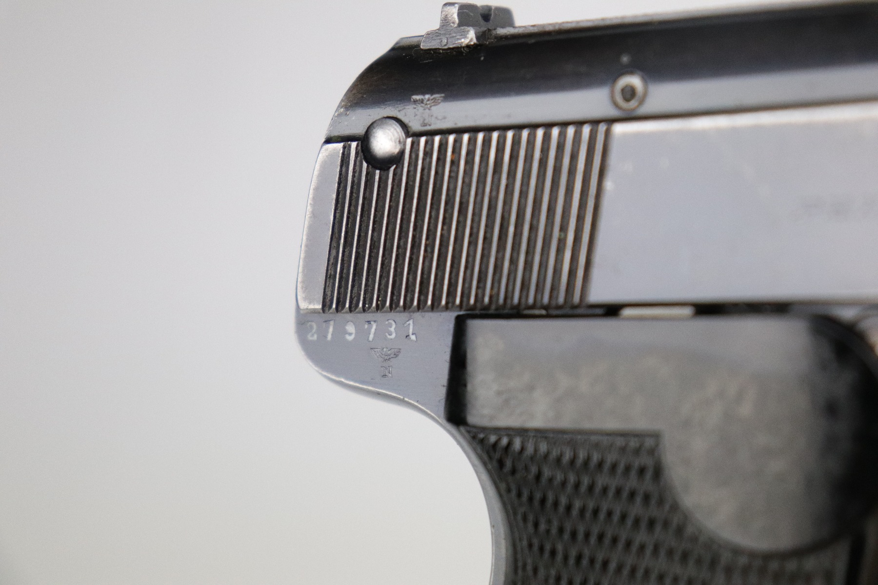 8/14/20 – This is an original Sauer 38h rig issued to the Nazi military in 1940. It is an early production example. The gun comes with a holster and two original, period-correct magazines. The gun has the proper “Eagle 37” Nazi military acceptance proof on the tang. It is in very nice condition overall, retaining about 85% of its original bluing. Generally, there is muzzle and high edge wear. There are also light surface scratches and a few small spots of wear along both sides of the slide. The back strap of the gun is thin and there is spotty wear on the front strap. The bore is minty – shiny with strong rifling. Excellent original grips. The holster is waffenamt and dated 1942. It is generally in very nice condition except that someone etched their name into the back.