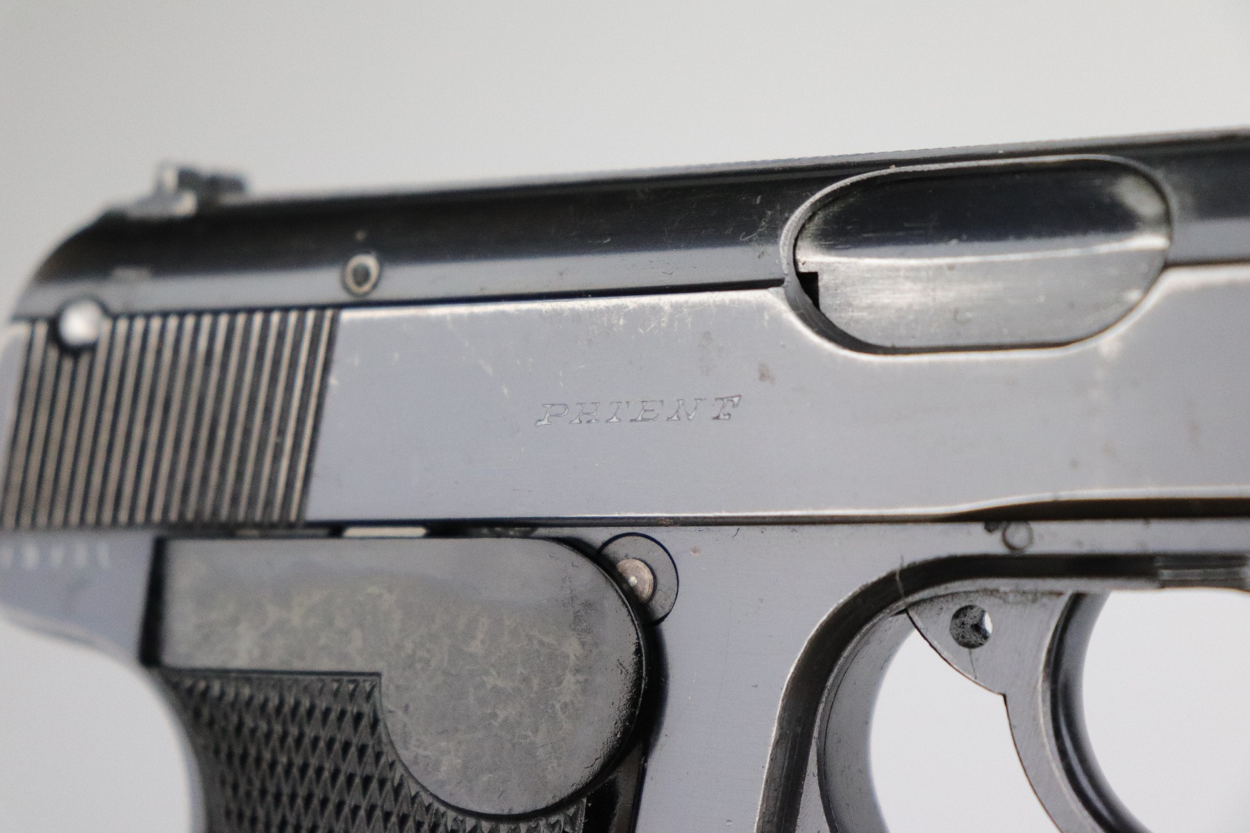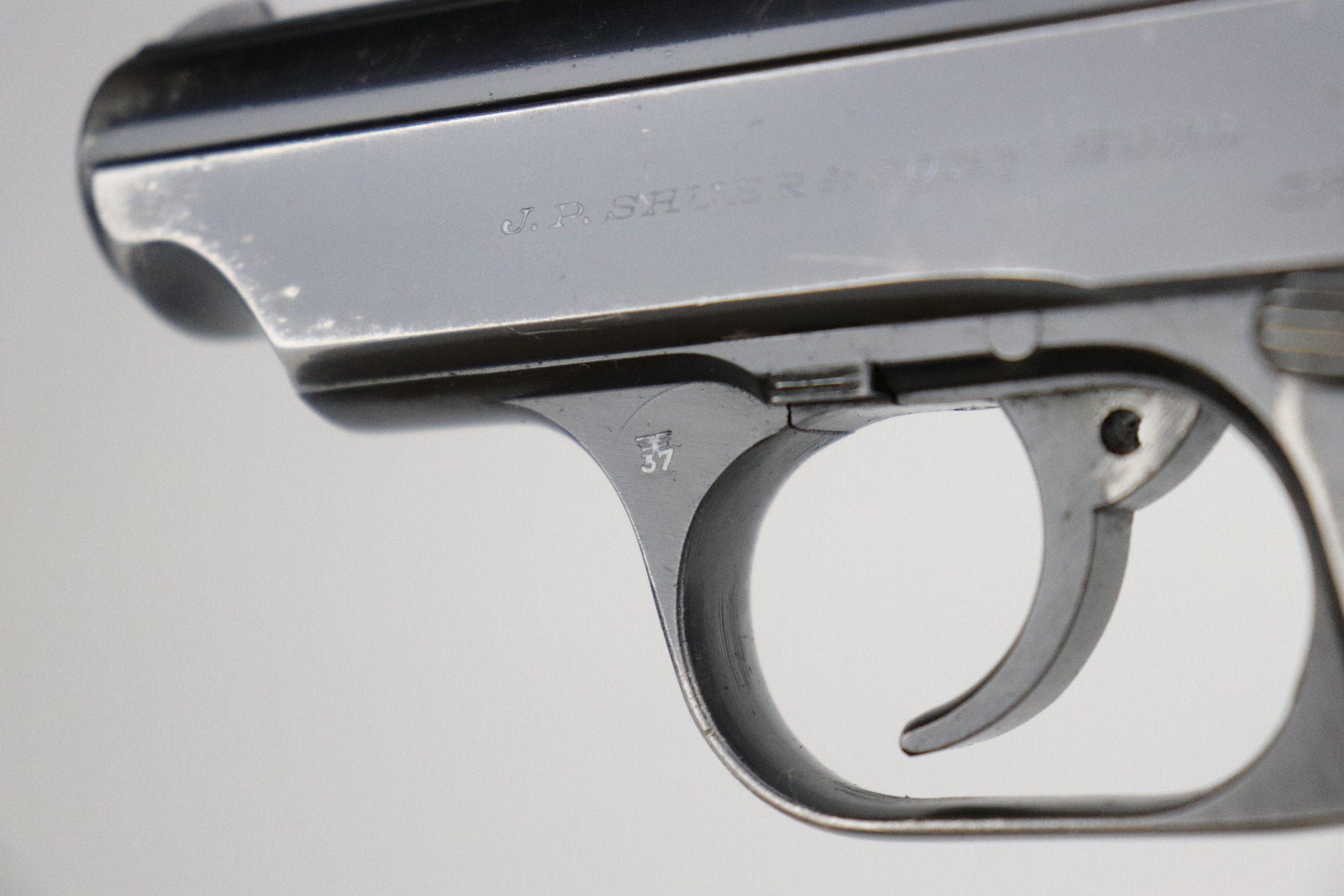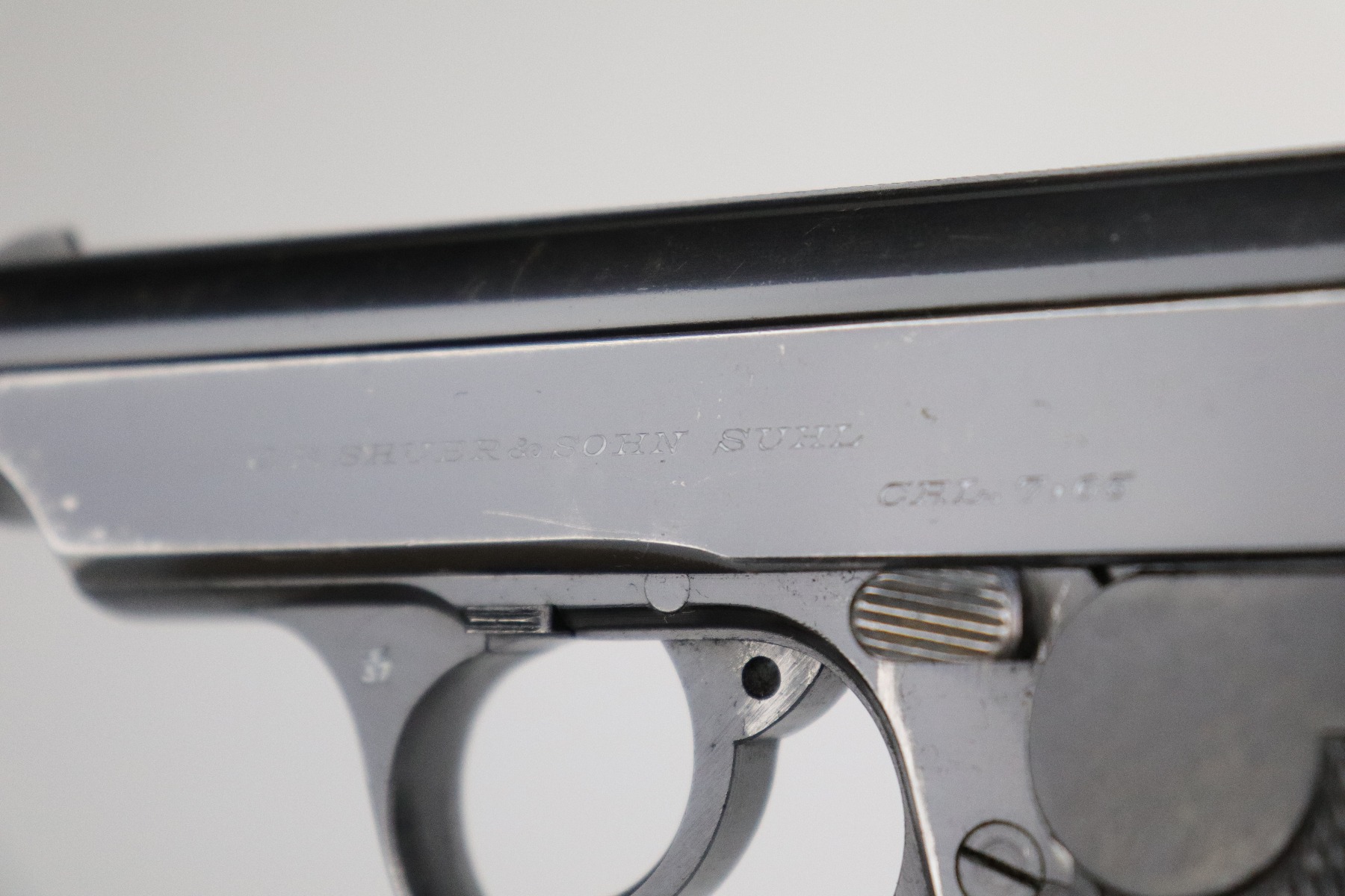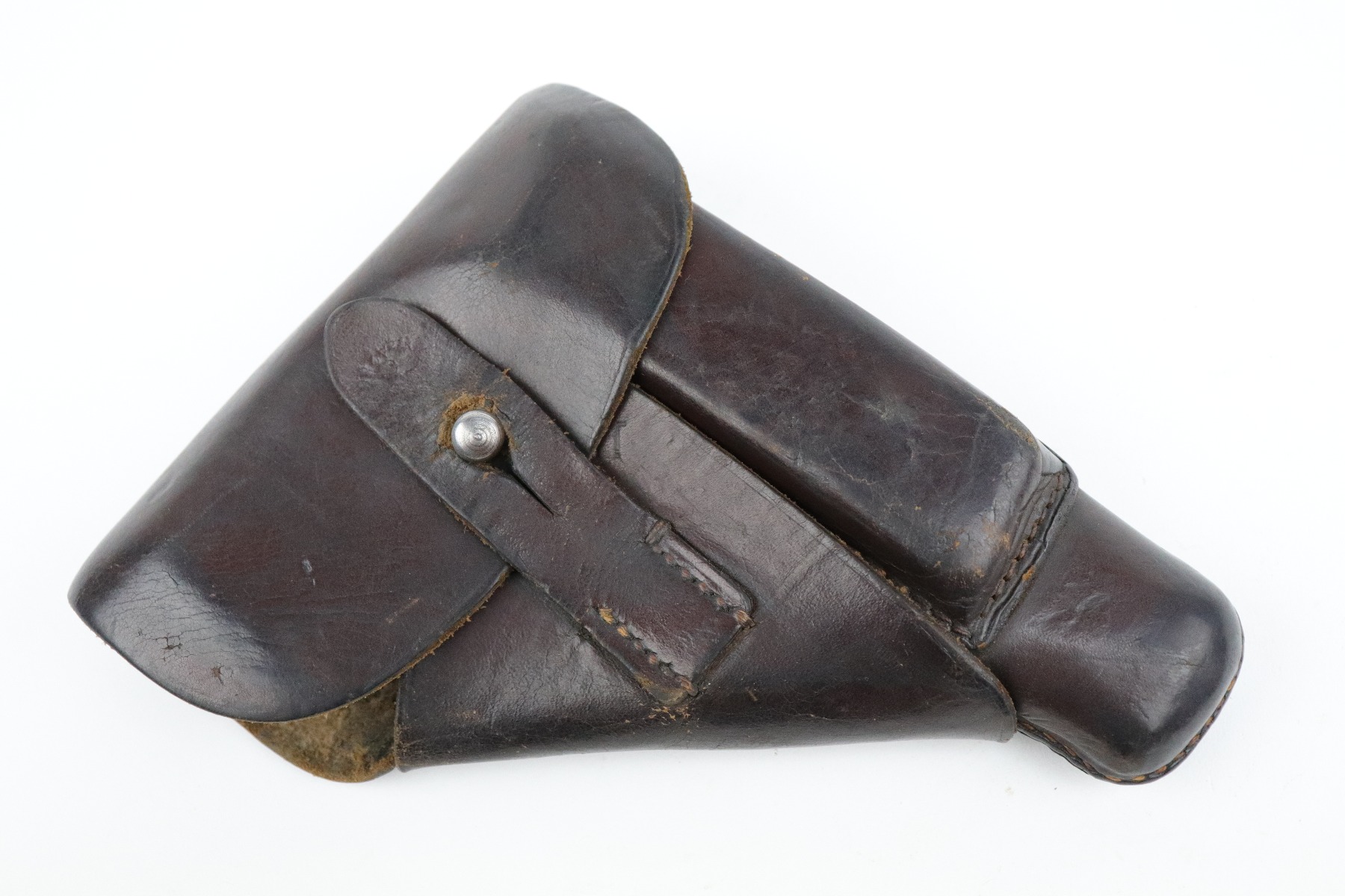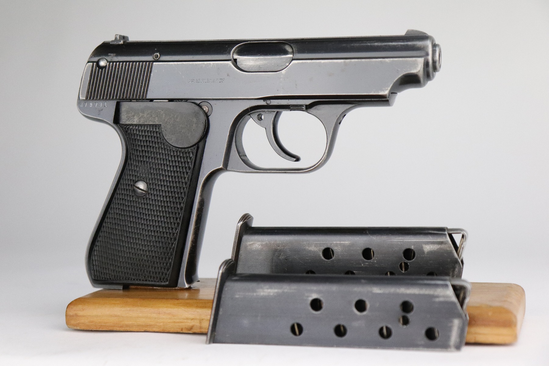 8/14/20 – This is an original Sauer 38h rig issued to the Nazi military in 1940. It is an early production example. The gun comes with a holster and two original, period-correct magazines. The gun has the proper “Eagle 37” Nazi military acceptance proof on the tang. It is in very nice condition overall, retaining about 85% of its original bluing. Generally, there is muzzle and high edge wear. There are also light surface scratches and a few small spots of wear along both sides of the slide. The back strap of the gun is thin and there is spotty wear on the front strap. The bore is minty – shiny with strong rifling. Excellent original grips. The holster is waffenamt and dated 1942. It is generally in very nice condition except that someone etched their name into the back.