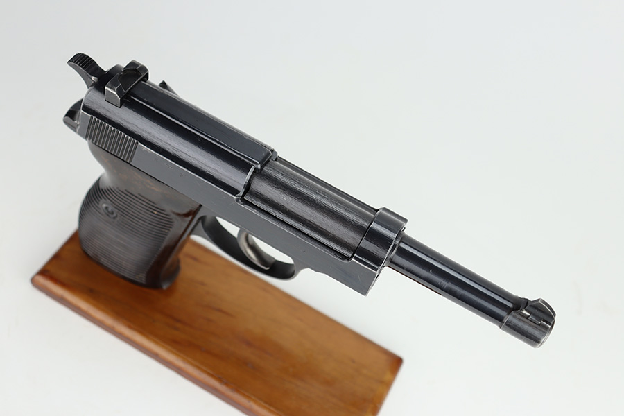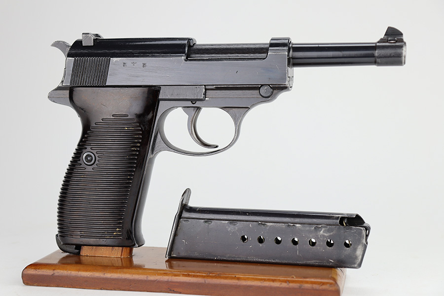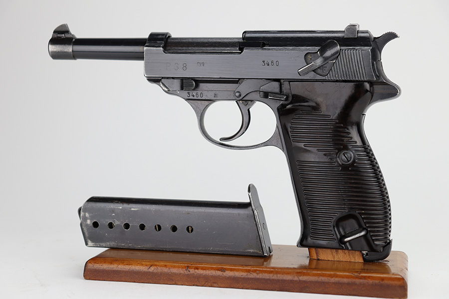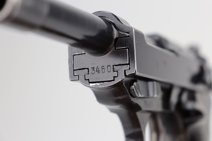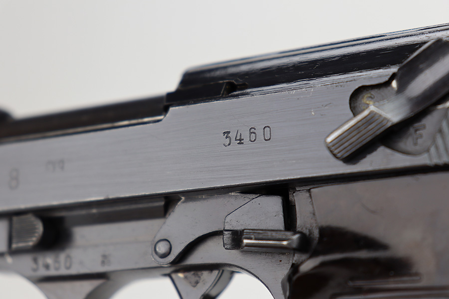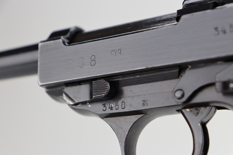 11/13/23 – This is an excellent example of an early Spreewerk P.38 issued to the Nazi military in November of 1942. It has no letter suffix. It is all matching and has the proper “Eagle 88” military proofs. There is an asterisk marking on the barrel, indicating it failed initial inspection and was repaired at the factory – a desirable trait for collectors. It has retained about 96% of its original finish. There is minor thinning on the front strap and wear around the muzzle and on the high edges of the slide. Fitted with blackish-brown bakelite grips. Comes with an early “Eagle 88” marked Spreewerk magazine. Mint bore. De-cocker is functional. The hold-open does not work properly with this magazine.