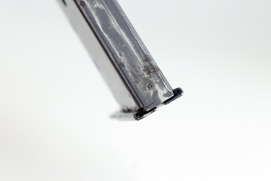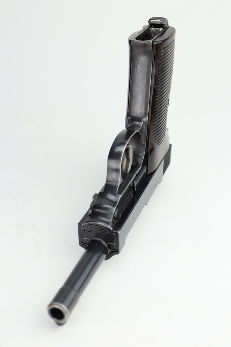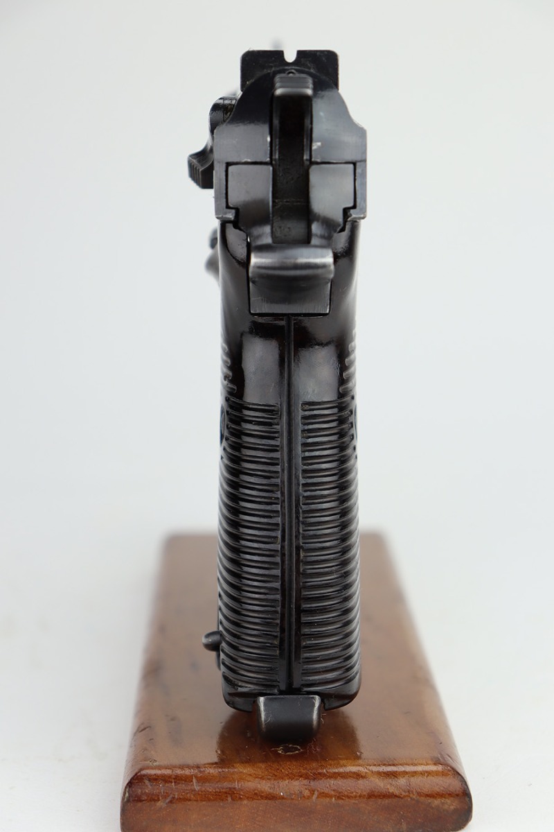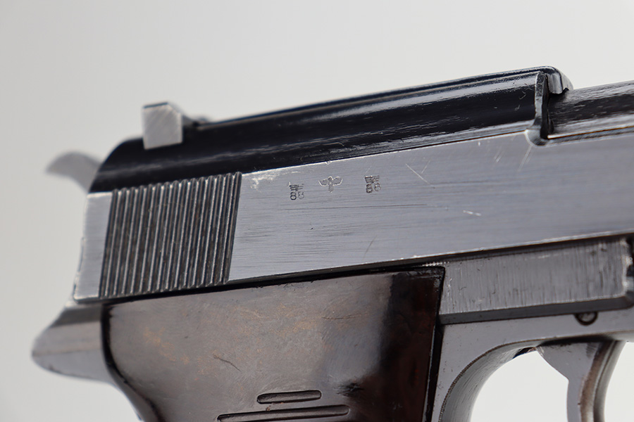 11/13/23 – This is an excellent example of an early Spreewerk P.38 issued to the Nazi military in November of 1942. It has no letter suffix. It is all matching and has the proper “Eagle 88” military proofs. There is an asterisk marking on the barrel, indicating it failed initial inspection and was repaired at the factory – a desirable trait for collectors. It has retained about 96% of its original finish. There is minor thinning on the front strap and wear around the muzzle and on the high edges of the slide. Fitted with blackish-brown bakelite grips. Comes with an early “Eagle 88” marked Spreewerk magazine. Mint bore. De-cocker is functional. The hold-open does not work properly with this magazine.