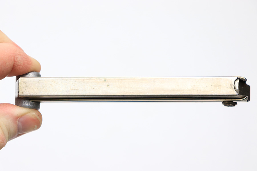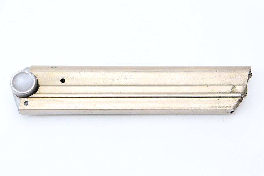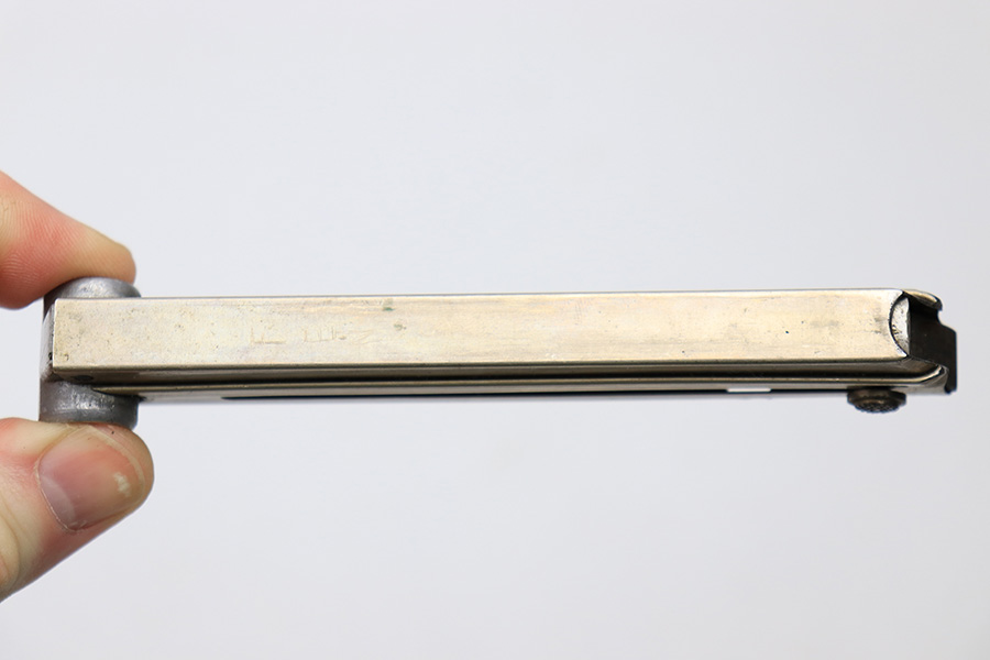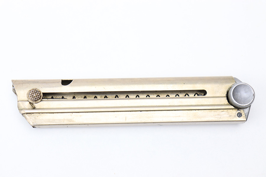 4/1/22 – This is a very interesting and somewhat unique magazine. We think this is an extremely rare variation, early WW2 production magazine as there are no markings or stamps on neither the tube nor base. This is typically found on later wartime production magazines, but this magazine has an earlier nickel finish. The aluminum base shows nice, uniformly circular ears that show no signs of alteration. The base also is still rounded and has no scratches or dings that would indicate alteration. Our conclusion is this magazine was never stamped, proofed, or numbered. Overall the condition is excellent with a fully functional spring. A very rare find.