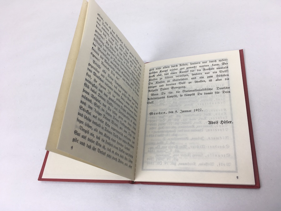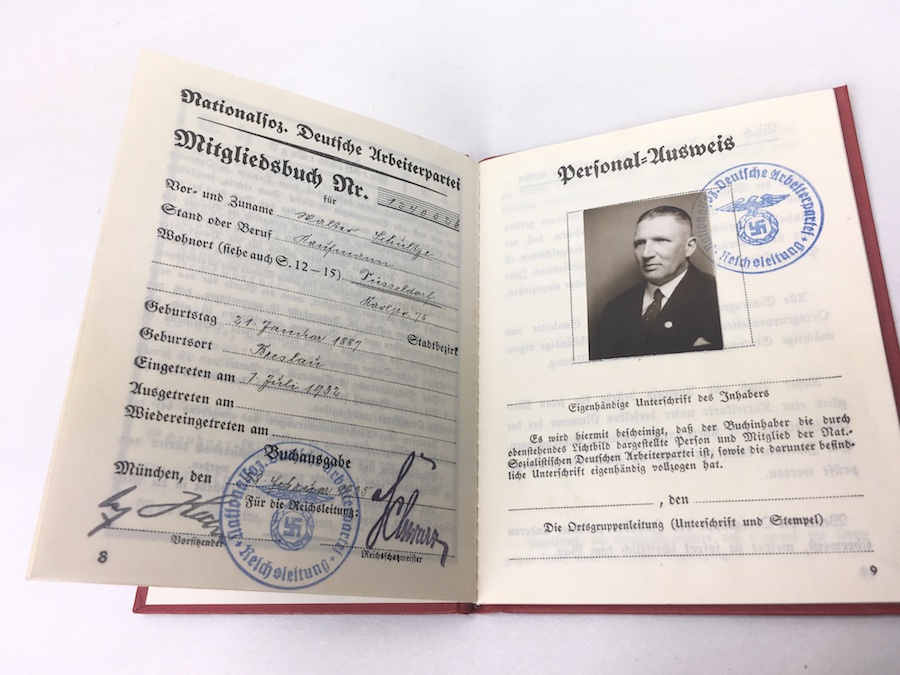 5/26/19 – Authentic & mint, early party leader i.d. book for member #1240526. Forward written by Adolf Hitler prior to coming into power. Hard back book measures 5-1/4″ x 4-1/4″. Consists of 48 perfectly preserved pages. There are no entries and has no dues stamps. Just a photo of the owner with his personal information. It is unsigned, so it may have never been issued. These early books are becoming hard to find. Nice collector piece and a rare variation!