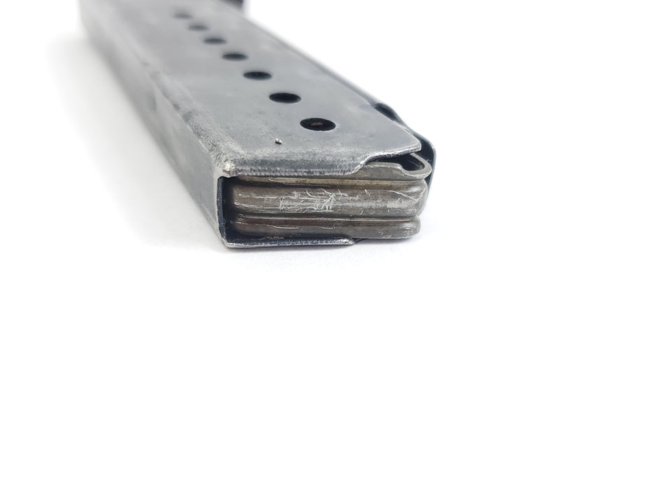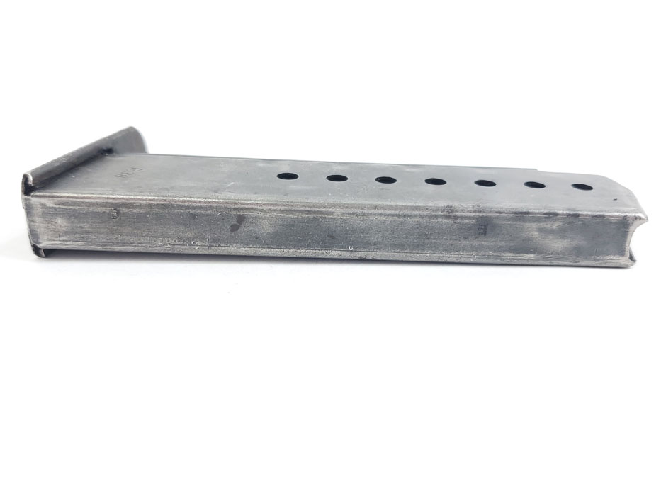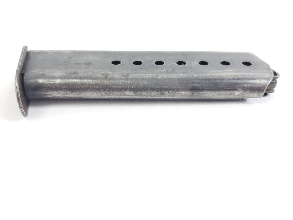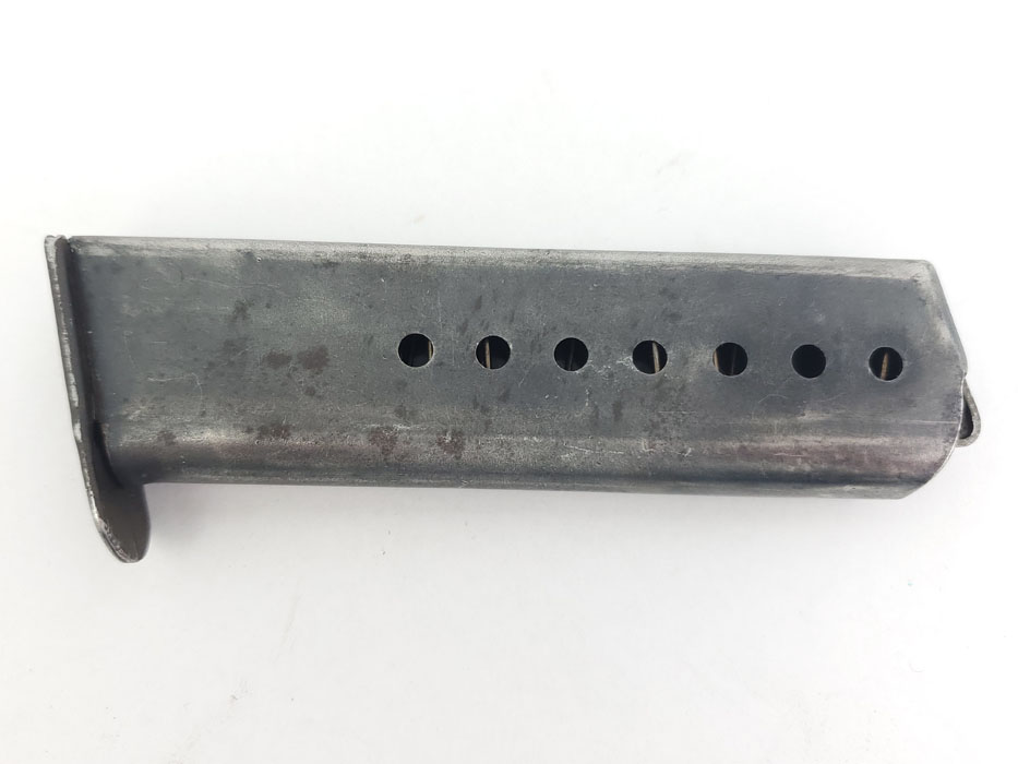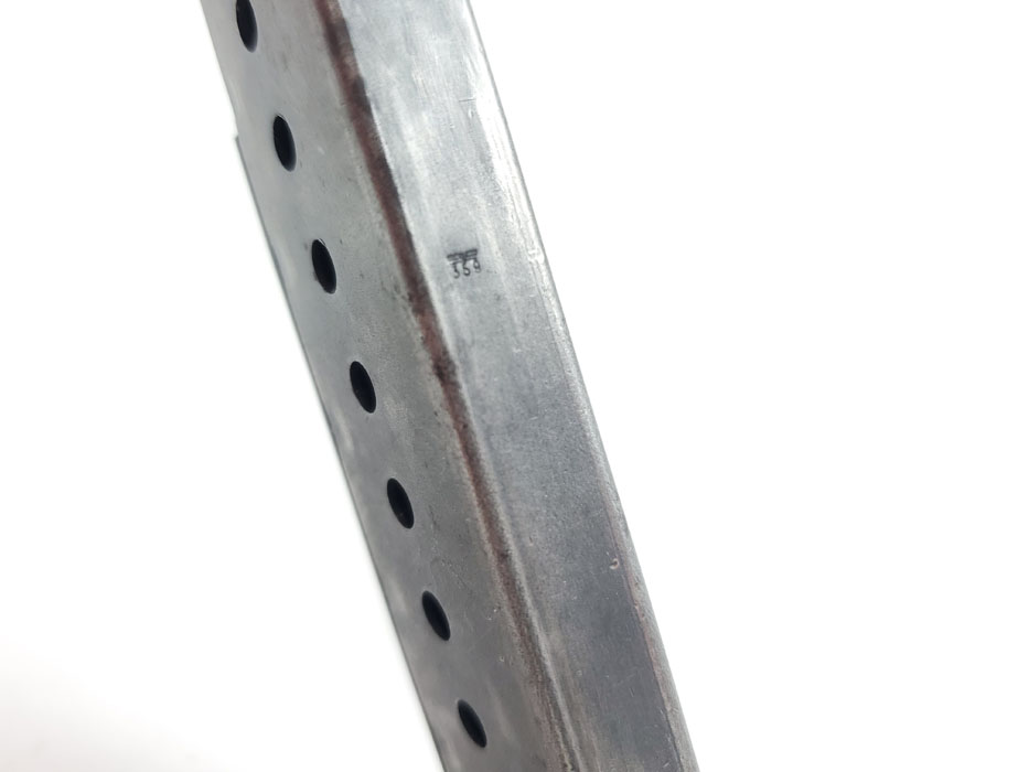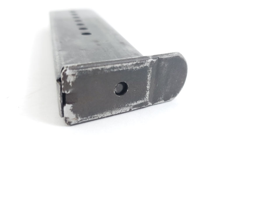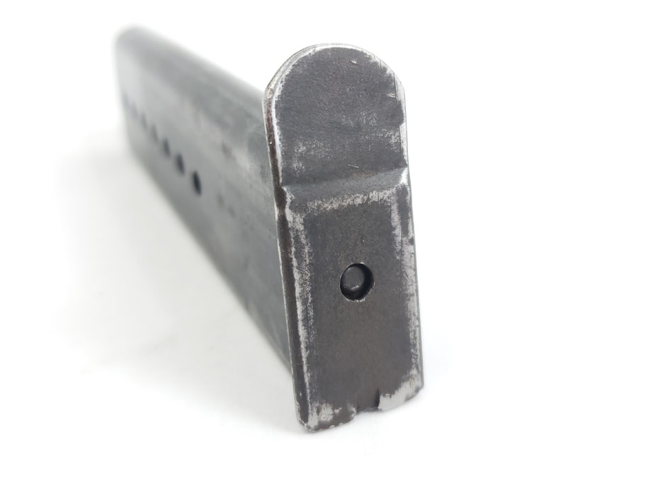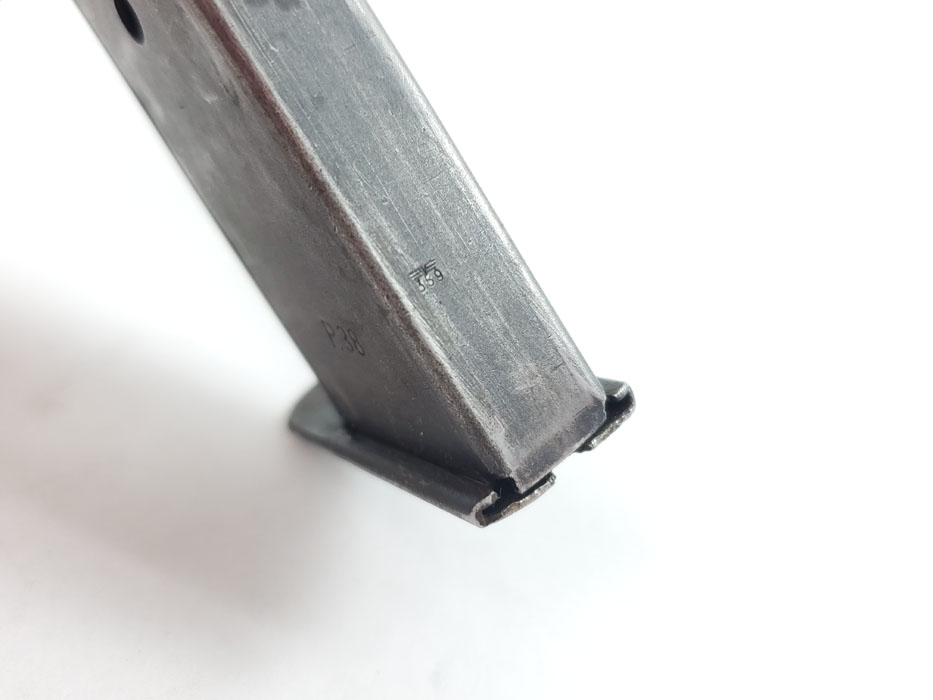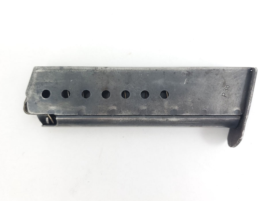 5/22/20 – This is an original, early style P.38 magazine that has a replaced follower and base plate. The magazine tube is stamped P.38 on the side, and has two eagle/359 military proof stamps. These are two early features. The follower is a later / end of war style known as a “ribbed” follower. The base plate is slightly loose and has some minor play. The finish on the tube is mostly gone, but there is not any serious rust or pitting. Still functions fine with a strong spring.