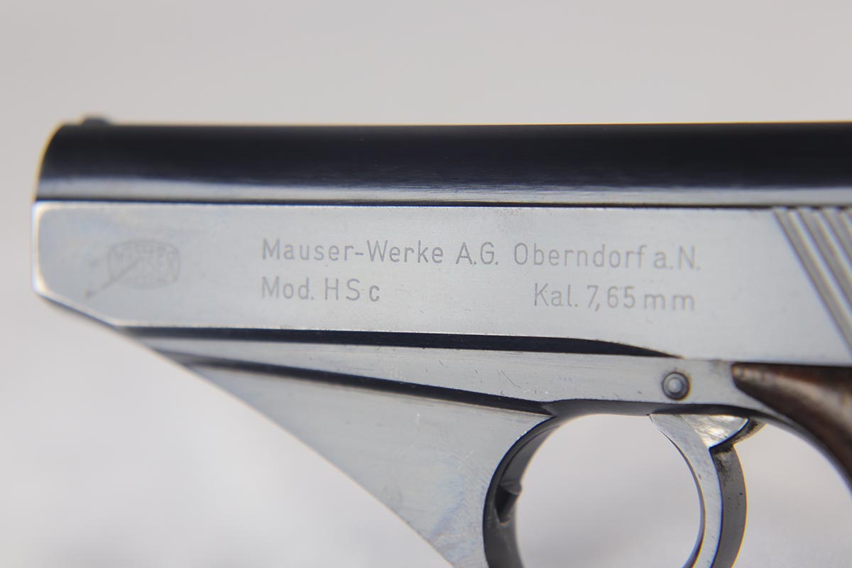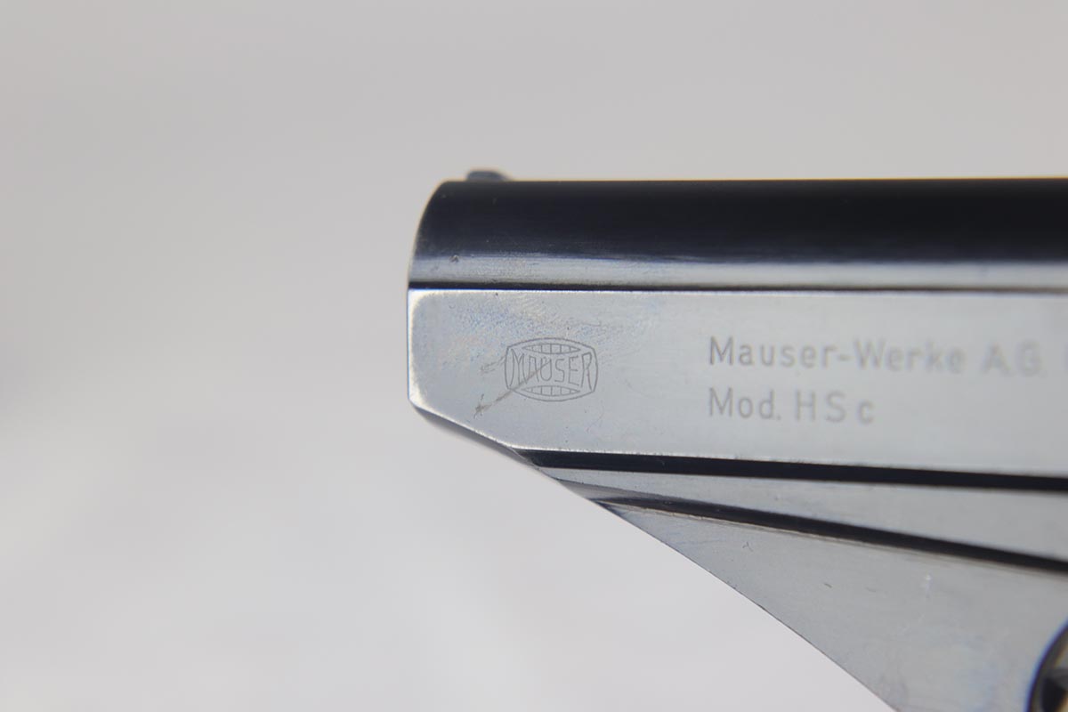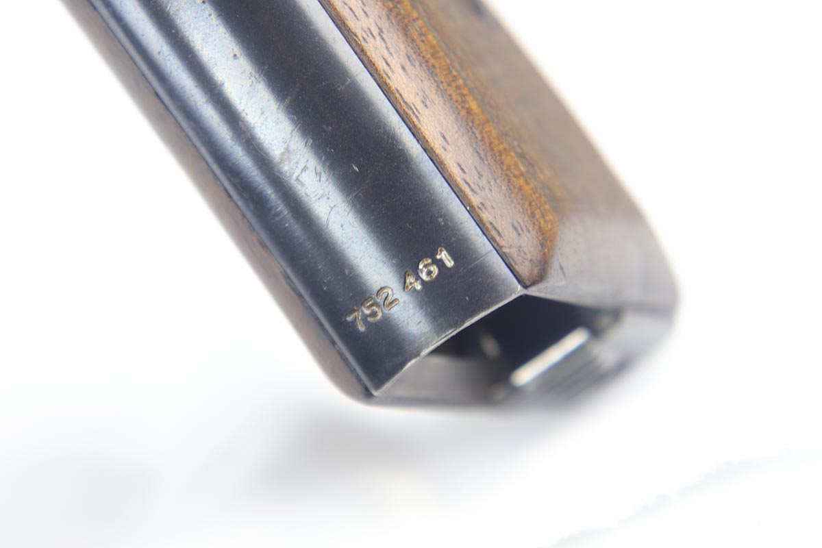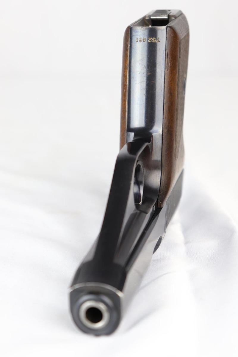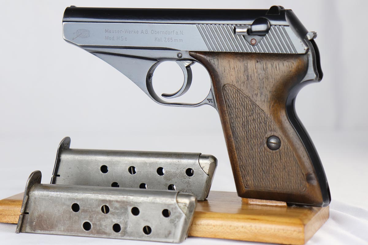 10/2/18 – This is an excellent, complete Police Mauser HSc rig from 1941. It has a gorgeous, original high-polish finish rating at about 97% with minor muzzle wear and a minor scuff marks on the front strap. Frame is Eagle/L marked. Terrific bore. Pistol comes with two original magazines – one is blank bottom, other is Mauser banner. 1942 dated Berlin police style holster is correct for the pistol. It shows scuffs and wear throughout but no holes or tears.