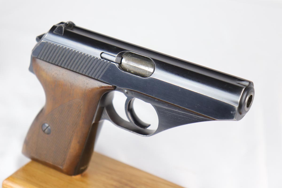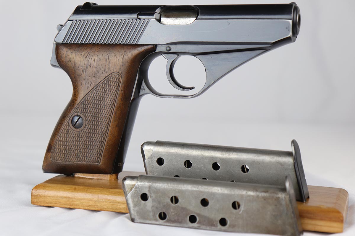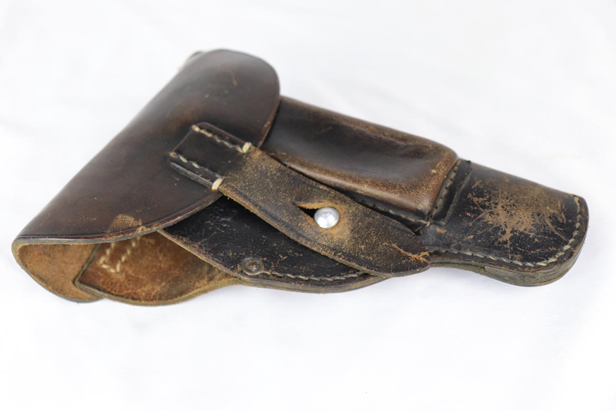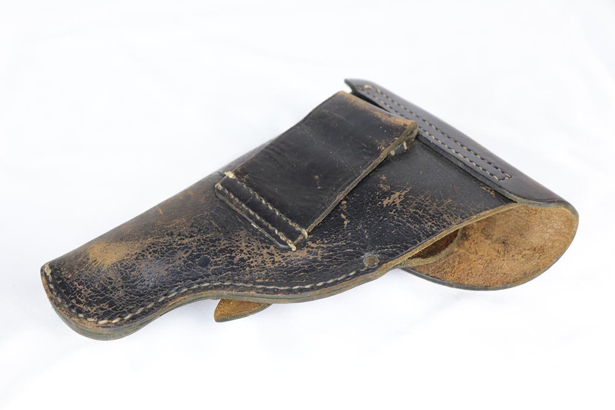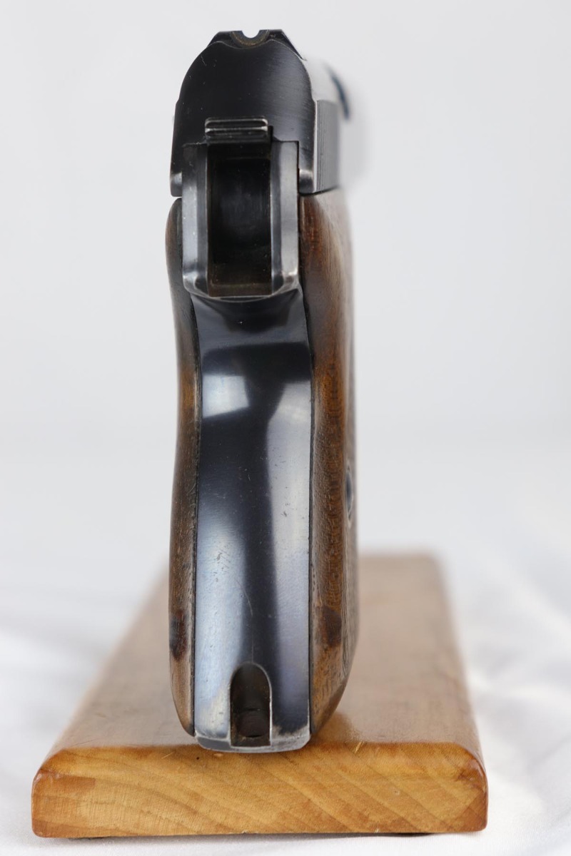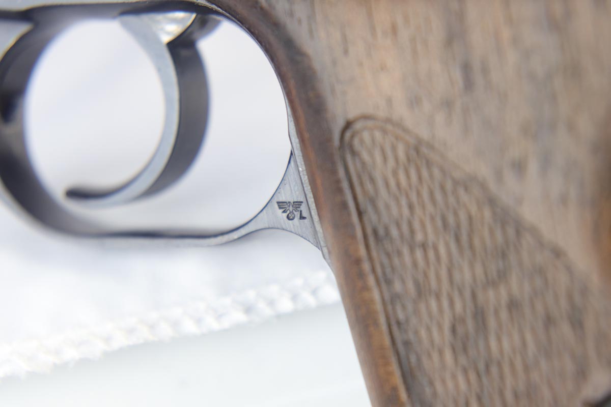 10/2/18 – This is an excellent, complete Police Mauser HSc rig from 1941. It has a gorgeous, original high-polish finish rating at about 97% with minor muzzle wear and a minor scuff marks on the front strap. Frame is Eagle/L marked. Terrific bore. Pistol comes with two original magazines – one is blank bottom, other is Mauser banner. 1942 dated Berlin police style holster is correct for the pistol. It shows scuffs and wear throughout but no holes or tears.