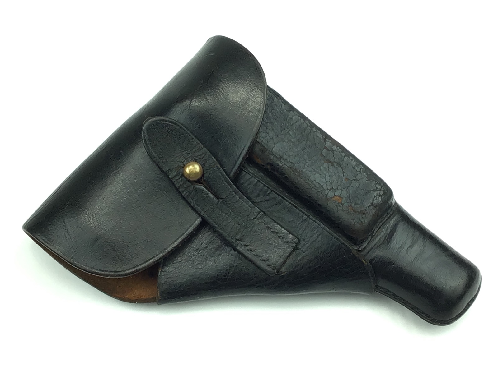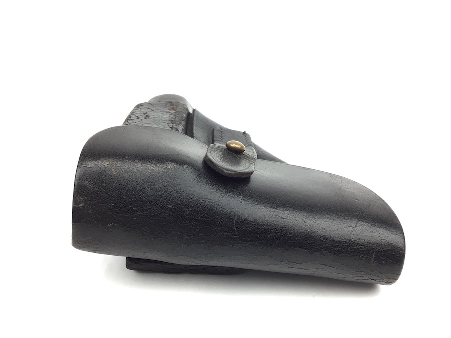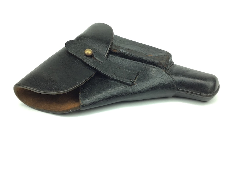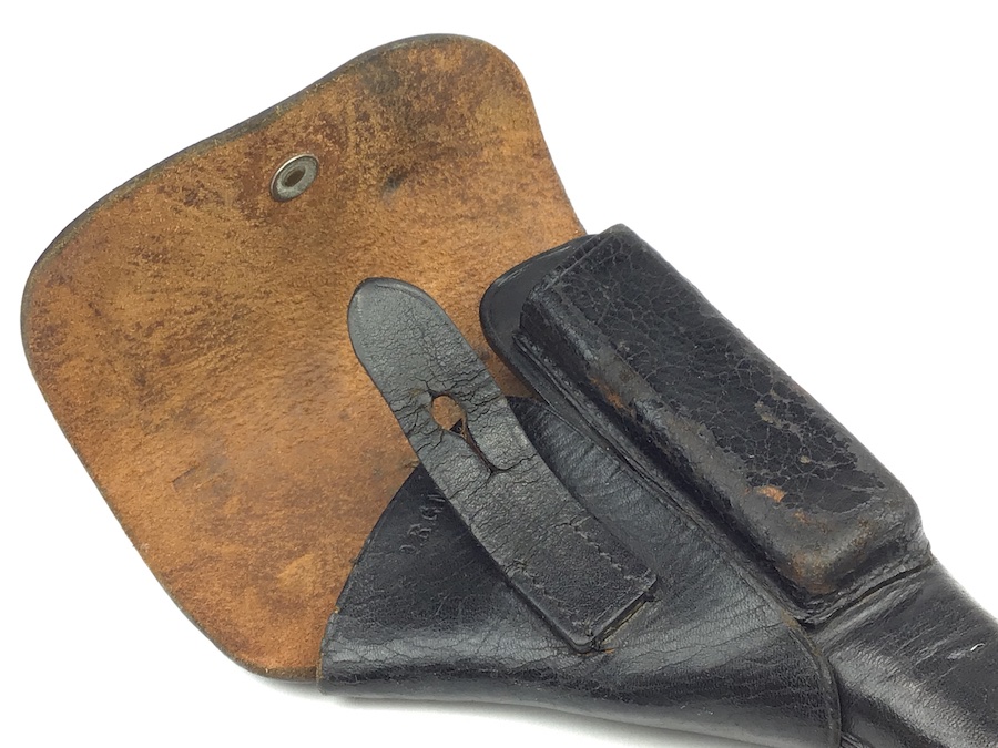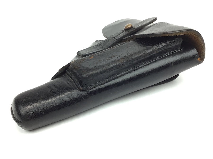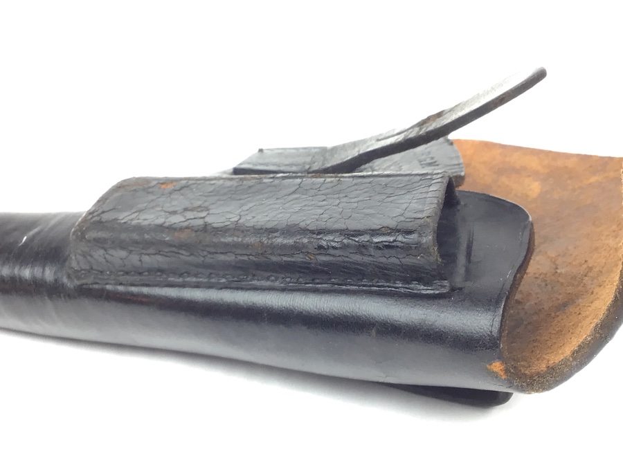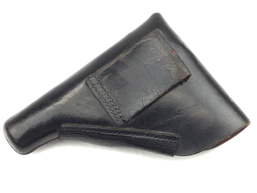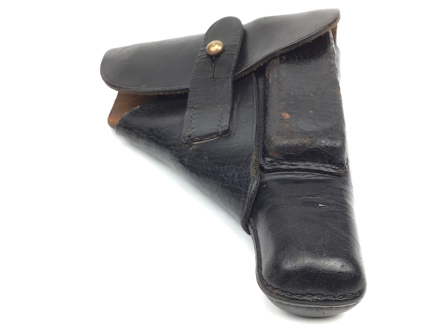 11/23/20 – This is a holster for a Walther PPK. It is an early version of the holster with a brass closure stud. This particular example is in very good condition with minor surface cracking on the magazine pouch. Strong, clean leather and stitching. All stitching in tact. AKAH maker stamped under the closure strap.