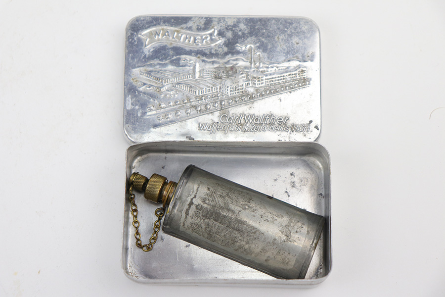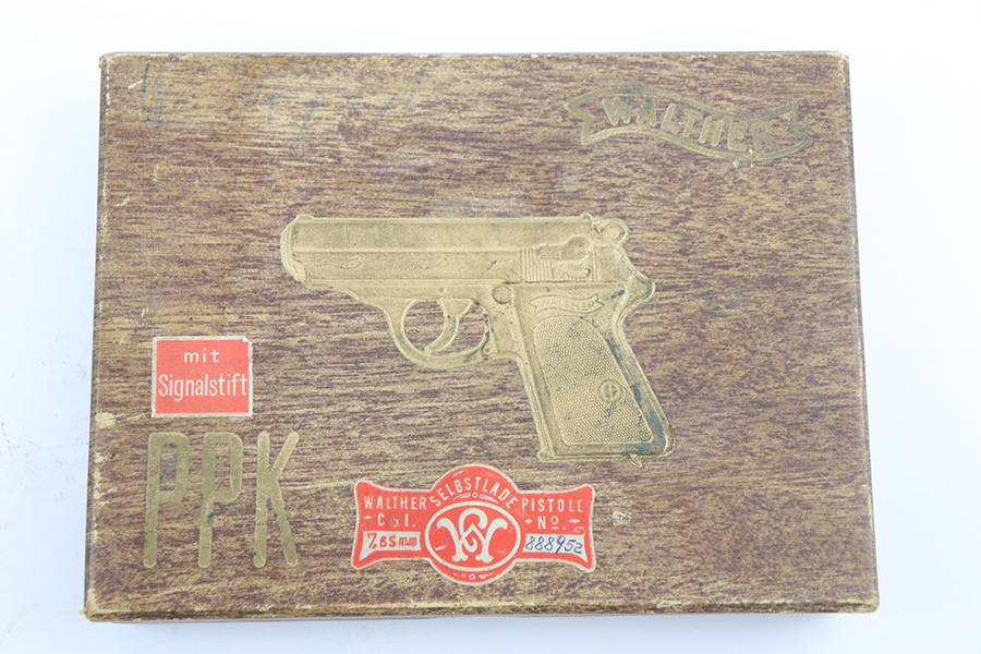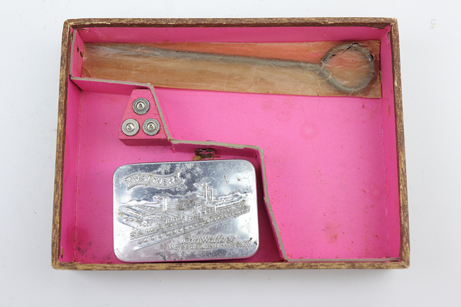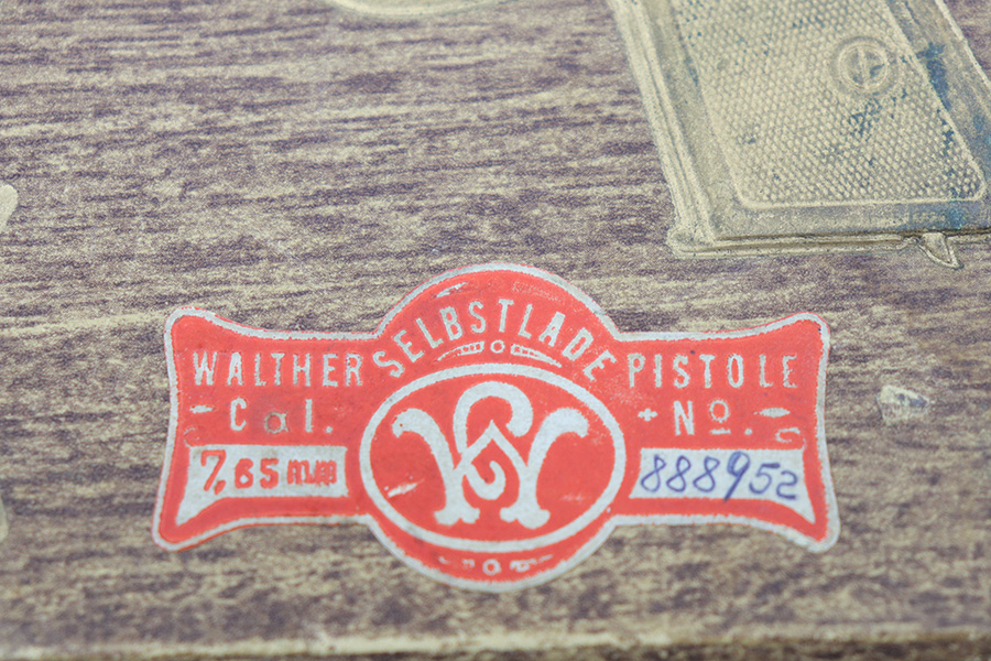 8/30/21 – This is an original PPK box from 1934-1936. The box features a correct red “bowtie” label and shows the handwritten serial “888925”. The box is in very good condition overall. All corners are intact and the pink interior is excellent. The box also comes with the original cleaning rod, original cleaning tin and 3 dummy rounds. The tin contains an oiler that we have not seen before. This is one of the nicest original boxes we have ever offered.