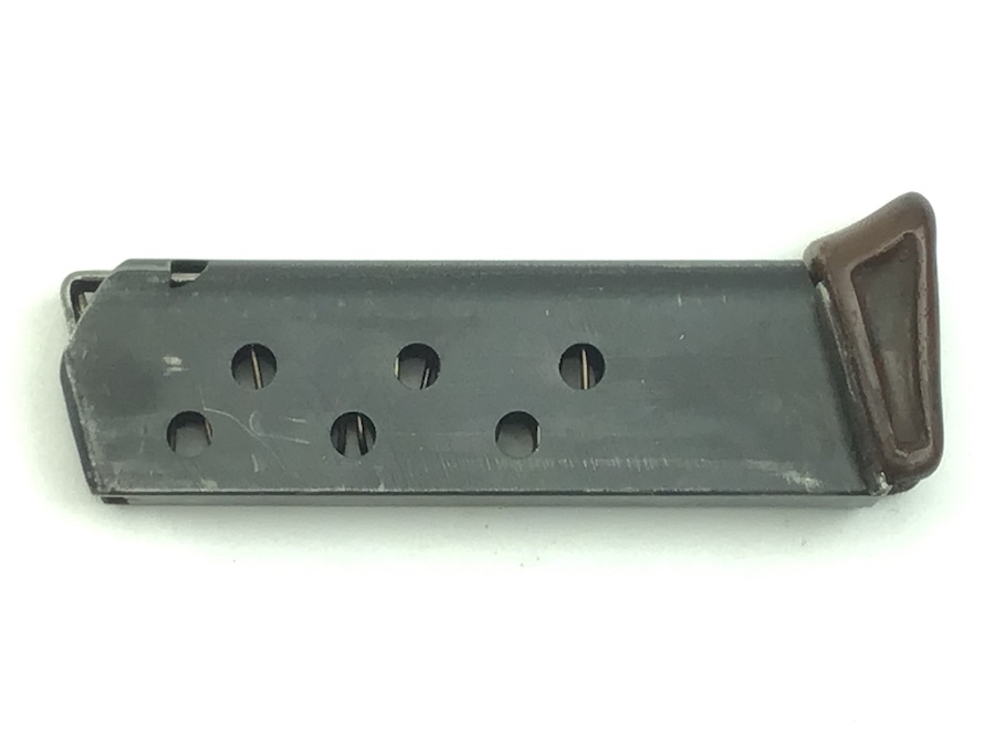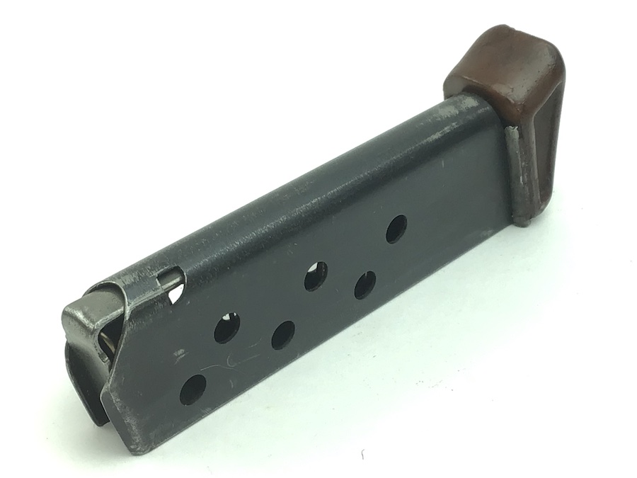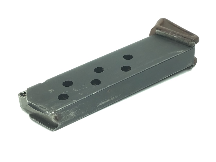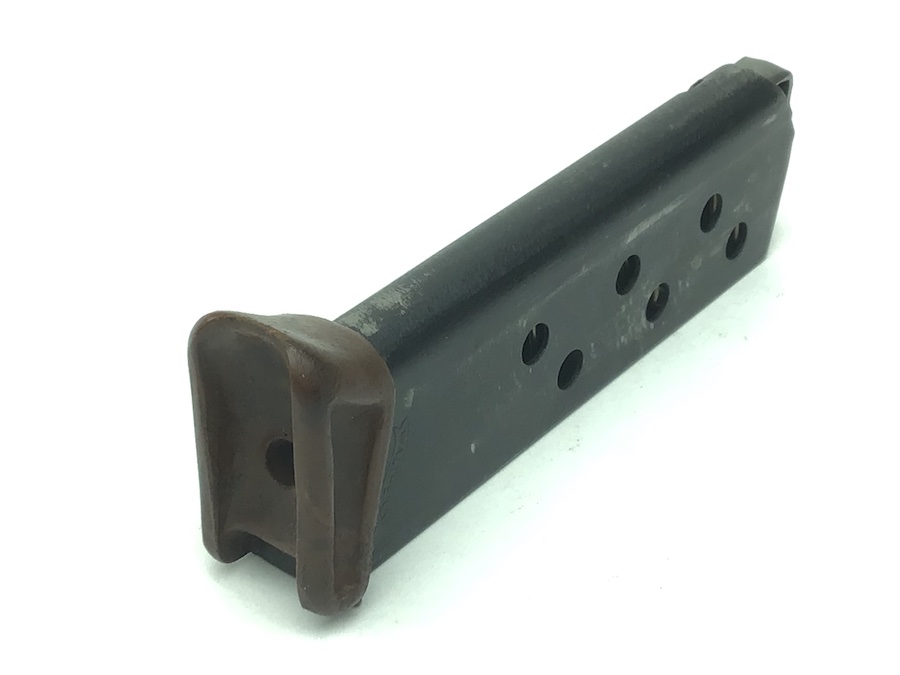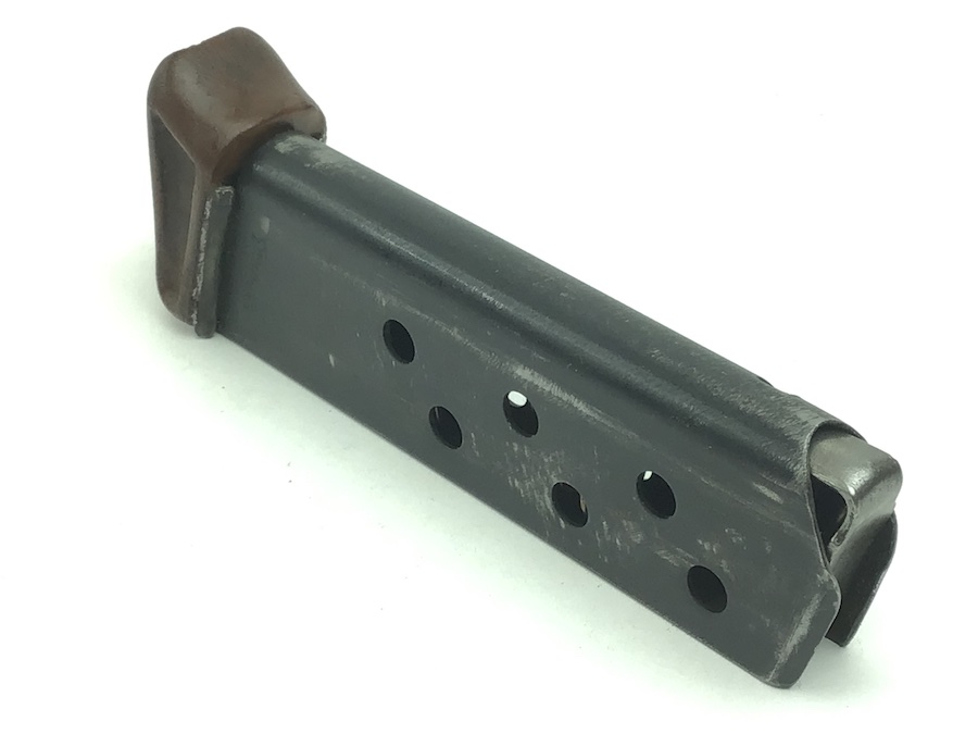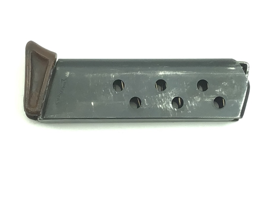 12/17/21 – This is a great, early / pre WW2 manufactured Walther PPK magazine. The magazine may be transitional as the finish is dull bluing instead of the normal high polish. Walther banner only stamped on one side. The brown finger extension has flat brown color with no chips or cracks. This is the early thin-lip style. Fully functional, strong spring.