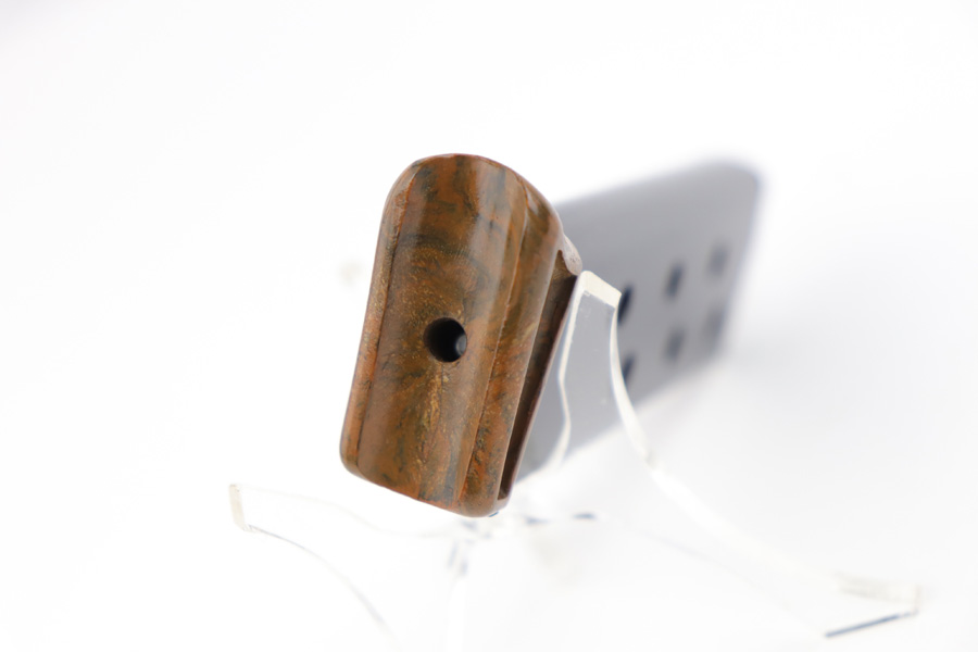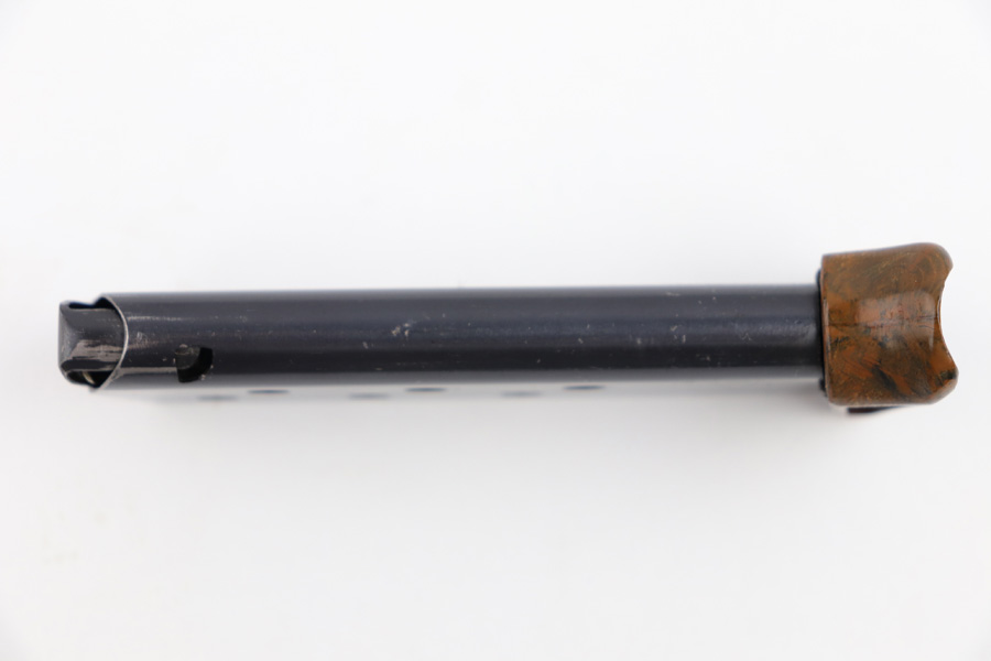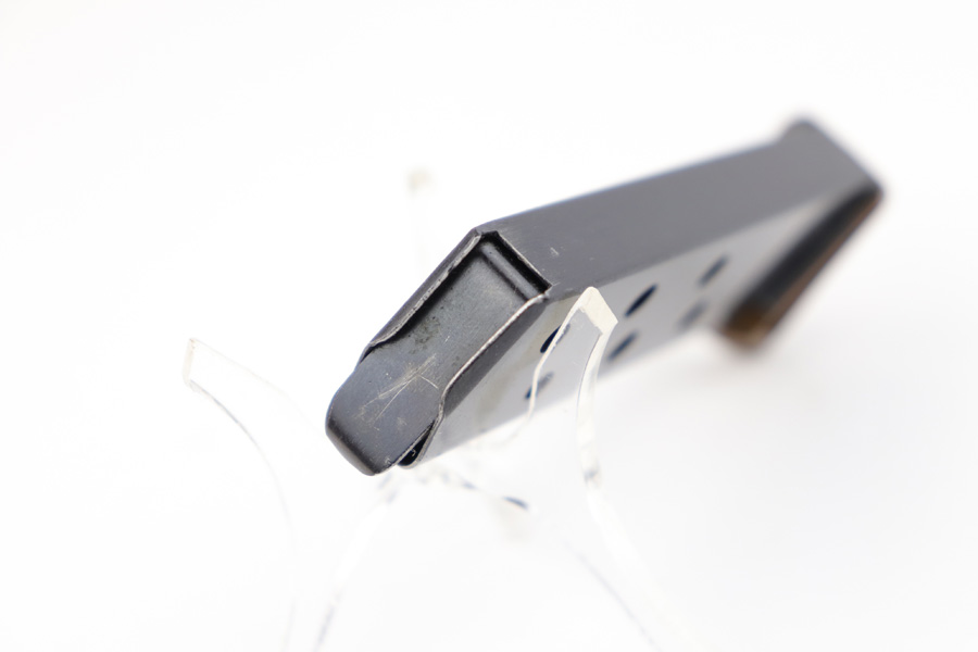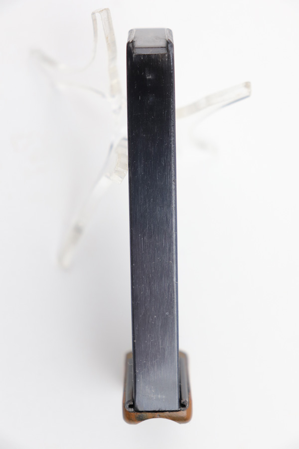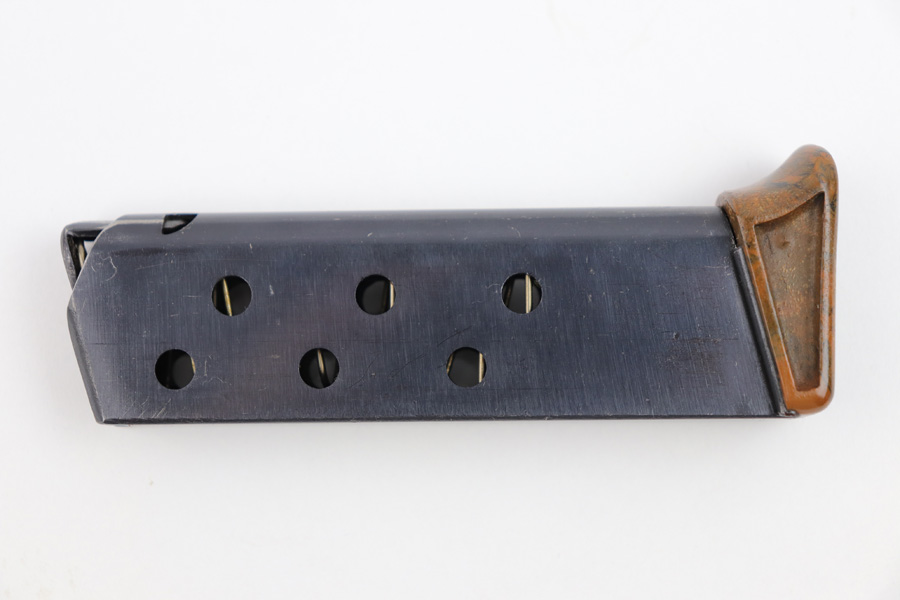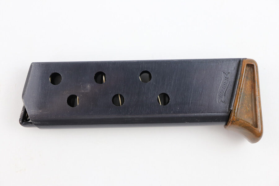 7/31/19 – This is an excellent, early / pre WW2 manufactured Walther PPK magazine. The magazine has a high polish finish with a Walther banner stamped on one side. The brown bakelite finger extension has no cracks or issues, and an early no-lip style. Fully functional, strong spring.
