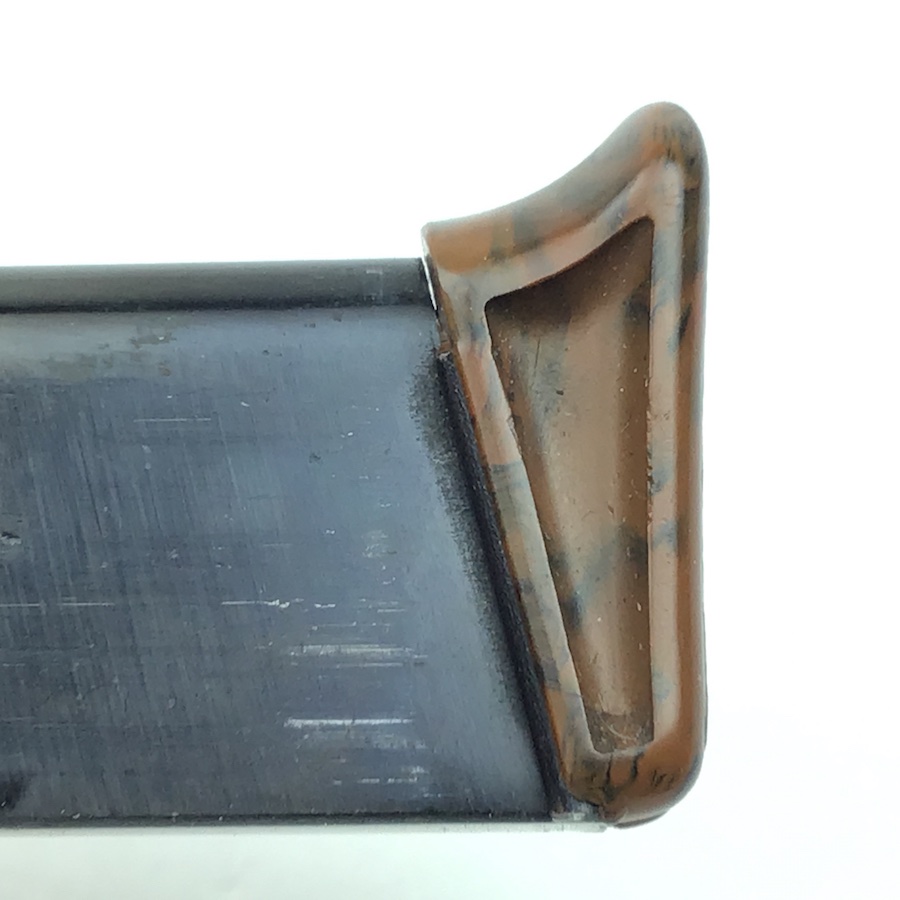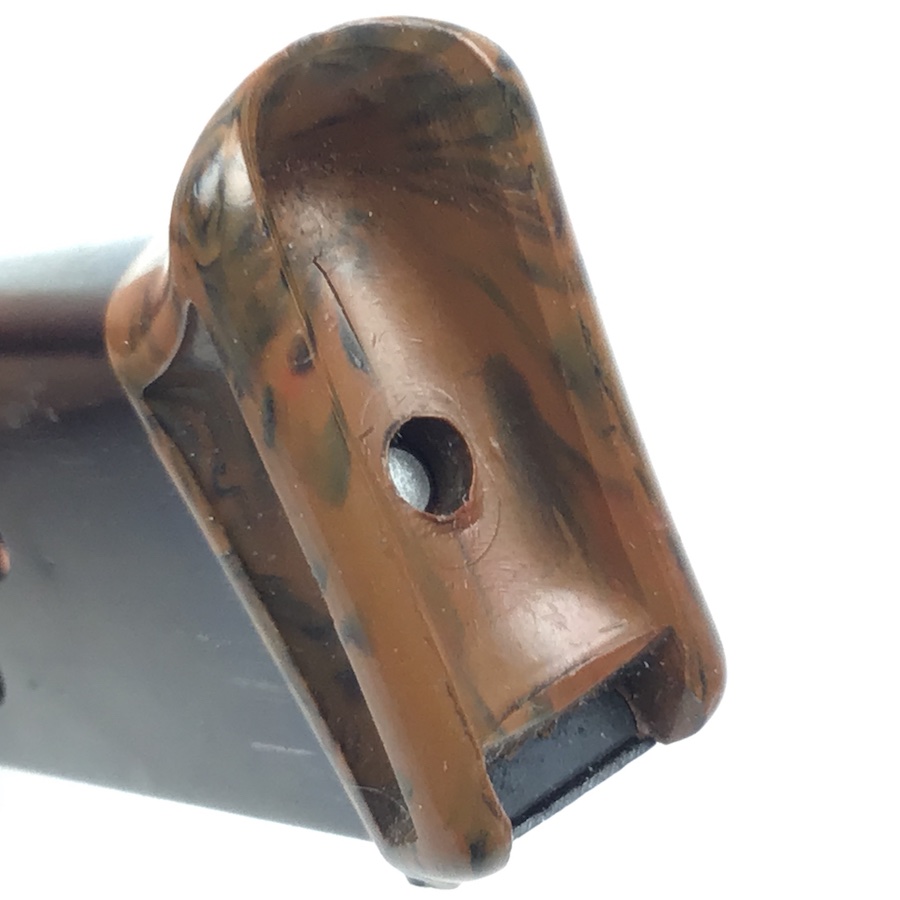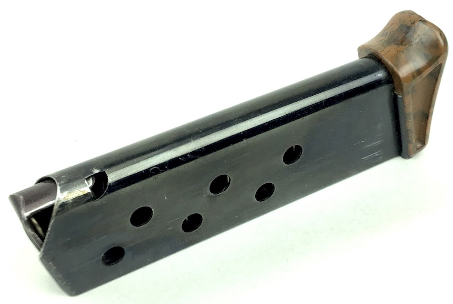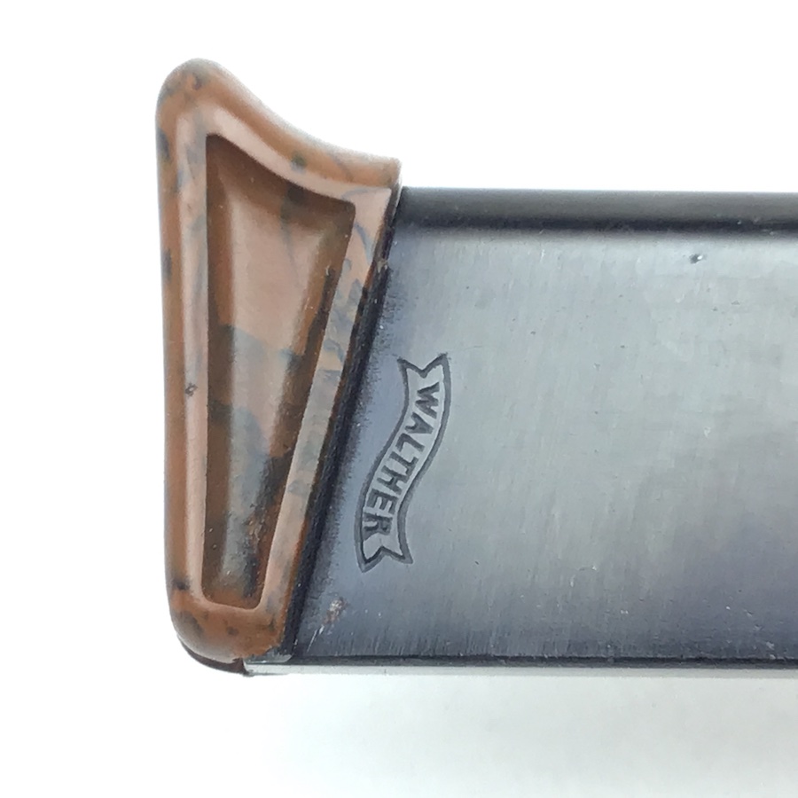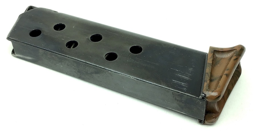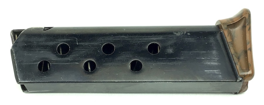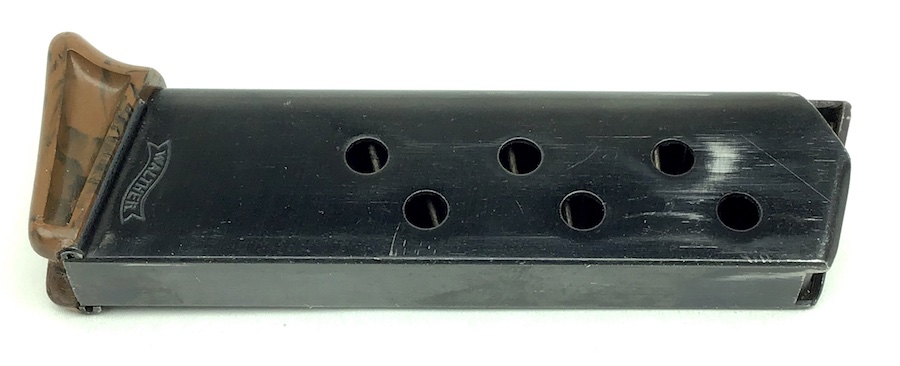 3/13/20 – This is an excellent, early / pre WW2 manufactured Walther PPK magazine. The magazine has a high polish finish with a Walther banner stamped on one side. The brown bakelite finger extension has excellent color and a very minor crack near the release button. This is the early no-lip style. Fully functional, strong spring.