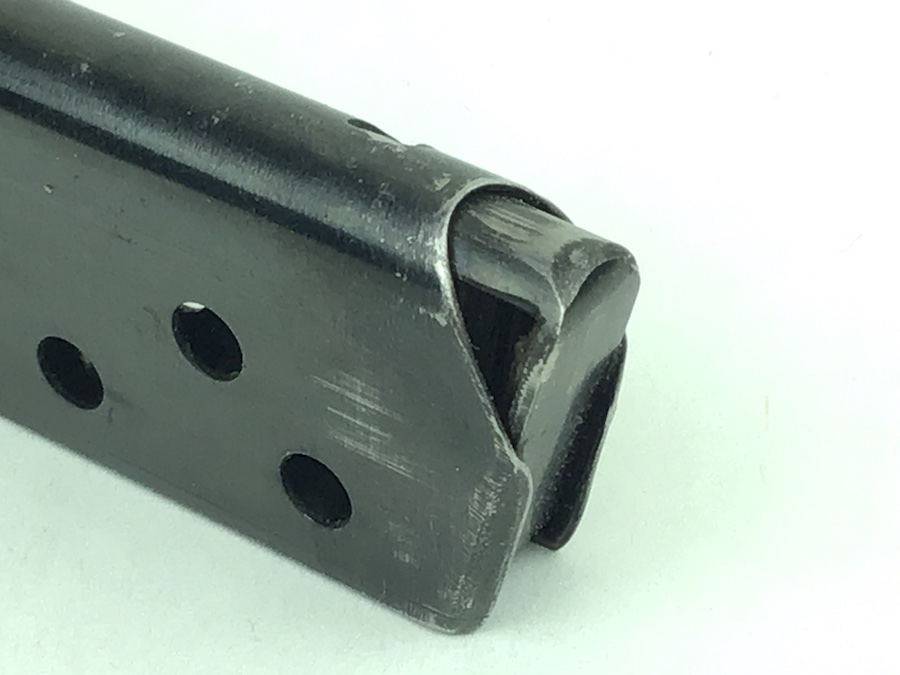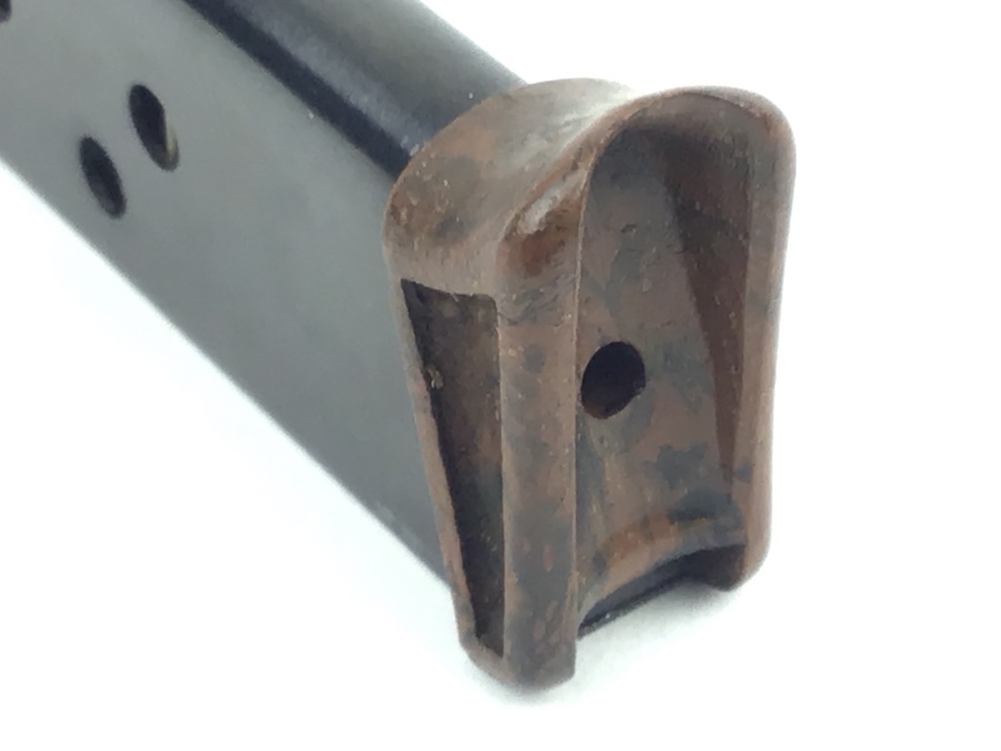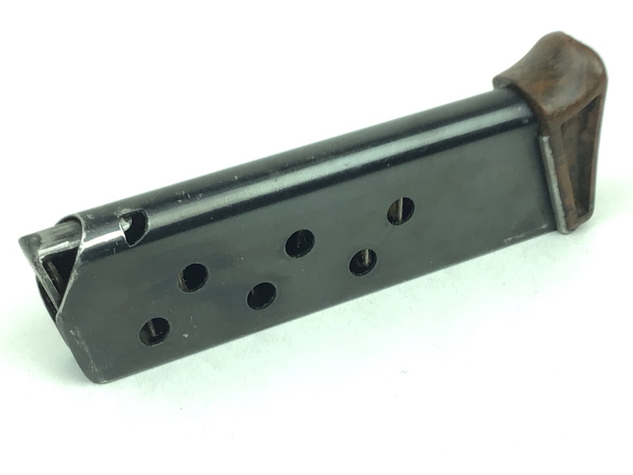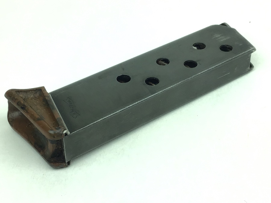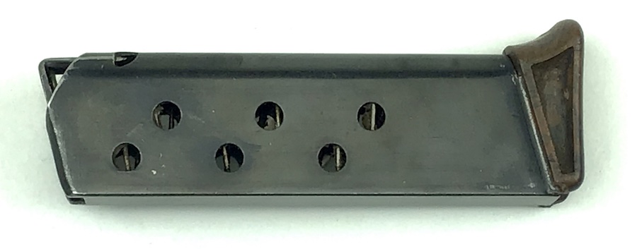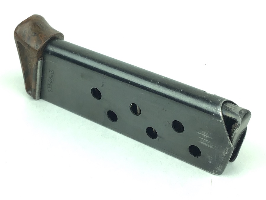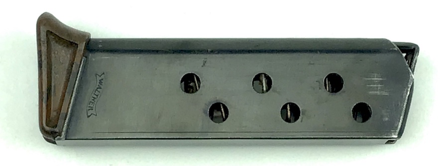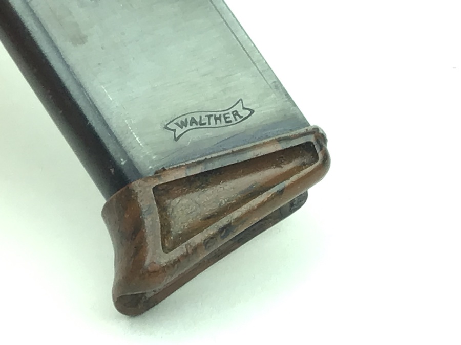 4/2/20 – This is an excellent, early / pre WW2 manufactured Walther PPK magazine. The magazine has a high polish finish with a Walther banner stamped on one side. The brown bakelite finger extension has excellent color with no flaws. This is the thin lip style. Fully functional, strong spring.