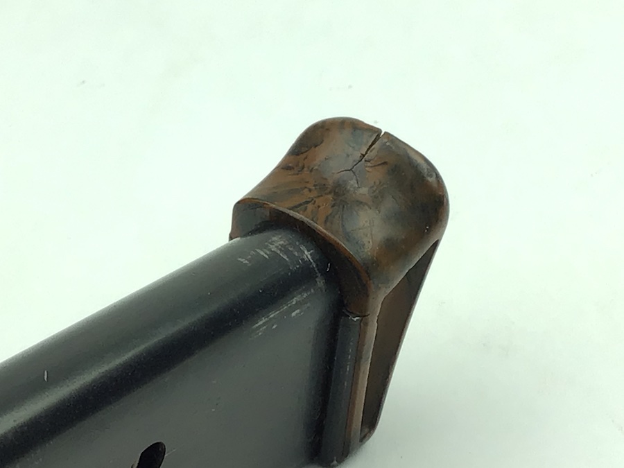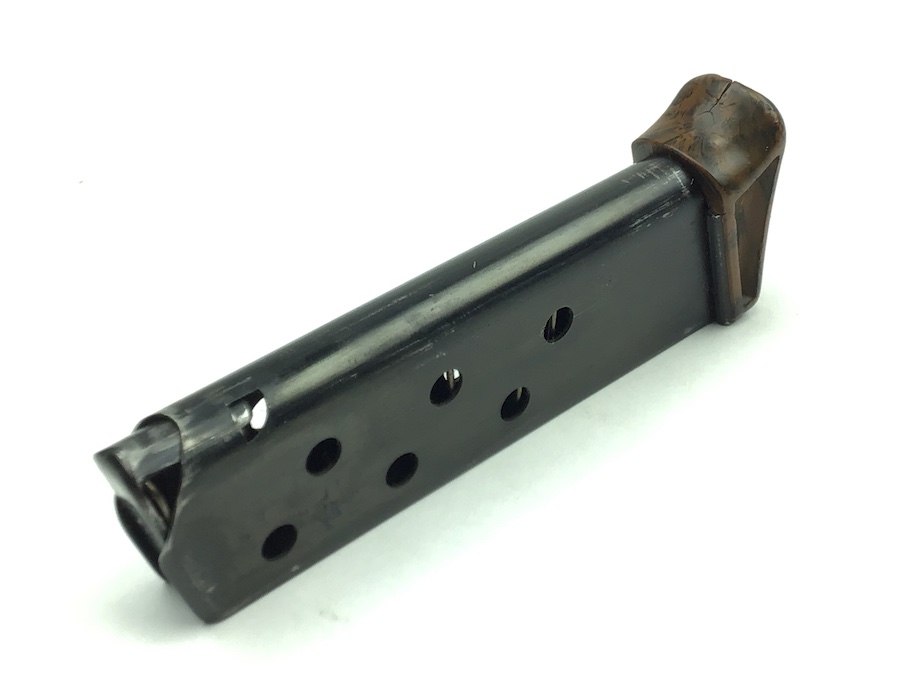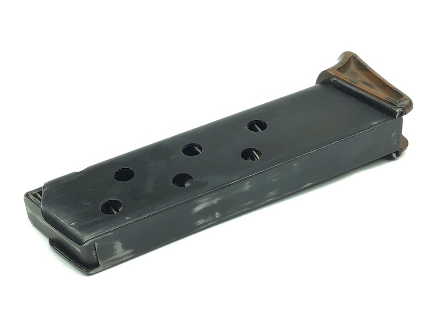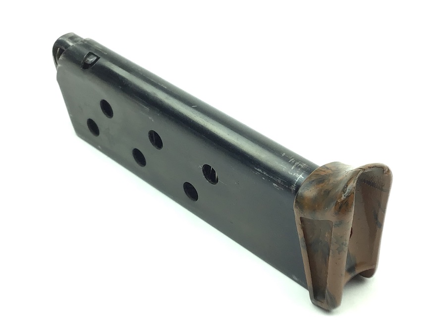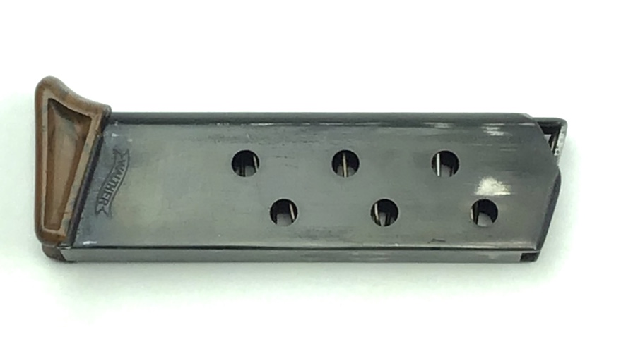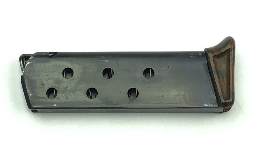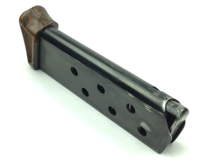 12/4/20 – This is an excellent, early / pre WW2 manufactured Walther PPK magazine. The magazine has a high polish finish with a Walther banner stamped on one side. The brown bakelite finger extension has excellent color and a very minor crack near the toe. See photos. Correct thin-lipped style extension. Fully functional, strong spring.