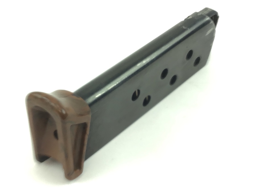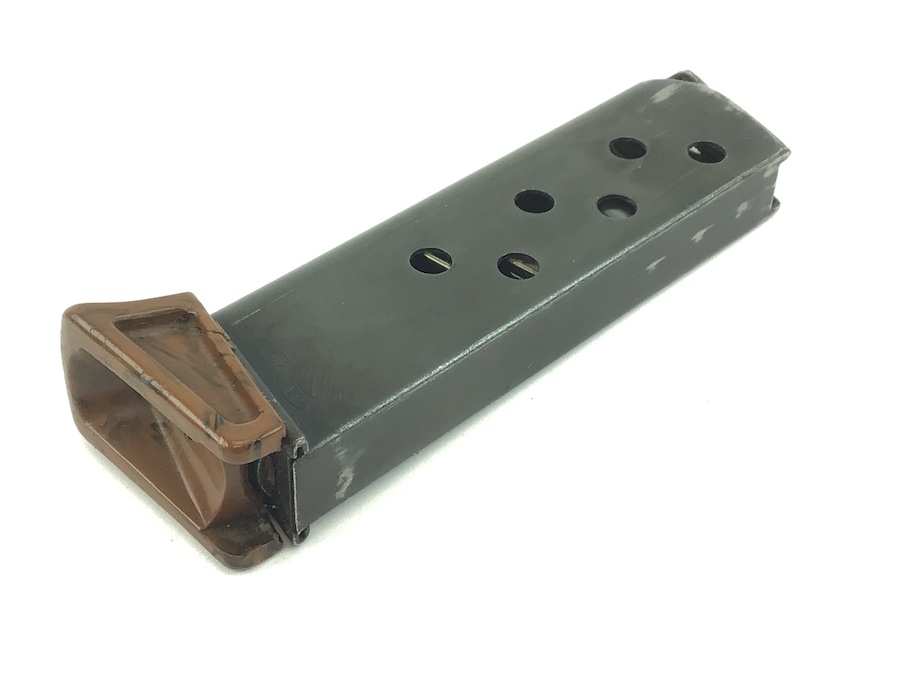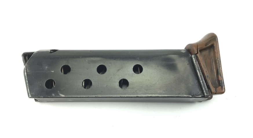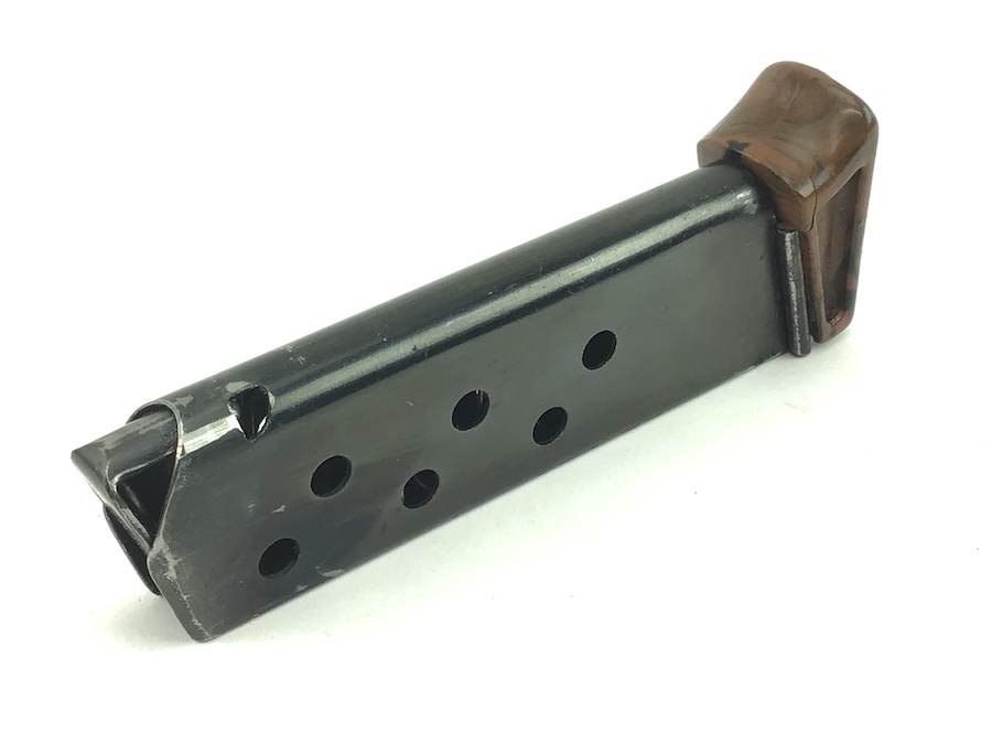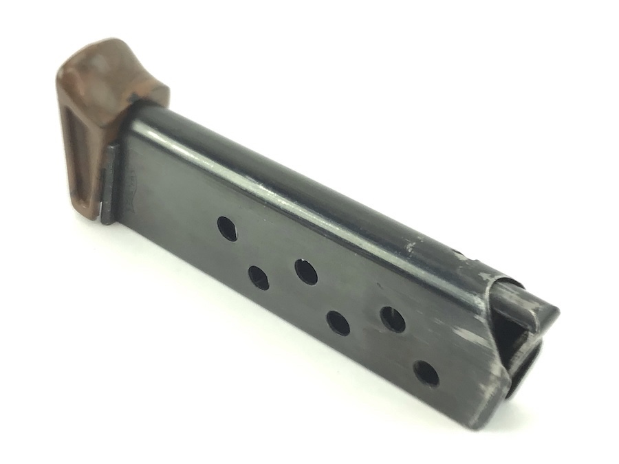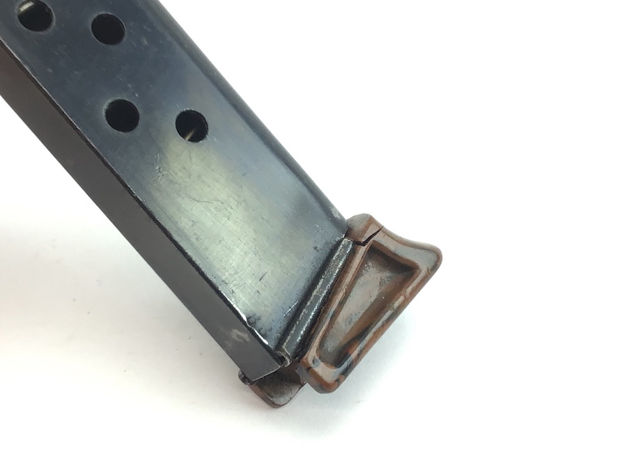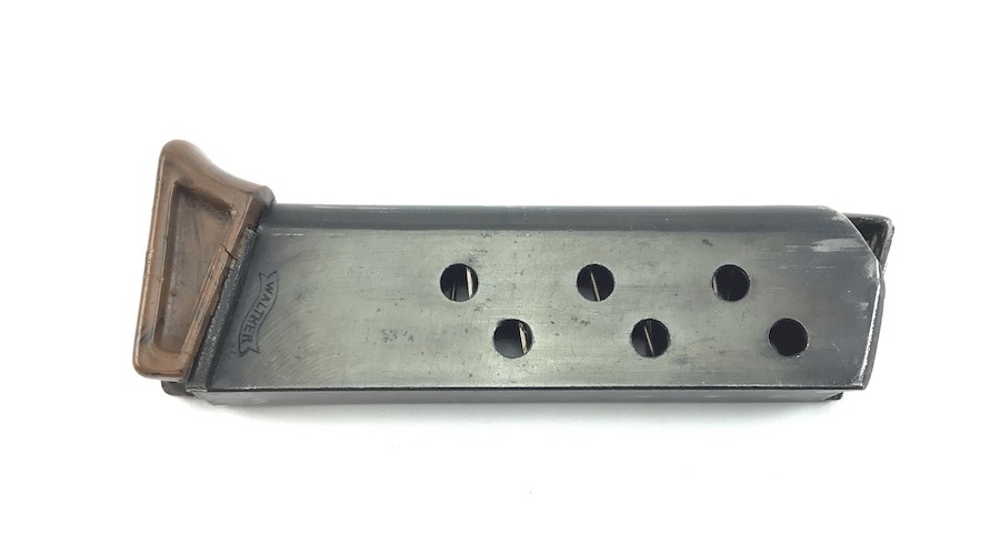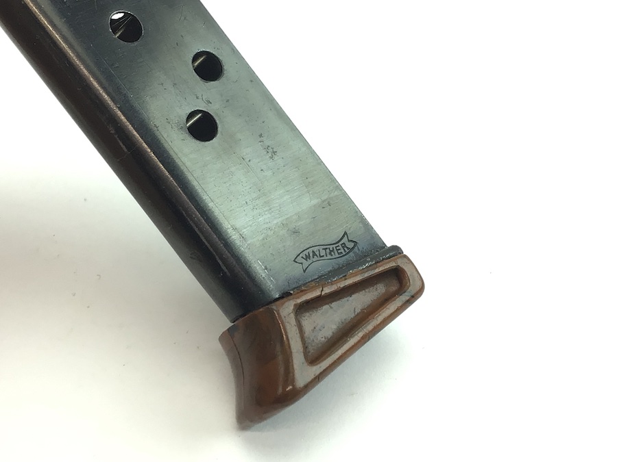 4/20/21 – This is an early / pre WW2 manufactured Walther PPK magazine. The magazine has a high polish finish with a Walther banner stamped on one side. The brown bakelite finger extension has excellent color and minor cracks on each side. The tube has a minor distortion on the right side, but it does not effect the functionality. Priced accordingly.