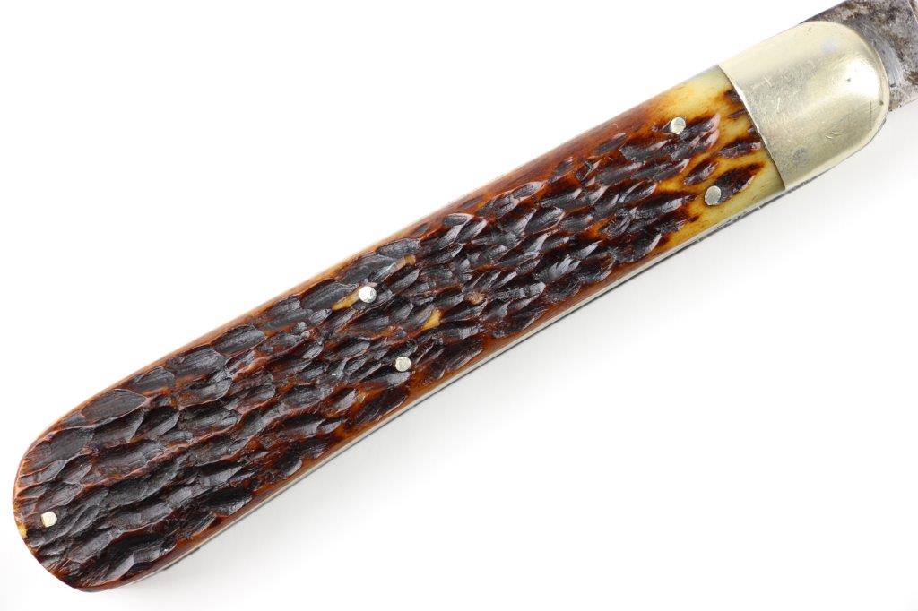 3/4/24 – This is an early variation, rare “Press Button” US Paratrooper switchblade knife. The base of the blade is maker marked “Press Button Knife Co.” which ultimately became “Schrade”, this being the earlier variation with the release button being located on the top of the handle, instead of positioned lower into the handle like most other wartime examples found today. This earlier style is rare and highly collectible, as these were used by US Paratroopers during WW2. The blade edge shows light signs of sharpening and surface scratches. The spine of the blade has dark patina and handling discoloration as shown. The action is smooth and the blade locks and unlocks / opens with no issue. The original handle is excellent, as shown.