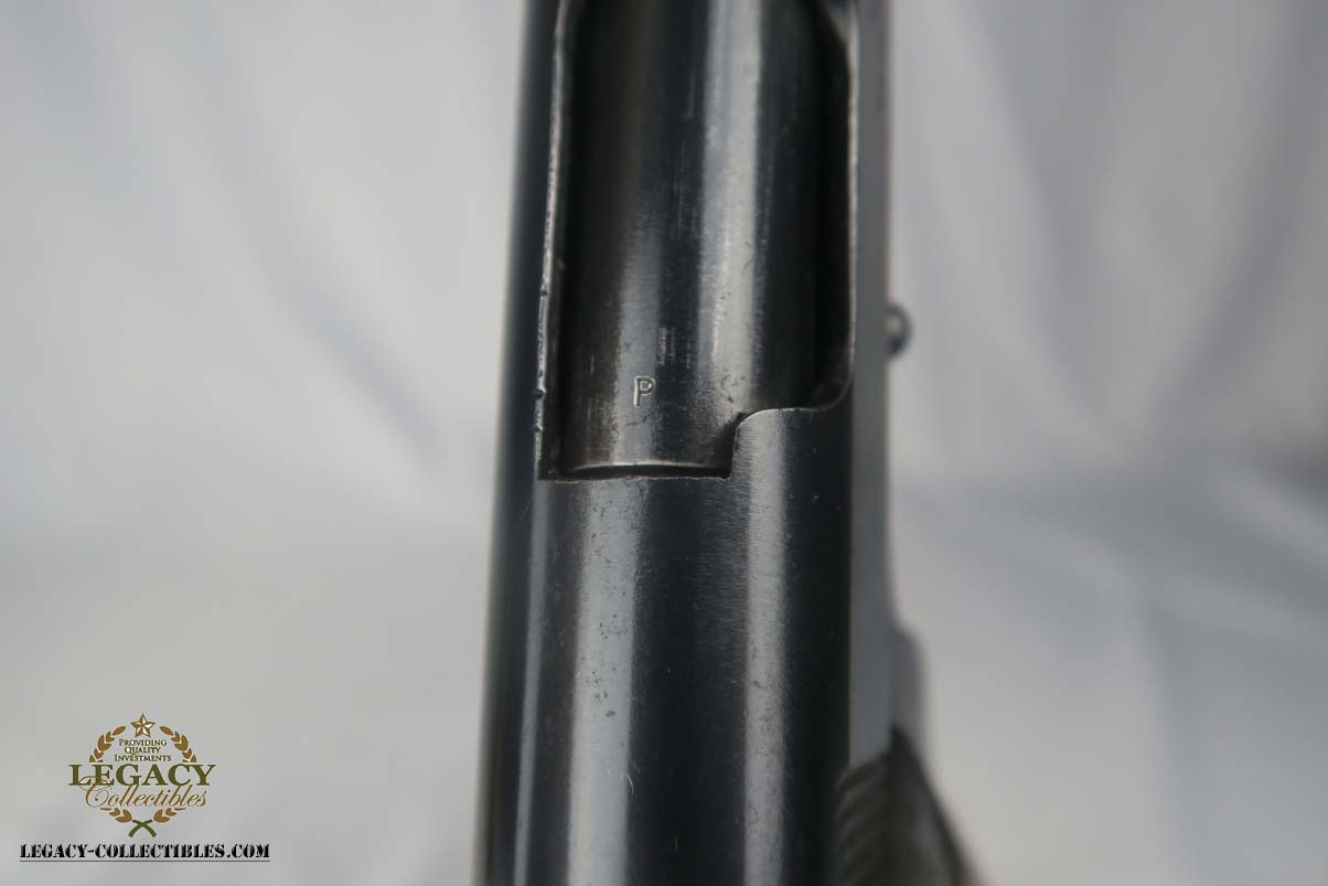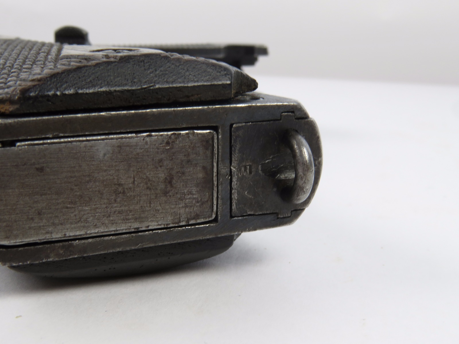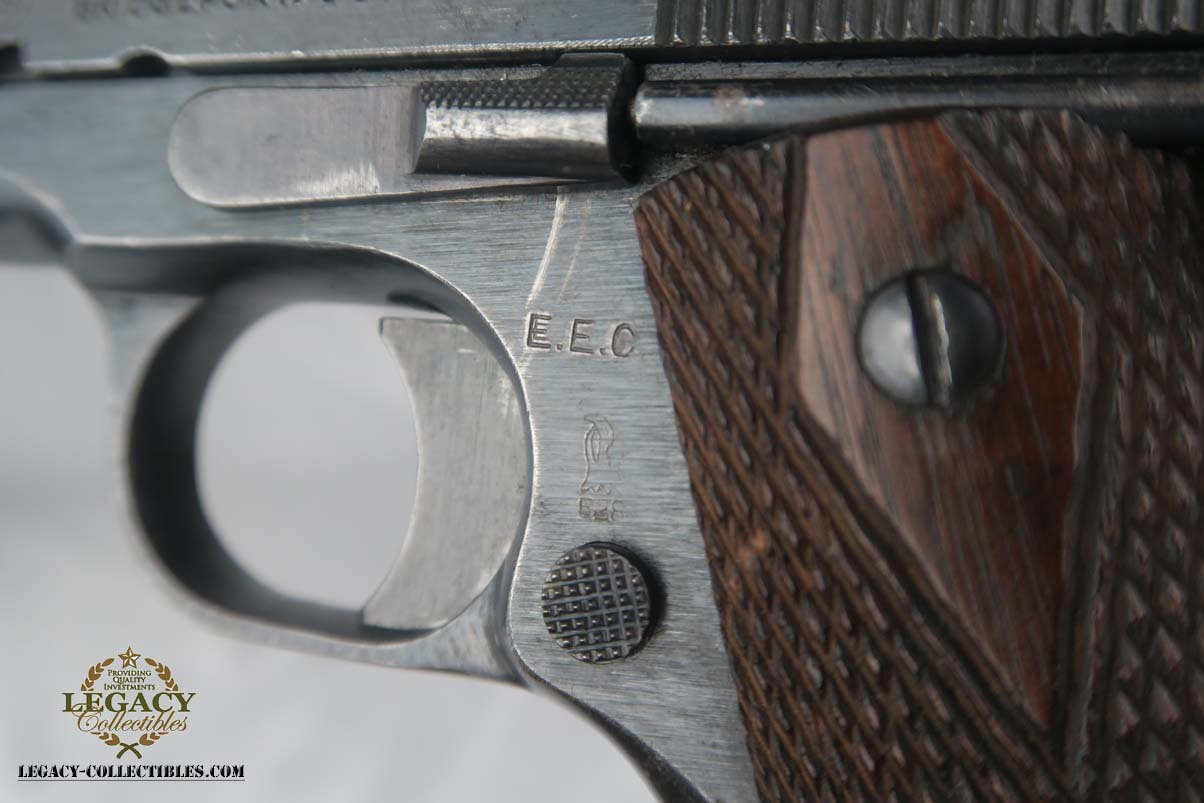 5/31/17 – This is a rare, early Remington UMC 1911 in all-original configuration. Of the three manufacturers of U.S. Military 1911 pistols, the Remington-UMC is the least common with only ~21,000 produced. This pistol is a first-year Remington UMC production (1918), with proper E.E.C. inspectors marking on the left side of the frame. Major Edmond E. Chapman was responsible for the entire Rem-UMC production. Below his mark is an Eagle/28 proof. The slide is marked with the ‘E’ above the firing pin stop. Barrel chamber is marked with a single “P”, which is correct for Remington-UMC production. The finish rates at about 90%, with a beautiful slide but notable wear on the straps. Excellent bore.