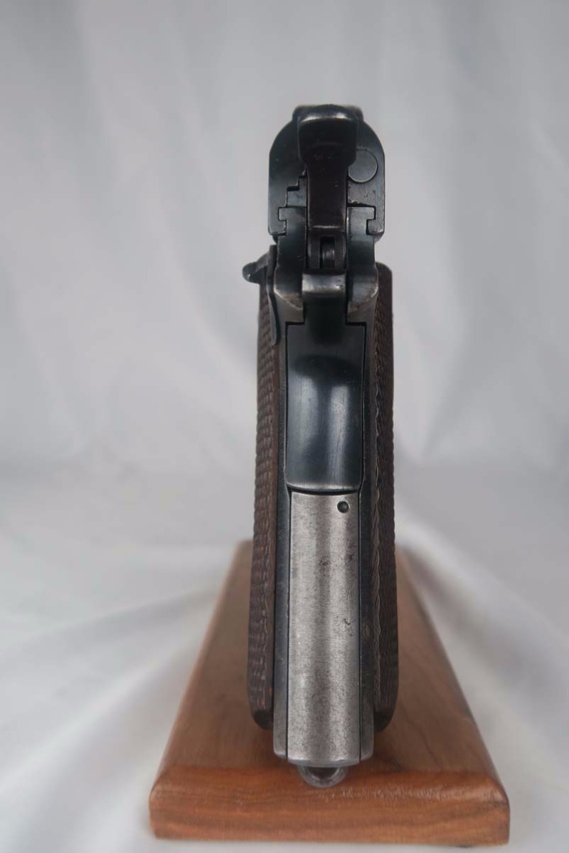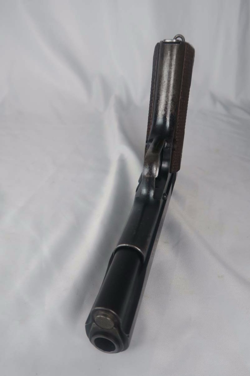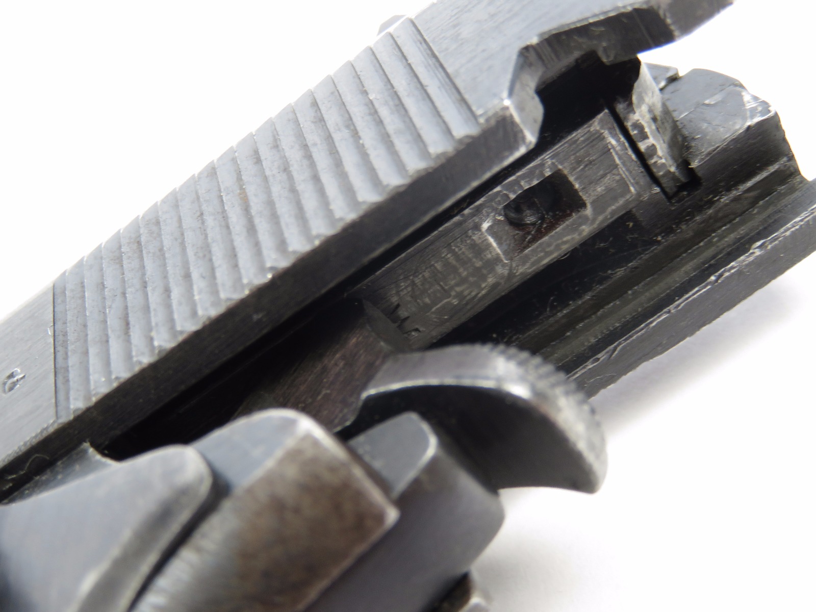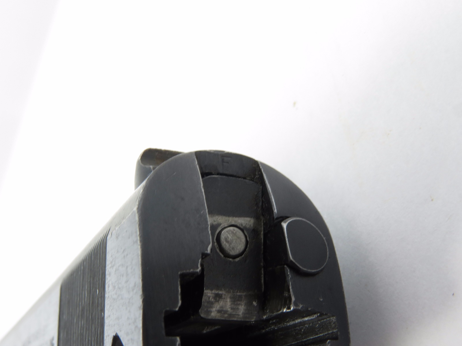 5/31/17 – This is a rare, early Remington UMC 1911 in all-original configuration. Of the three manufacturers of U.S. Military 1911 pistols, the Remington-UMC is the least common with only ~21,000 produced. This pistol is a first-year Remington UMC production (1918), with proper E.E.C. inspectors marking on the left side of the frame. Major Edmond E. Chapman was responsible for the entire Rem-UMC production. Below his mark is an Eagle/28 proof. The slide is marked with the ‘E’ above the firing pin stop. Barrel chamber is marked with a single “P”, which is correct for Remington-UMC production. The finish rates at about 90%, with a beautiful slide but notable wear on the straps. Excellent bore.