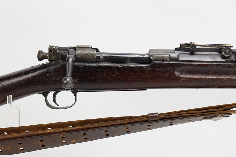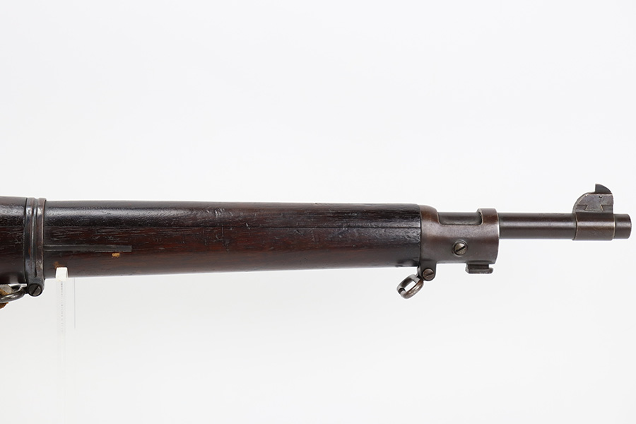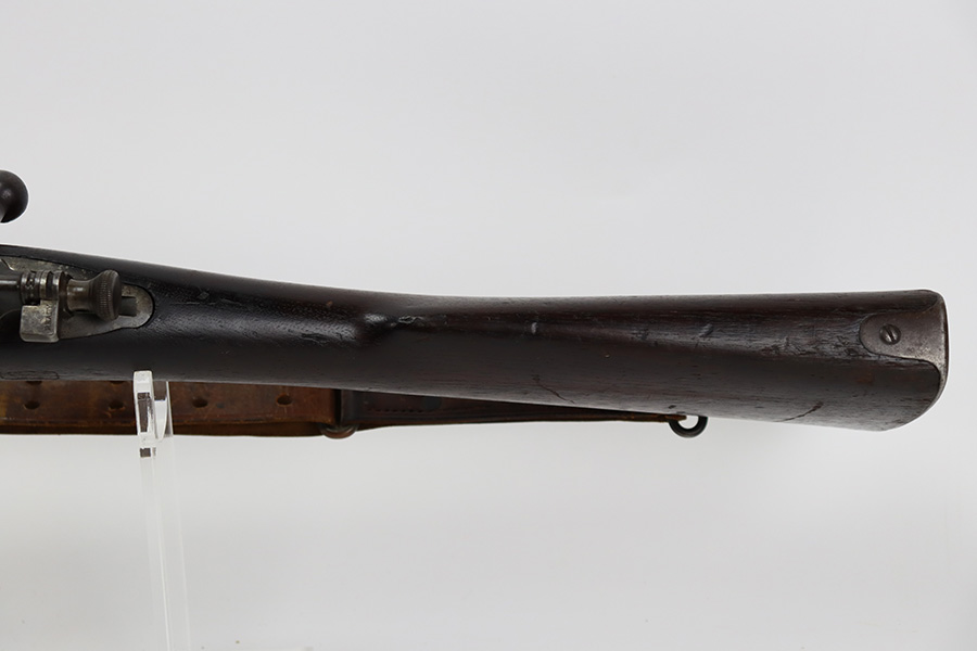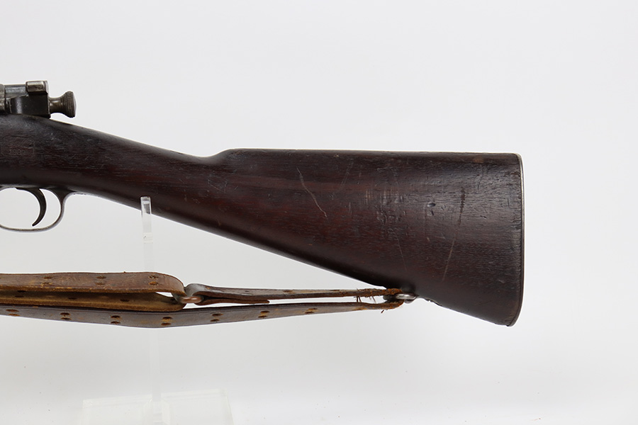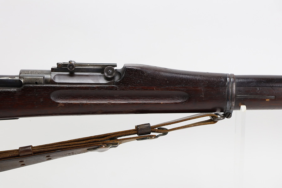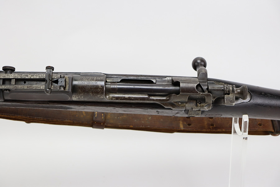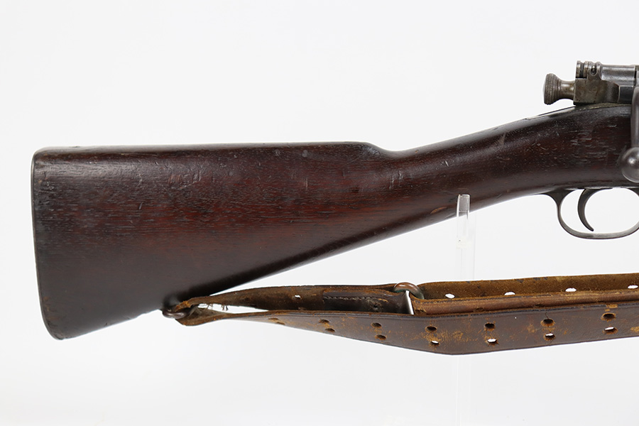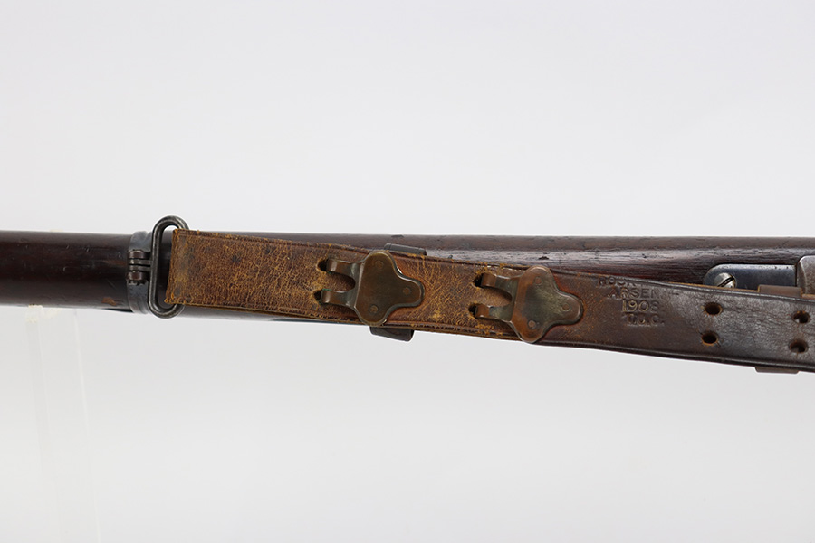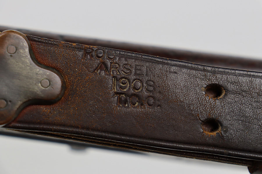 7/26/23 – This is a nice example of an early Rock Island Arsenal Model 1903 rifle. The serial number on the receiver dates to 1909, the barrel is RIA marked and dated June of 1909, and the stock has a crisp military cartouche dated 1909. The metal parts have retained less than half of their original finish with obvious wear, brown patina, and spotty oxidation throughout. There is no major damage to the wood, but there are obvious dings, bruises, and scratches throughout. Comes with a period-correct sling that has the RIA makers mark and is dated 1908. The bore is shiny for the most part with strong rifling, but there is some minor pitting here and there.