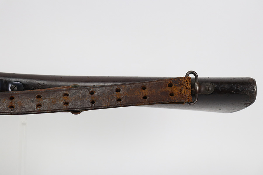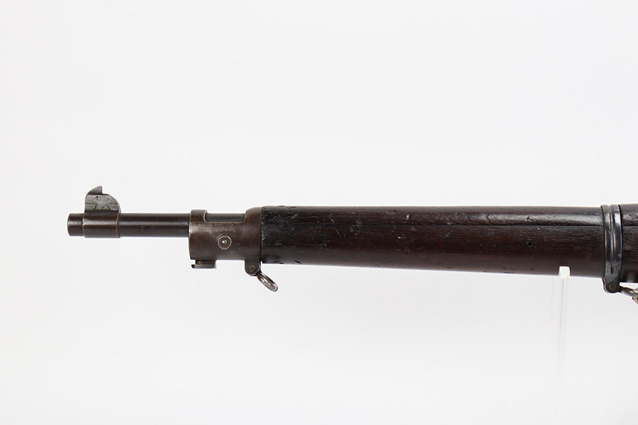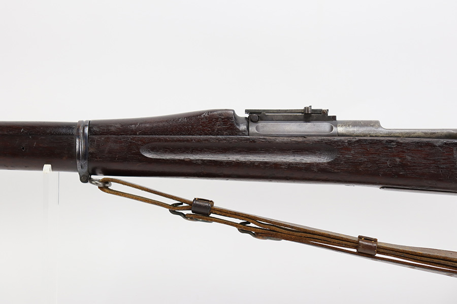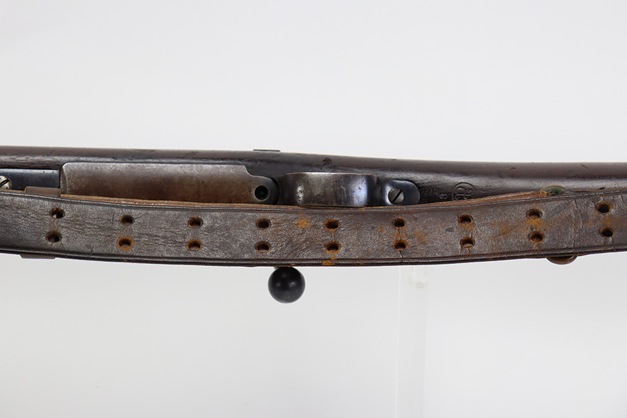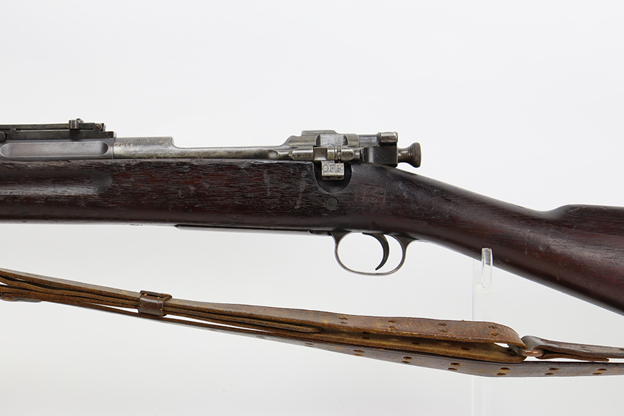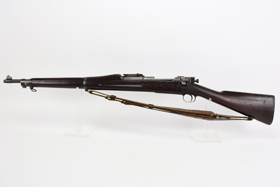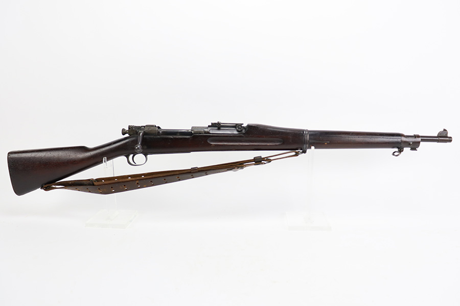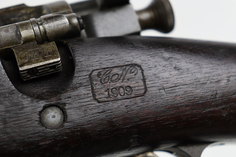 7/26/23 – This is a nice example of an early Rock Island Arsenal Model 1903 rifle. The serial number on the receiver dates to 1909, the barrel is RIA marked and dated June of 1909, and the stock has a crisp military cartouche dated 1909. The metal parts have retained less than half of their original finish with obvious wear, brown patina, and spotty oxidation throughout. There is no major damage to the wood, but there are obvious dings, bruises, and scratches throughout. Comes with a period-correct sling that has the RIA makers mark and is dated 1908. The bore is shiny for the most part with strong rifling, but there is some minor pitting here and there.