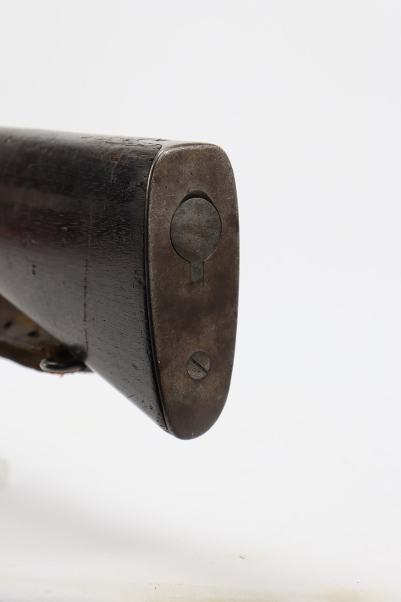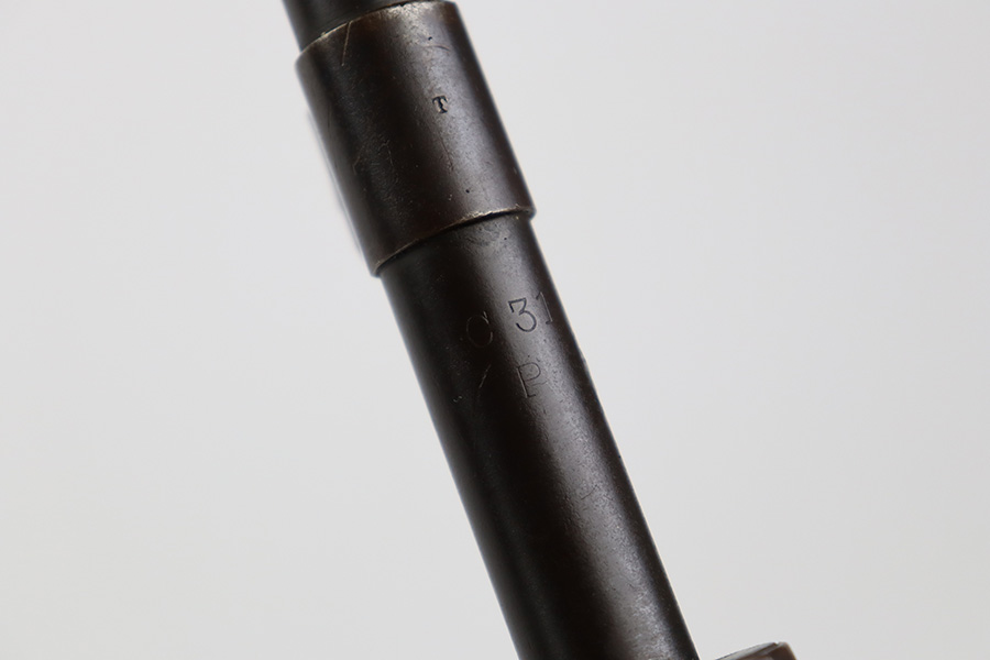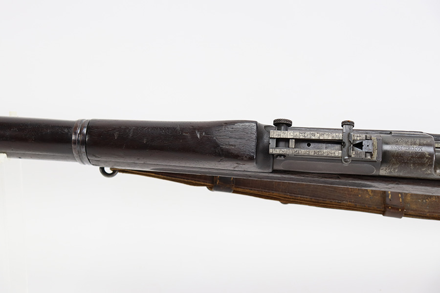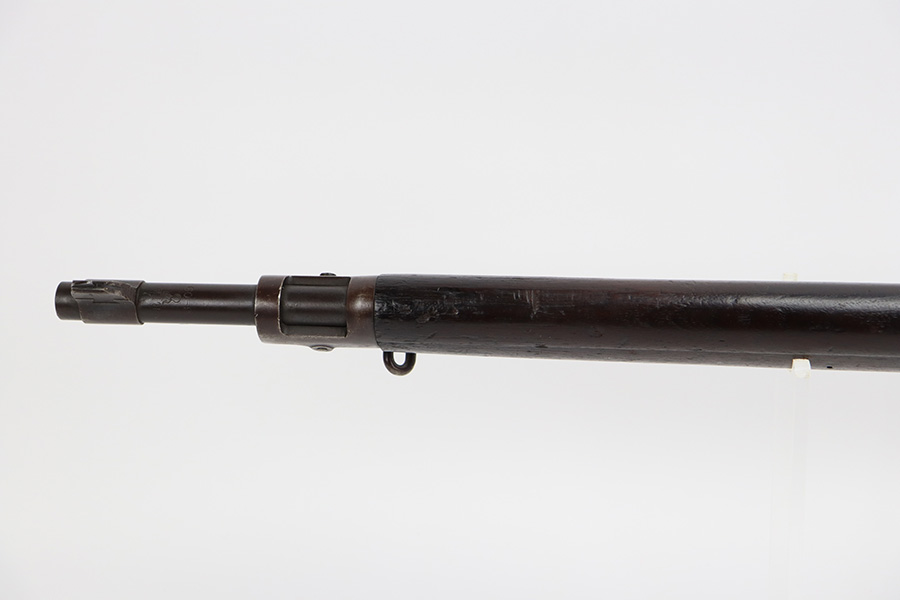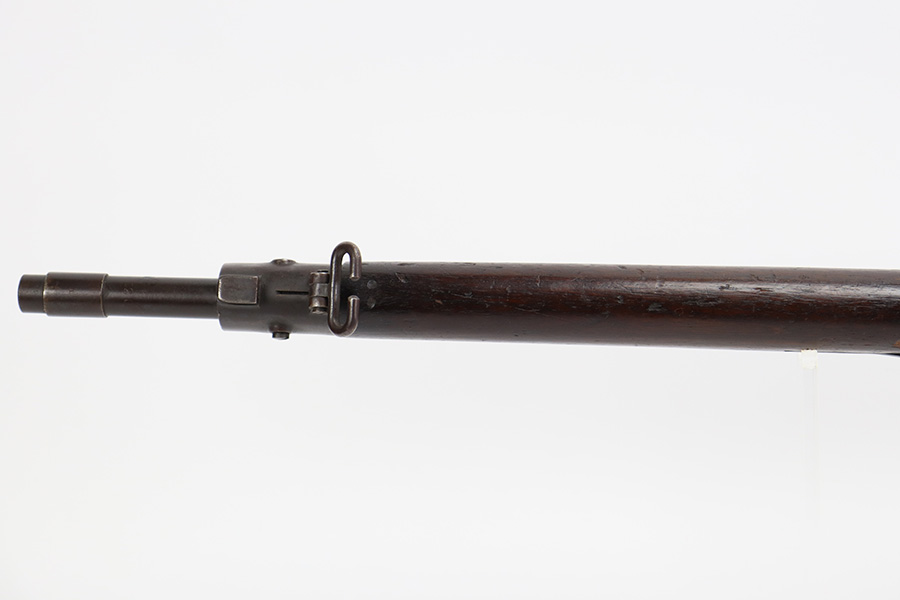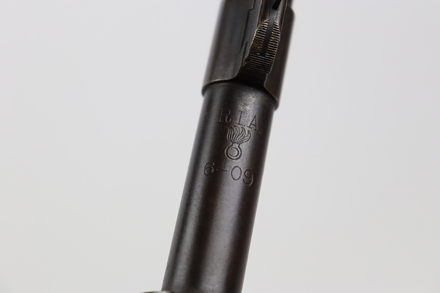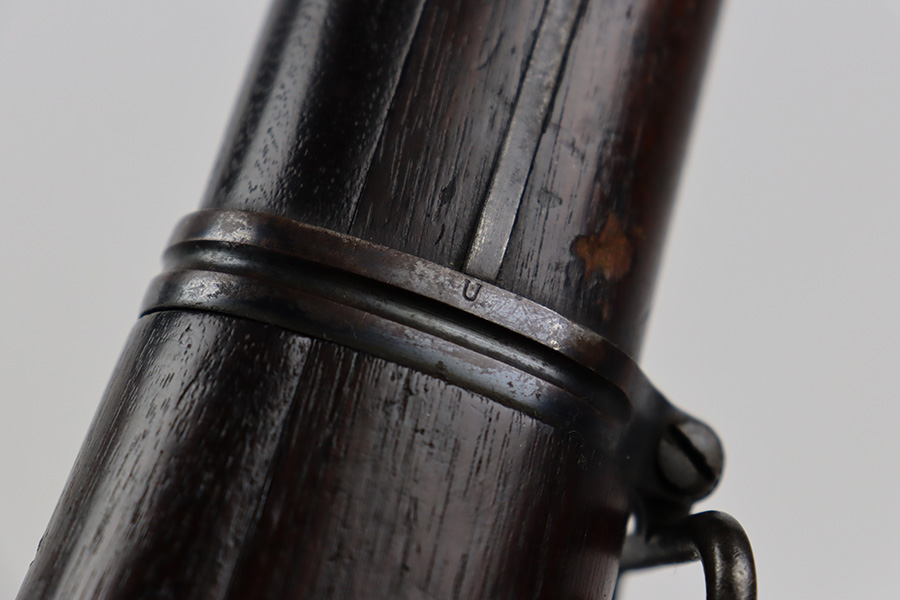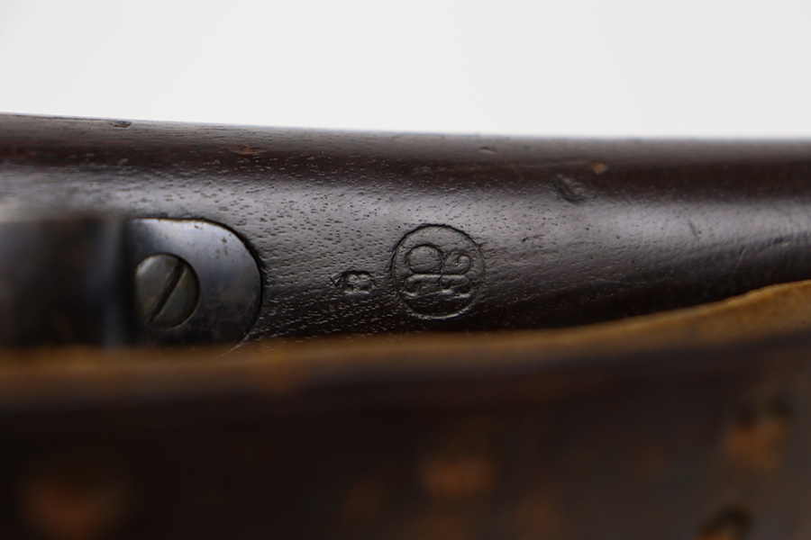 7/26/23 – This is a nice example of an early Rock Island Arsenal Model 1903 rifle. The serial number on the receiver dates to 1909, the barrel is RIA marked and dated June of 1909, and the stock has a crisp military cartouche dated 1909. The metal parts have retained less than half of their original finish with obvious wear, brown patina, and spotty oxidation throughout. There is no major damage to the wood, but there are obvious dings, bruises, and scratches throughout. Comes with a period-correct sling that has the RIA makers mark and is dated 1908. The bore is shiny for the most part with strong rifling, but there is some minor pitting here and there.