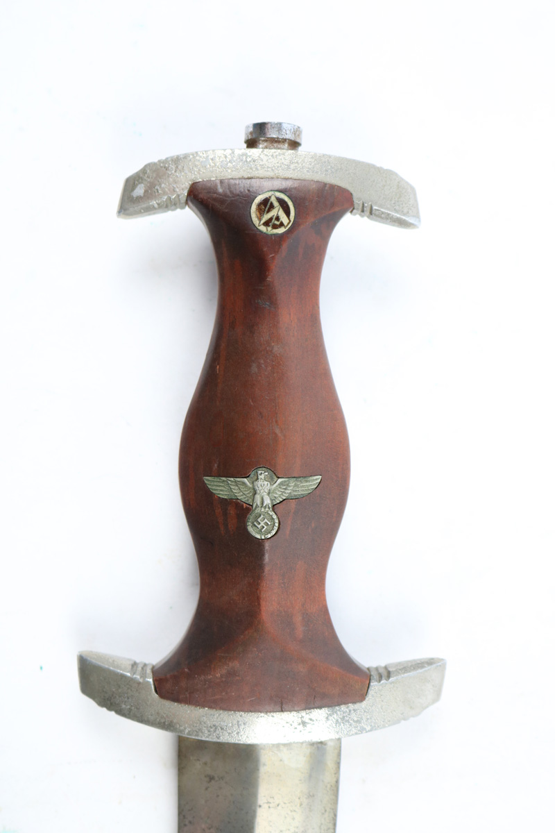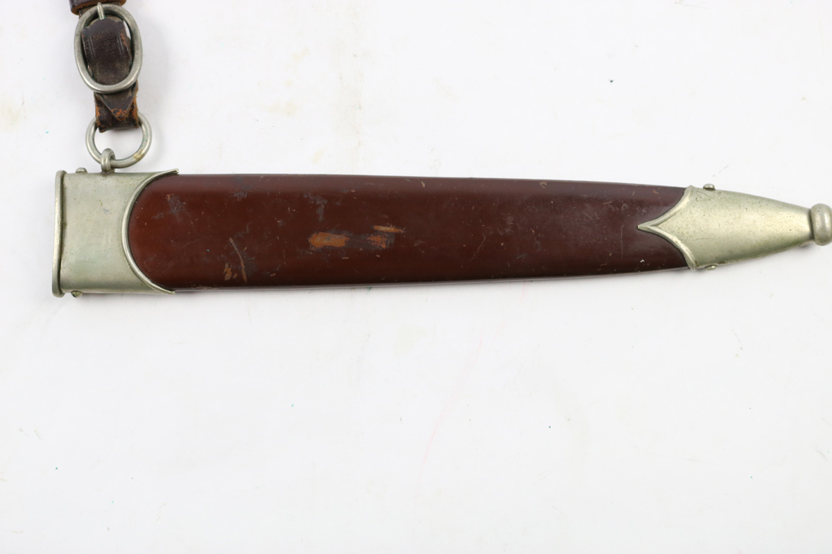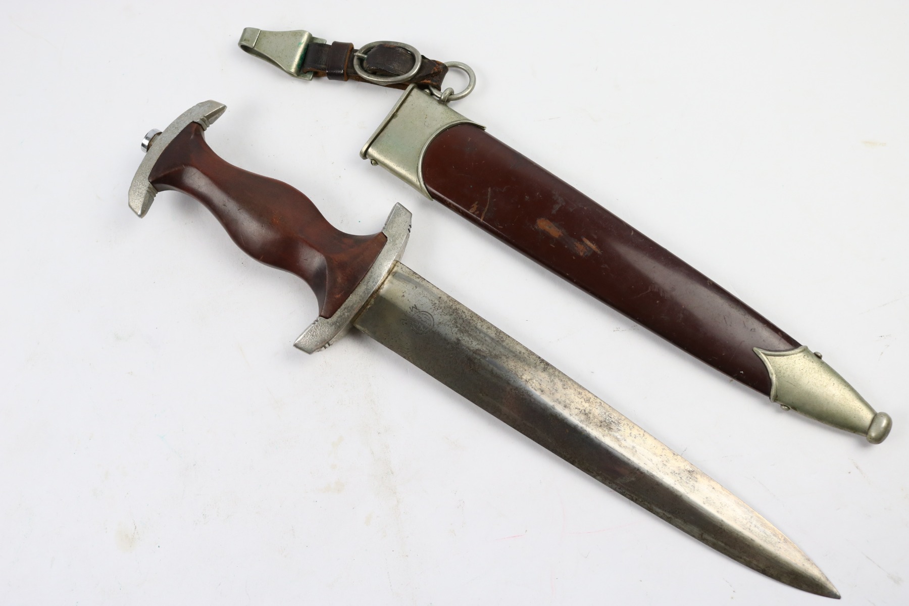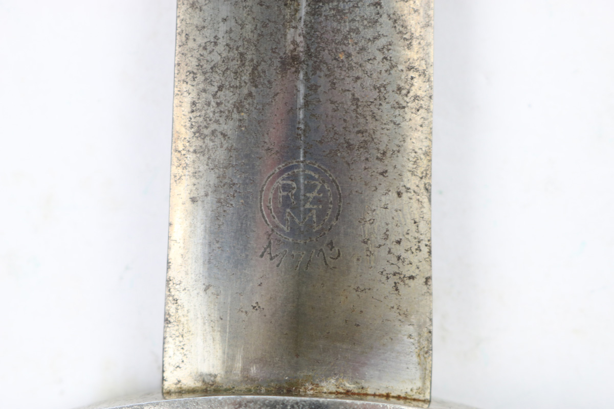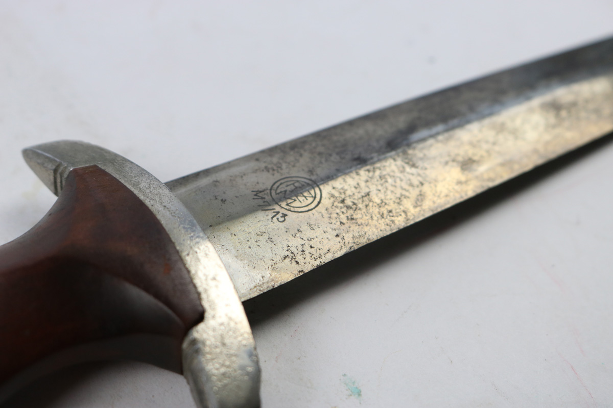 6/2/18 – This is an early, pre WW2 production nazi RZM SA Dagger. The dagger is worn, but early and all original. One can tell by observing the maker stamp on the blade that this was one of the early production RZM SA daggers. The blade has early font and M7/13 maker code (Arthur Schuttelhofer & Co., Solingen-Wald). This code was granted in 1938 and the lower code number means this was one of the first producers for the nazi political party. The blade condition is worn with dark spotty patina on each side. The nickle fittings have oxidation throughout, but no rust is present. The wood handle is in excellent condition. The scabbard has some wear on the brown painted area and some spots of paint have been scratched/chipped off. The nickle point to the scabbard has a dent and is slightly bent upwards. The leather hanger and clip are unmarked but show signs of aging and use. Guaranteed original and authentic.