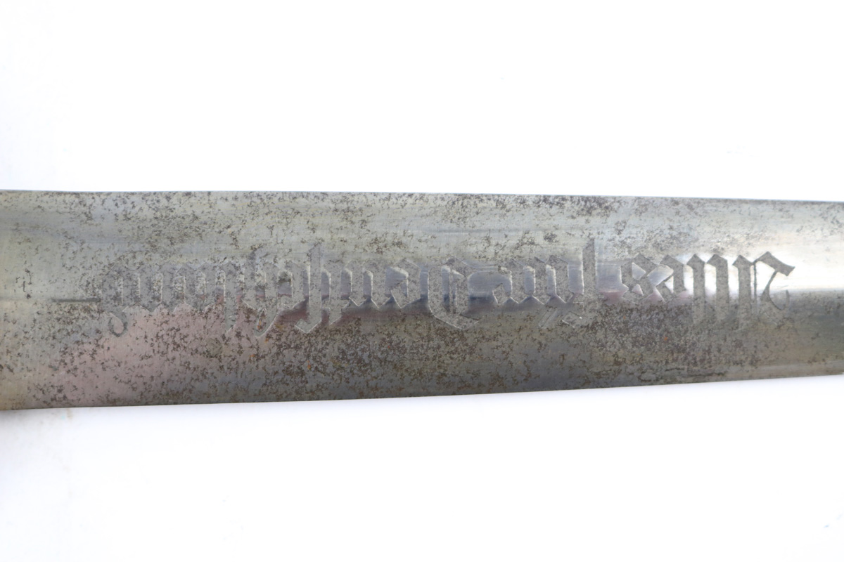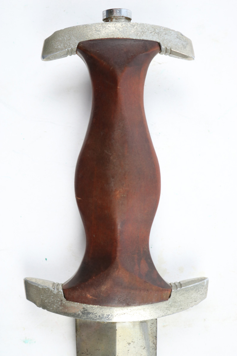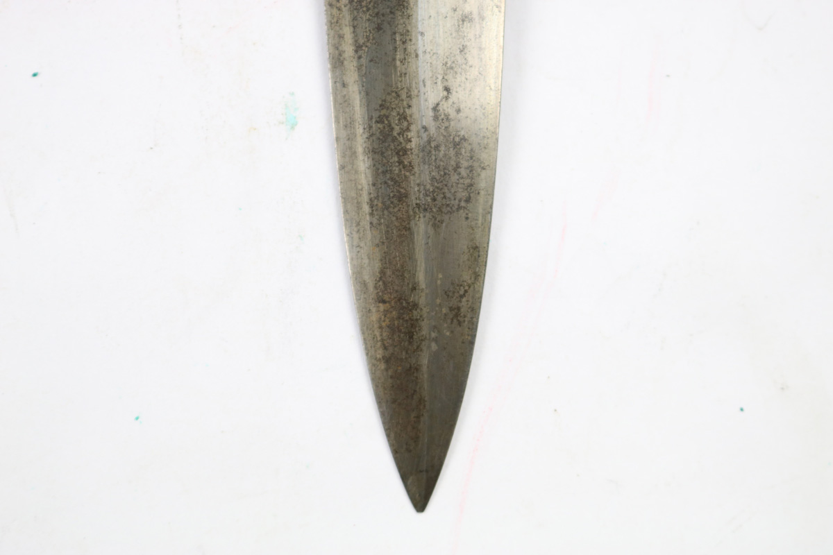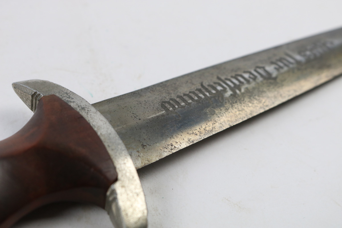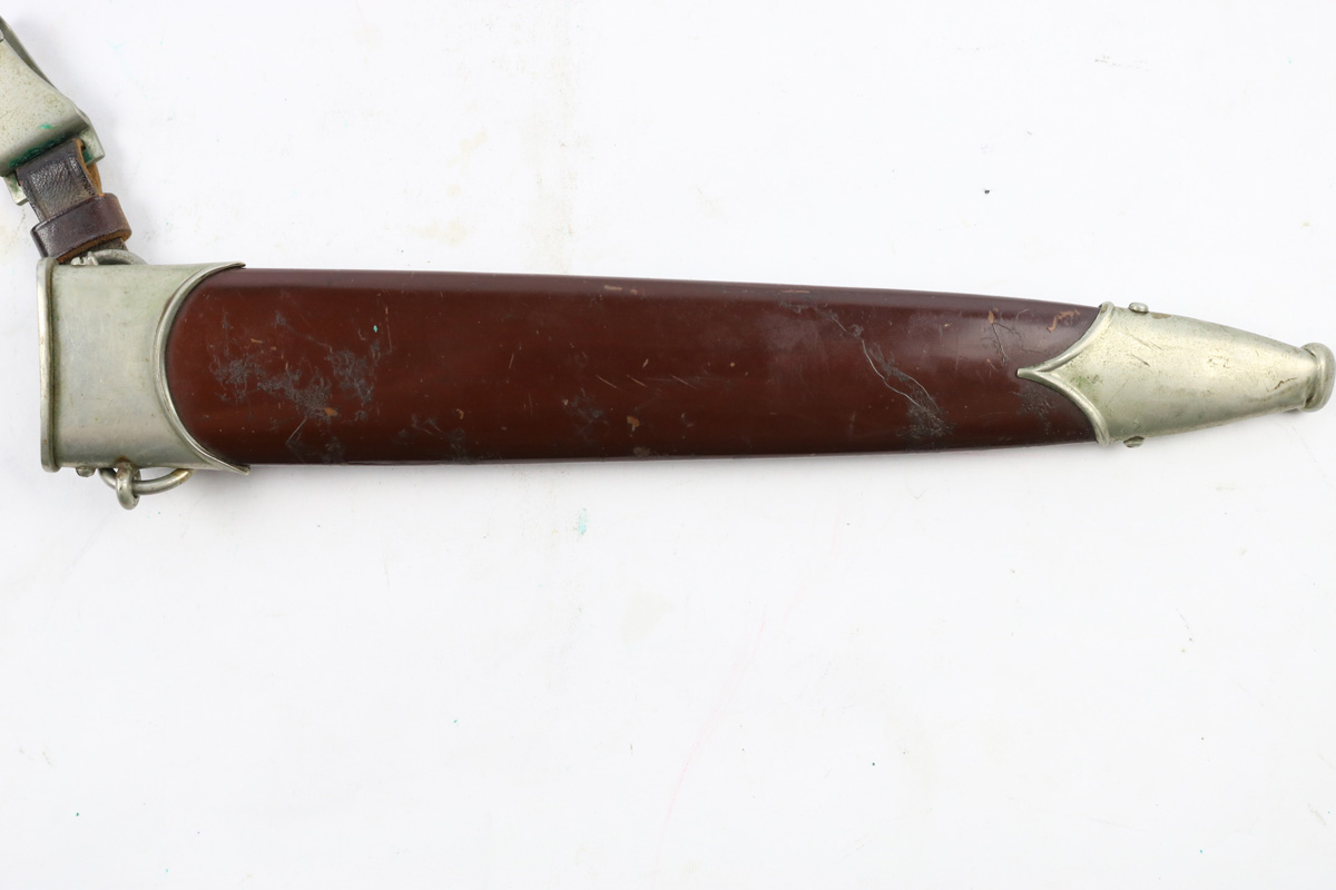 6/2/18 – This is an early, pre WW2 production nazi RZM SA Dagger. The dagger is worn, but early and all original. One can tell by observing the maker stamp on the blade that this was one of the early production RZM SA daggers. The blade has early font and M7/13 maker code (Arthur Schuttelhofer & Co., Solingen-Wald). This code was granted in 1938 and the lower code number means this was one of the first producers for the nazi political party. The blade condition is worn with dark spotty patina on each side. The nickle fittings have oxidation throughout, but no rust is present. The wood handle is in excellent condition. The scabbard has some wear on the brown painted area and some spots of paint have been scratched/chipped off. The nickle point to the scabbard has a dent and is slightly bent upwards. The leather hanger and clip are unmarked but show signs of aging and use. Guaranteed original and authentic.