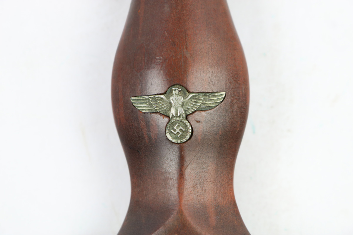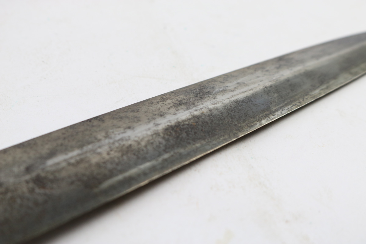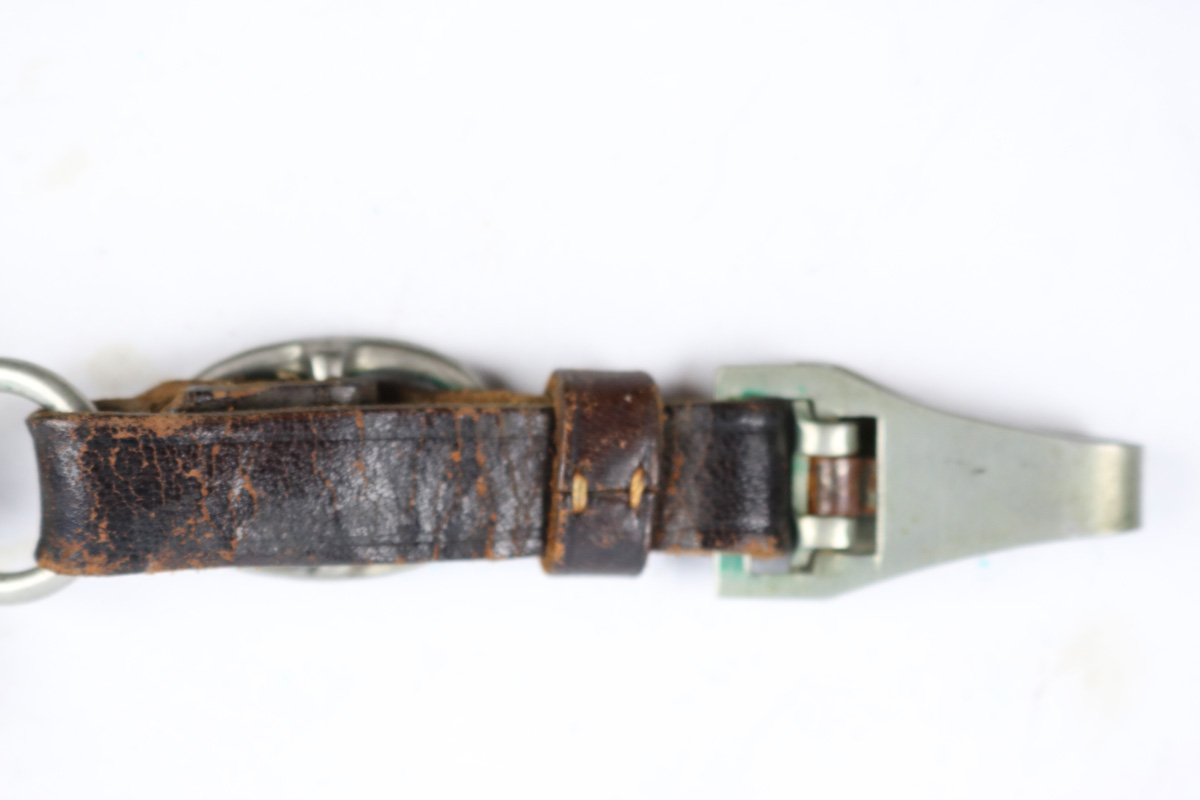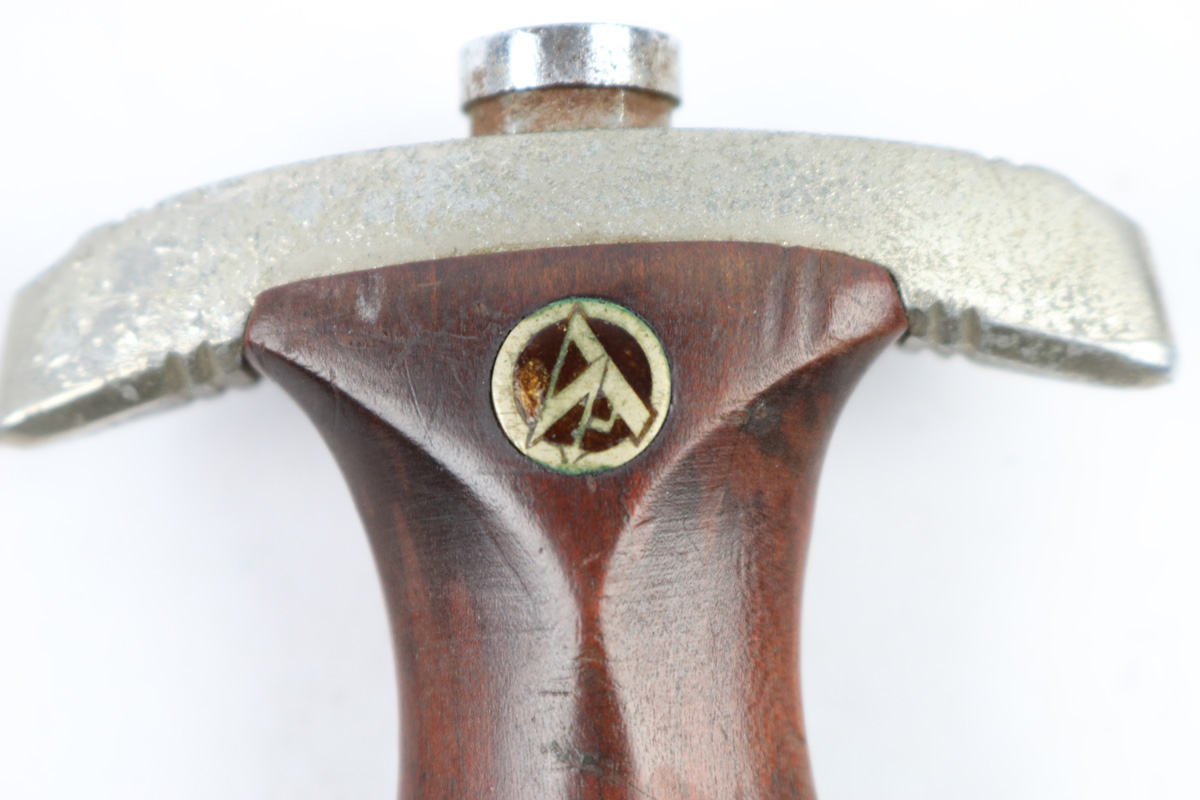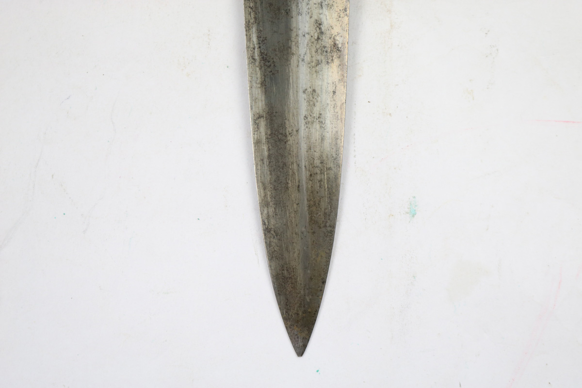 6/2/18 – This is an early, pre WW2 production nazi RZM SA Dagger. The dagger is worn, but early and all original. One can tell by observing the maker stamp on the blade that this was one of the early production RZM SA daggers. The blade has early font and M7/13 maker code (Arthur Schuttelhofer & Co., Solingen-Wald). This code was granted in 1938 and the lower code number means this was one of the first producers for the nazi political party. The blade condition is worn with dark spotty patina on each side. The nickle fittings have oxidation throughout, but no rust is present. The wood handle is in excellent condition. The scabbard has some wear on the brown painted area and some spots of paint have been scratched/chipped off. The nickle point to the scabbard has a dent and is slightly bent upwards. The leather hanger and clip are unmarked but show signs of aging and use. Guaranteed original and authentic.