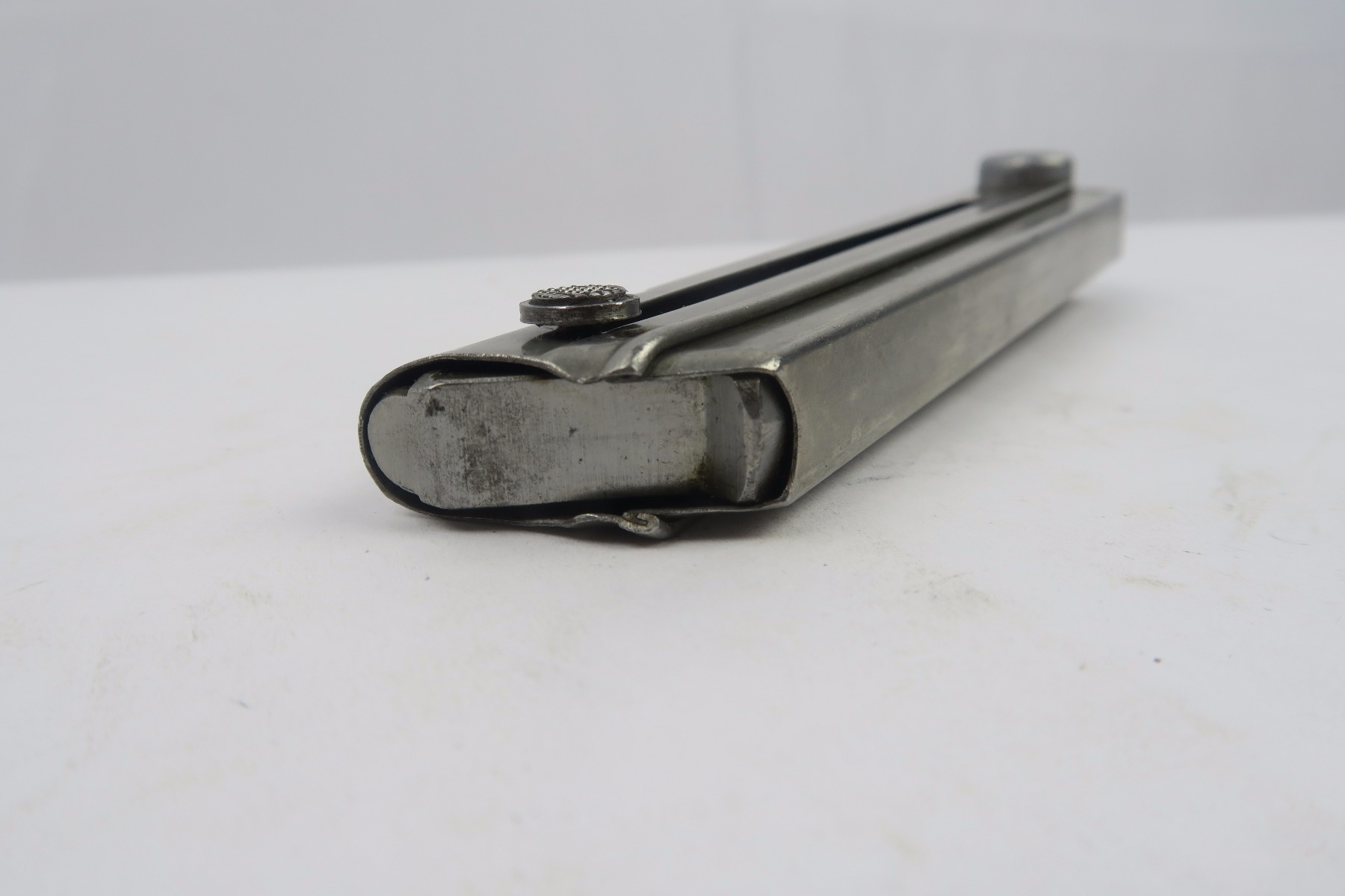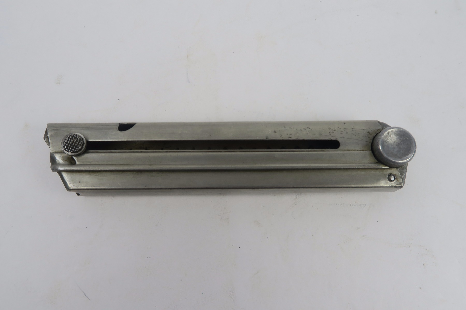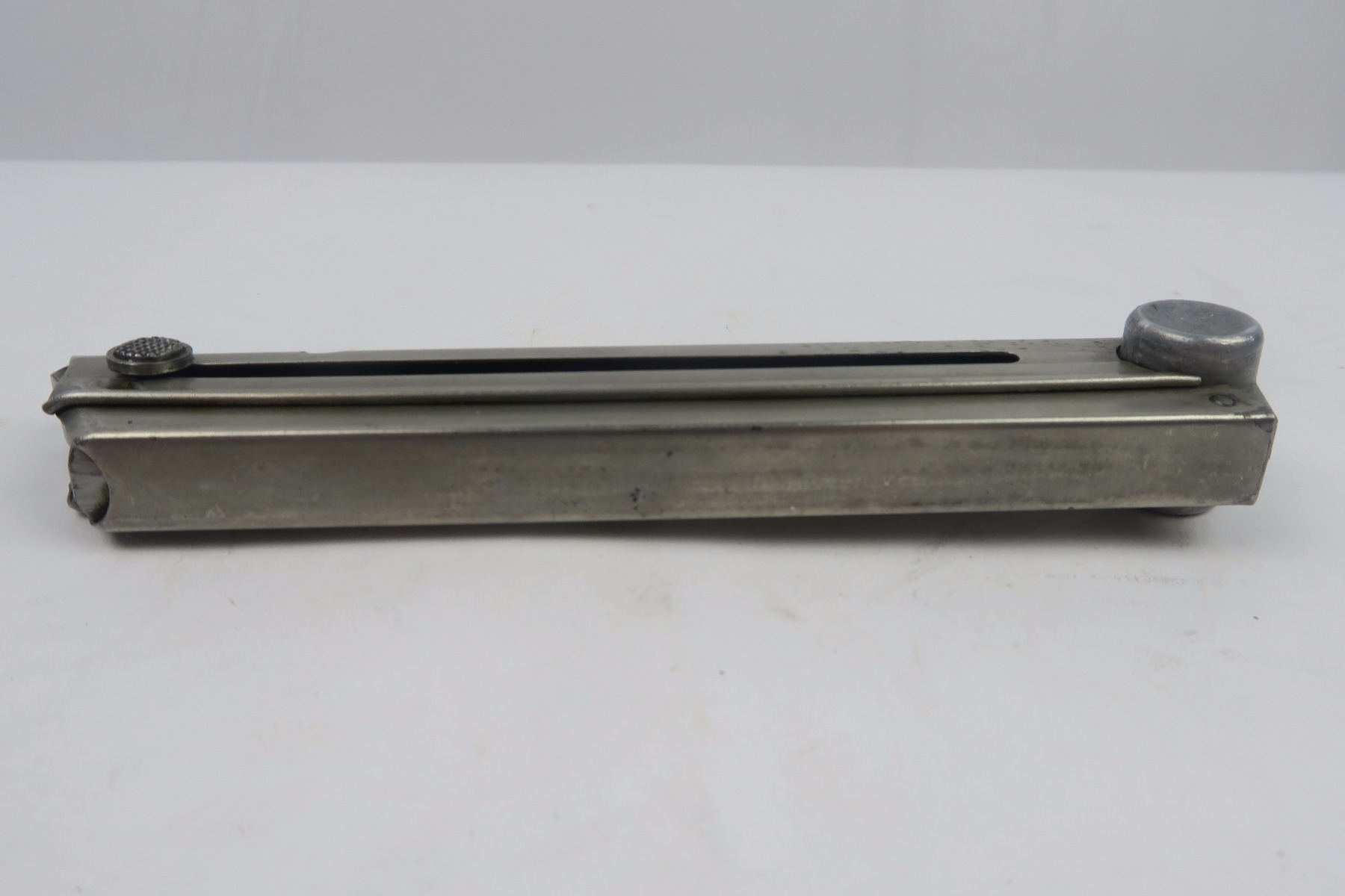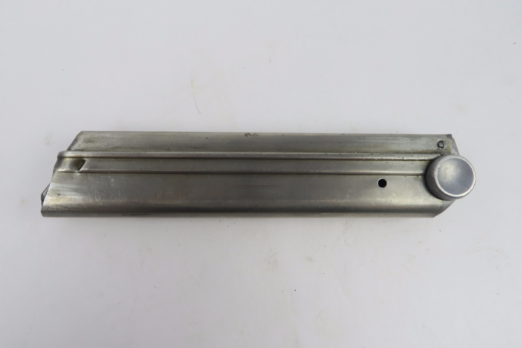 12/6/17 – This is a scarce, early variation Mauser armoreror’s replacement magazine stamped “S/42” on the base. There is no serial number, nor any other marking on the magazine. The magazine frame/tube is nickle, which is an early variation (and even more scarce) compared to the blued tubes. The magazine is in excellent condition, all original and fully functional.