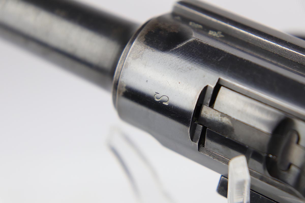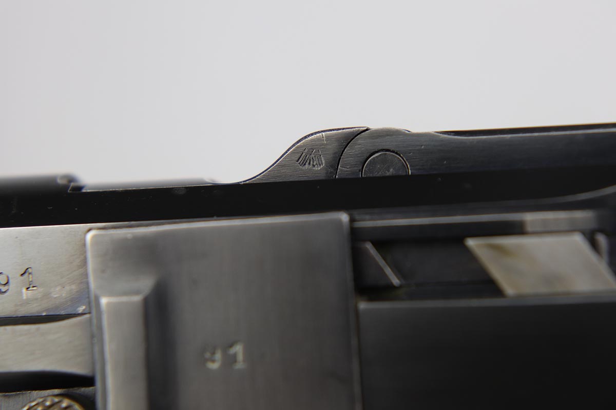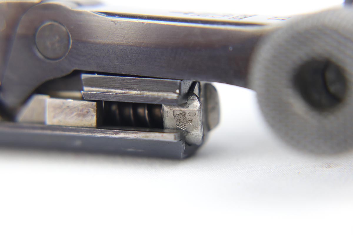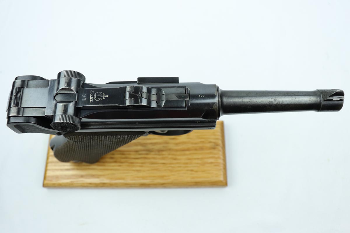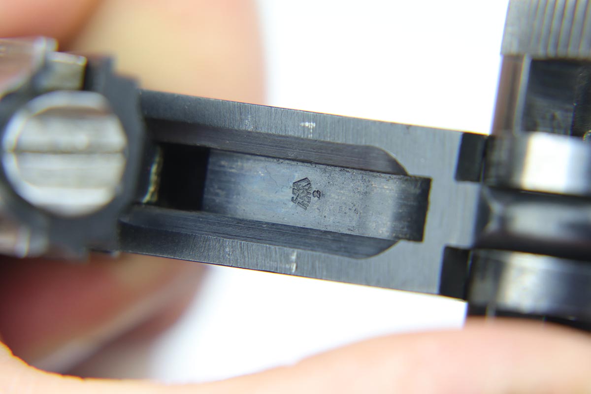 11/20/18 – This is a very early S Code (1935/36) Krieghoff Luger. The serial number is 191 making it one of the earliest recorded HKs. It also has the very early and very rare wood grips. These Krieghoff wood grips are recognizable as they are a bit thicker than the DWM or Mauser grips. The gun has the early logo on the toggle and the external serial markings on the toggle and sideplate (correct early features). All numbered parts are matching except for the magazine. Many parts on the early Krieghoff are NOT numbered including the barrel, the hold open, the rear toggle pin and the firing pin. However these parts are typically HK proofed with the correct Eagle L2 proof. Now for the finish: much of the gun appears to be original finish. The back of the frame has the “tell tale” thumb mark. The toggle, receiver and barrel all appear to be original finish. However, the left side rail and the side plate may have been touched up. In addition, the straw color small parts may have been re-strawed. The magazine is period correct but made by Mauser and not matching numbered ( G Date Mauser magazine from 1935). The bore is a bit cloudy with some wear, but still would rate a 6 out of 10. Despite some “enhancements” this is a nice example of an early and rare Krieghoff. Priced accordingly.