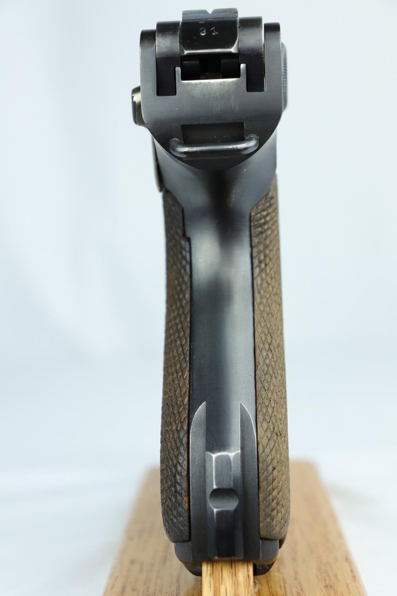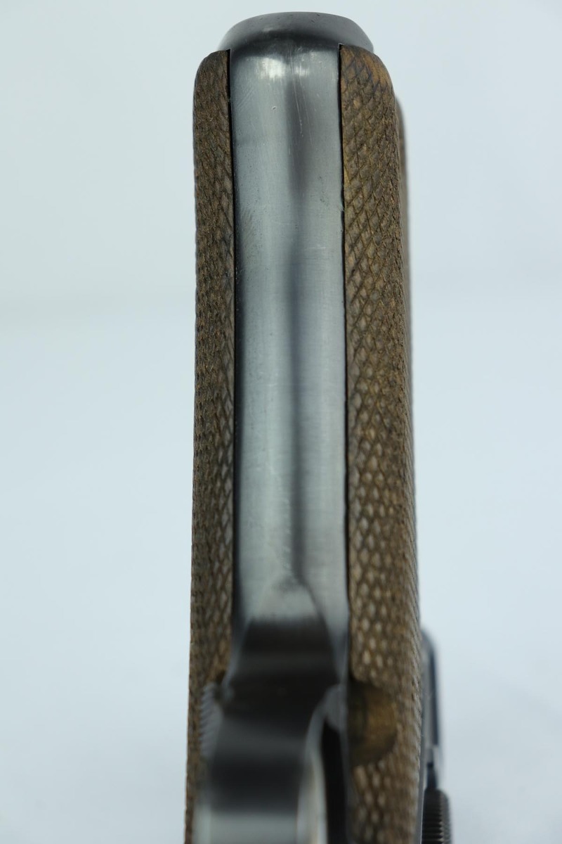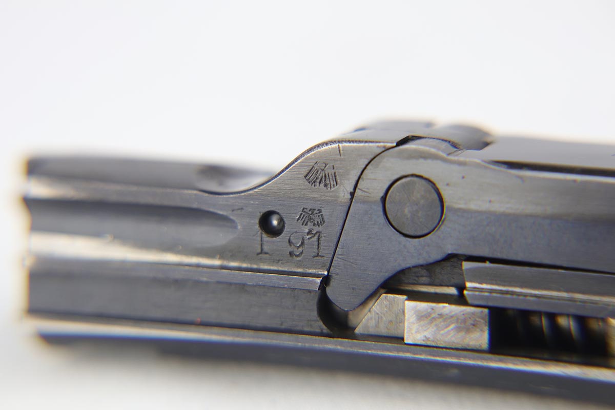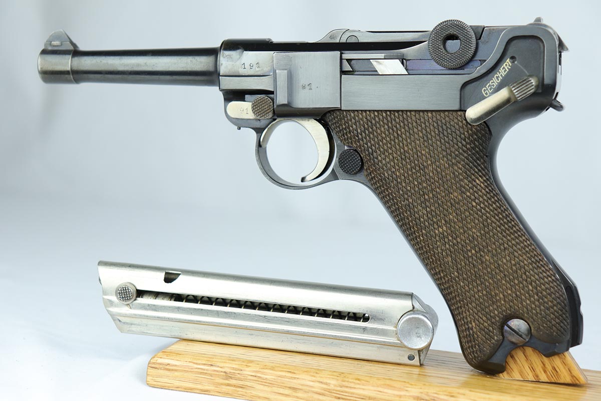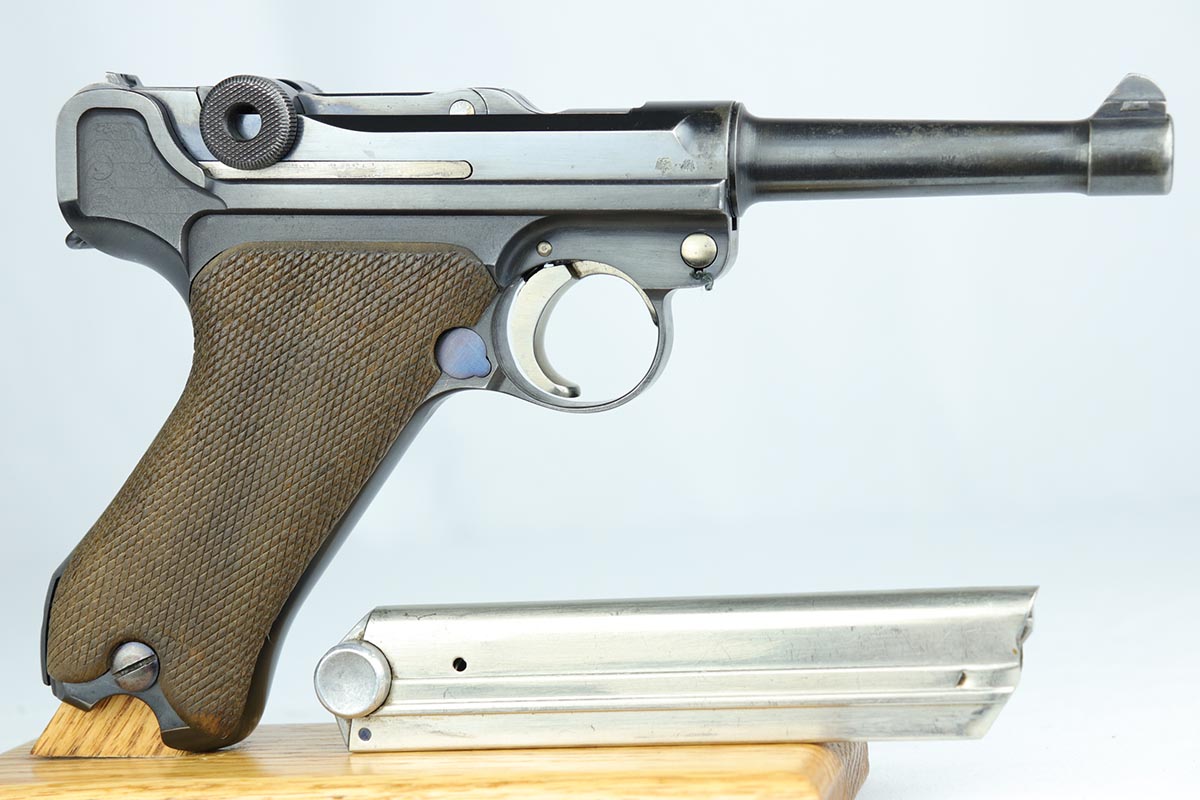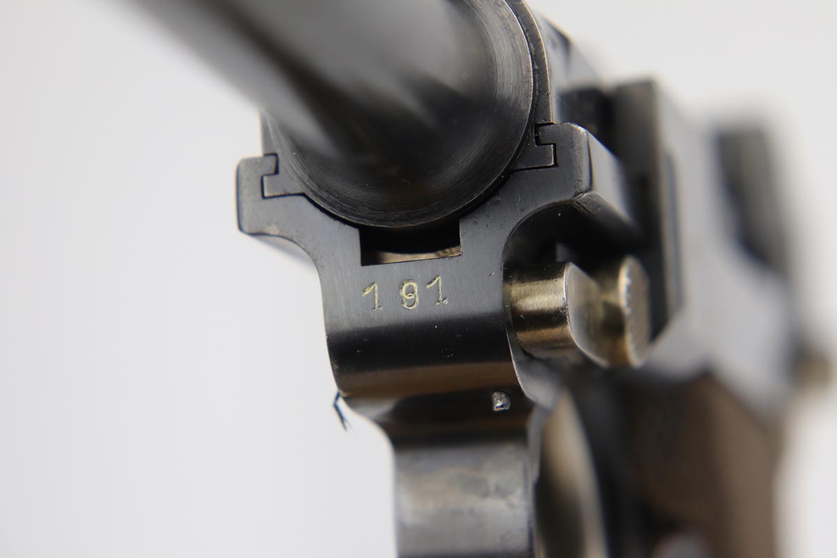 11/20/18 – This is a very early S Code (1935/36) Krieghoff Luger. The serial number is 191 making it one of the earliest recorded HKs. It also has the very early and very rare wood grips. These Krieghoff wood grips are recognizable as they are a bit thicker than the DWM or Mauser grips. The gun has the early logo on the toggle and the external serial markings on the toggle and sideplate (correct early features). All numbered parts are matching except for the magazine. Many parts on the early Krieghoff are NOT numbered including the barrel, the hold open, the rear toggle pin and the firing pin. However these parts are typically HK proofed with the correct Eagle L2 proof. Now for the finish: much of the gun appears to be original finish. The back of the frame has the “tell tale” thumb mark. The toggle, receiver and barrel all appear to be original finish. However, the left side rail and the side plate may have been touched up. In addition, the straw color small parts may have been re-strawed. The magazine is period correct but made by Mauser and not matching numbered ( G Date Mauser magazine from 1935). The bore is a bit cloudy with some wear, but still would rate a 6 out of 10. Despite some “enhancements” this is a nice example of an early and rare Krieghoff. Priced accordingly.