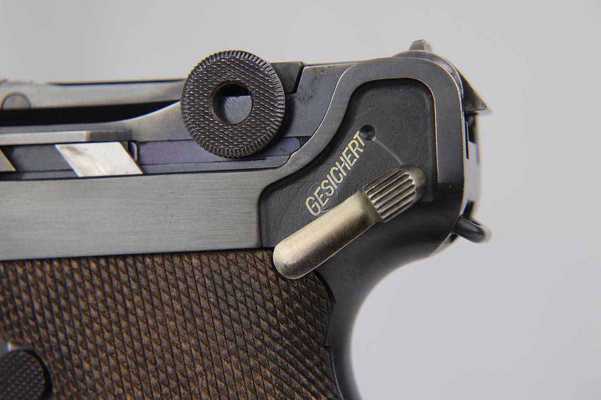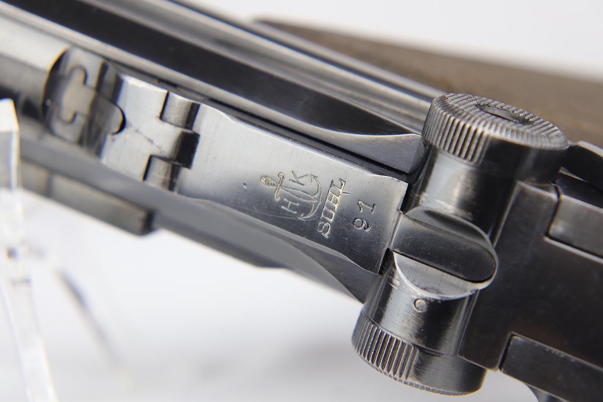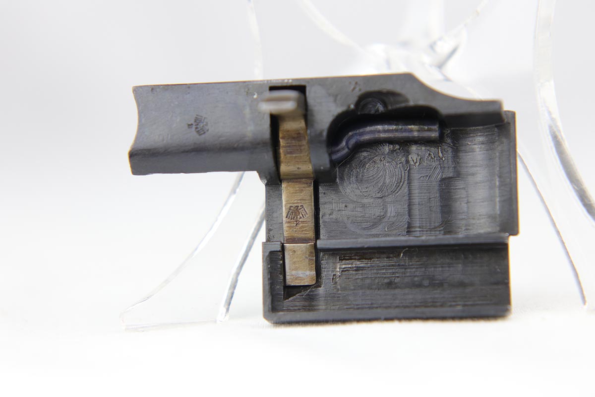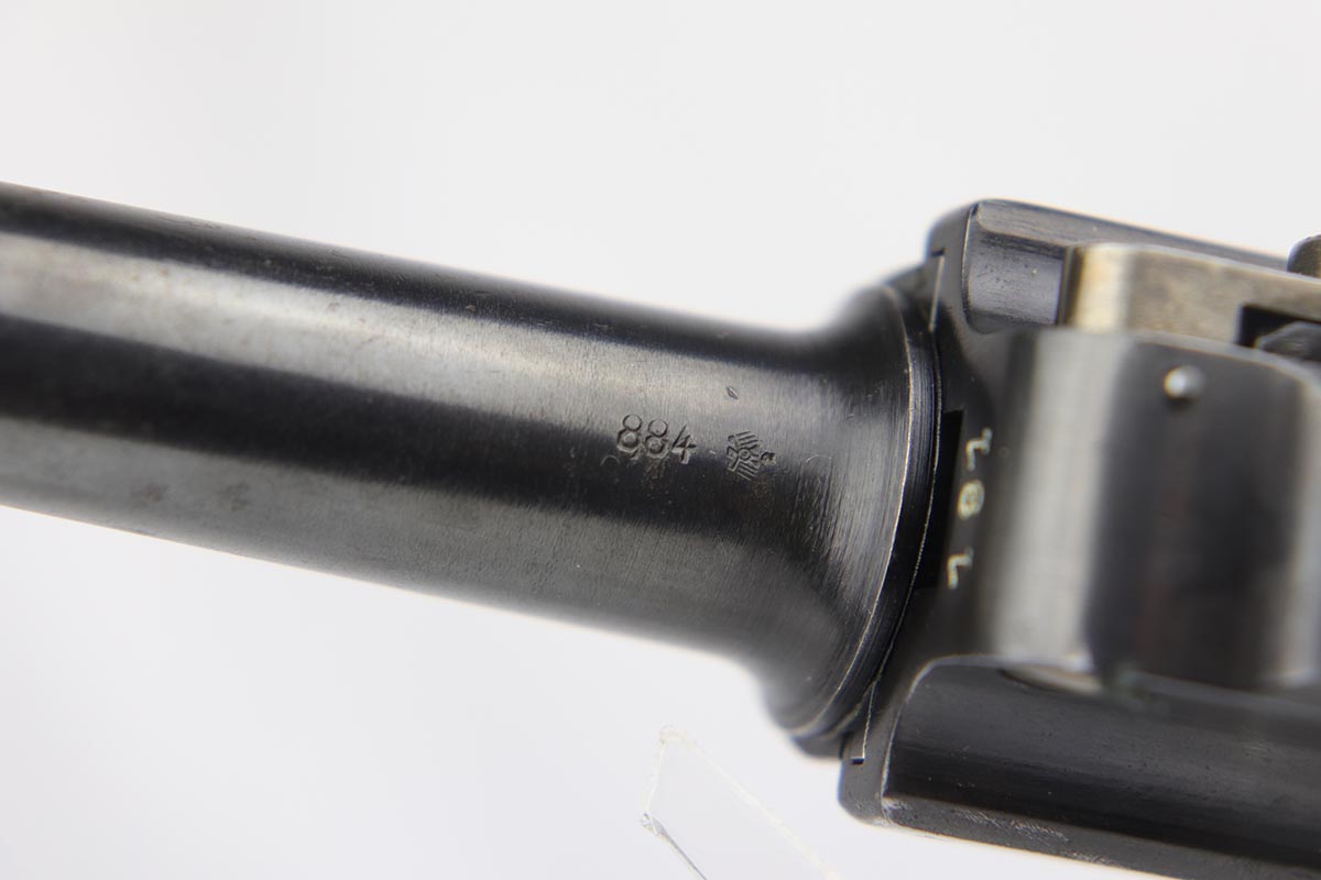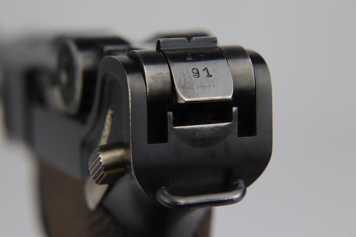 11/20/18 – This is a very early S Code (1935/36) Krieghoff Luger. The serial number is 191 making it one of the earliest recorded HKs. It also has the very early and very rare wood grips. These Krieghoff wood grips are recognizable as they are a bit thicker than the DWM or Mauser grips. The gun has the early logo on the toggle and the external serial markings on the toggle and sideplate (correct early features). All numbered parts are matching except for the magazine. Many parts on the early Krieghoff are NOT numbered including the barrel, the hold open, the rear toggle pin and the firing pin. However these parts are typically HK proofed with the correct Eagle L2 proof. Now for the finish: much of the gun appears to be original finish. The back of the frame has the “tell tale” thumb mark. The toggle, receiver and barrel all appear to be original finish. However, the left side rail and the side plate may have been touched up. In addition, the straw color small parts may have been re-strawed. The magazine is period correct but made by Mauser and not matching numbered ( G Date Mauser magazine from 1935). The bore is a bit cloudy with some wear, but still would rate a 6 out of 10. Despite some “enhancements” this is a nice example of an early and rare Krieghoff. Priced accordingly.