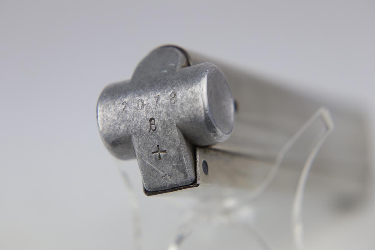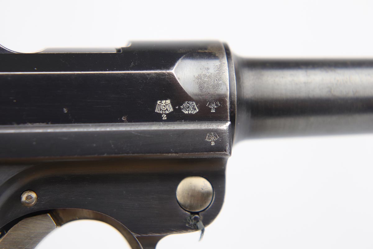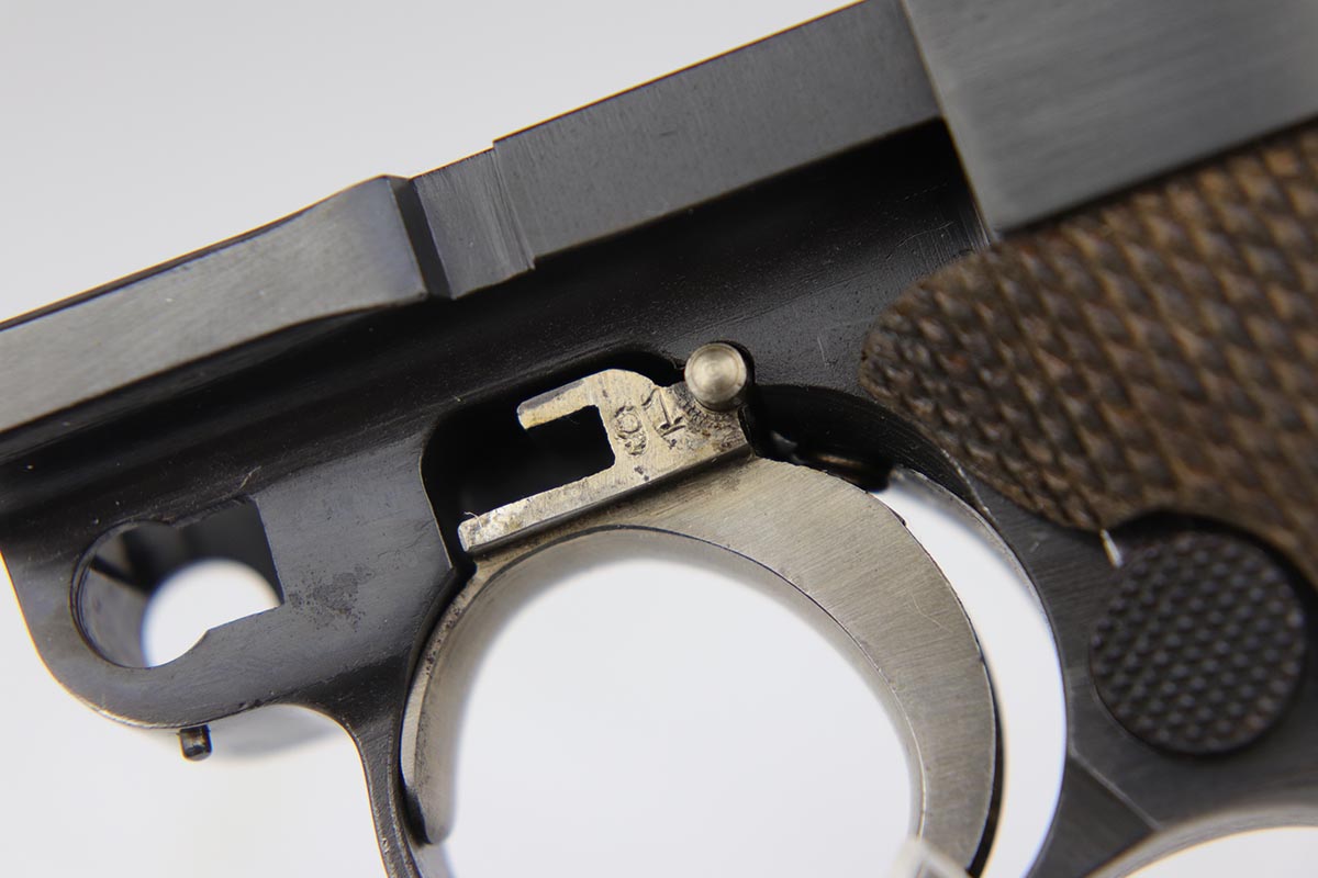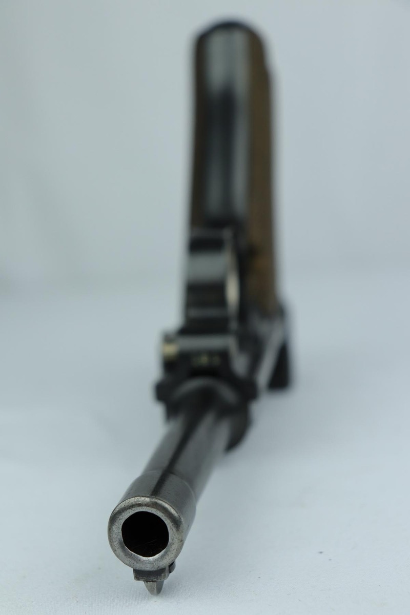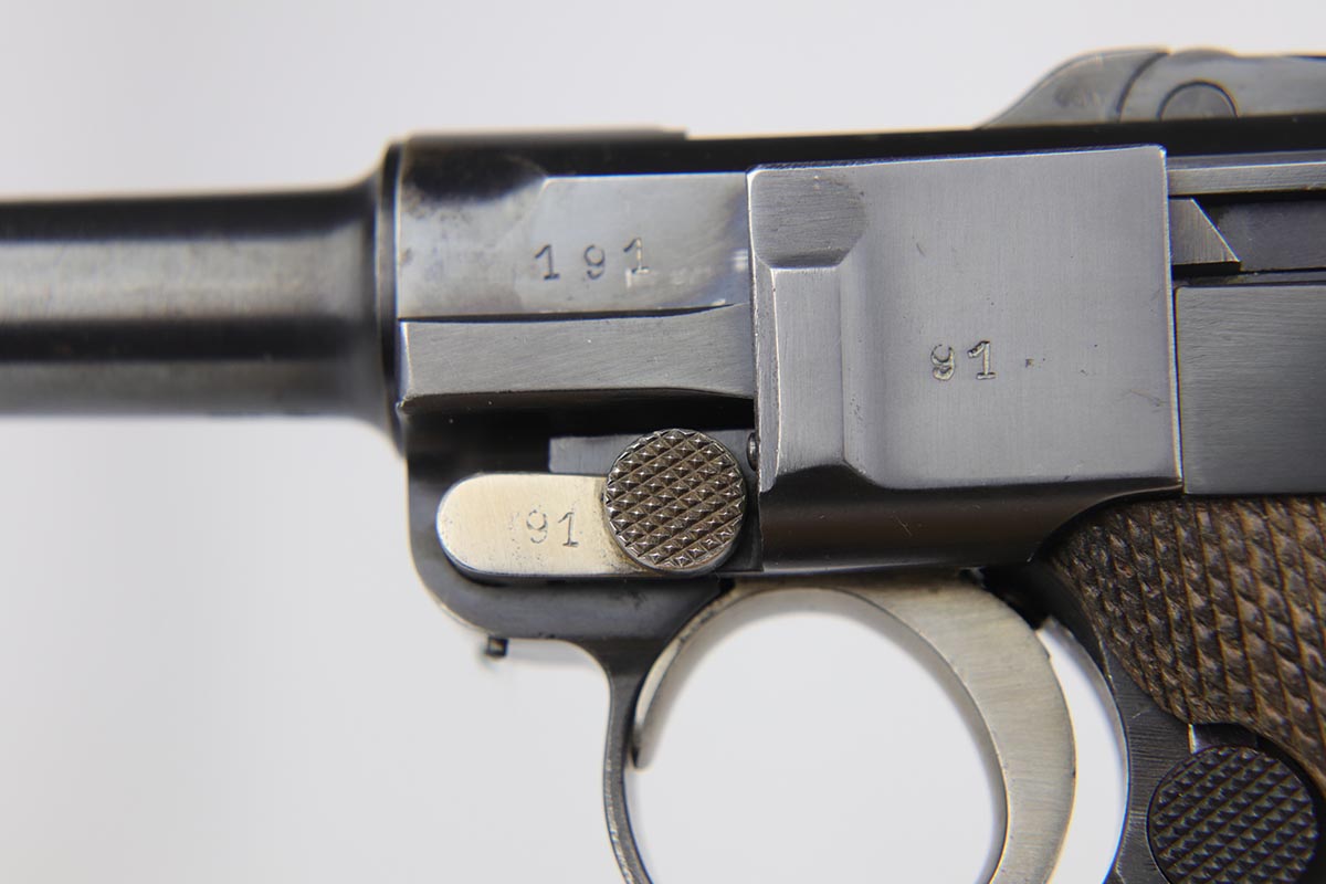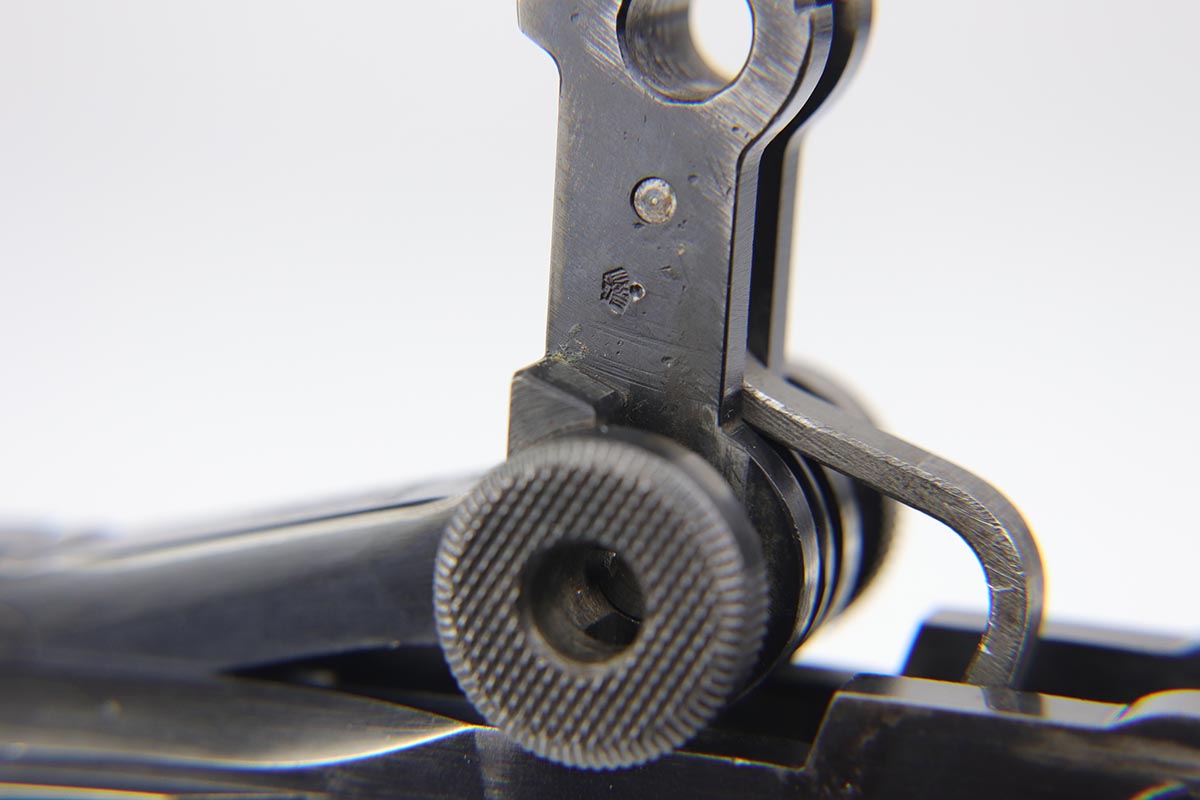 11/20/18 – This is a very early S Code (1935/36) Krieghoff Luger. The serial number is 191 making it one of the earliest recorded HKs. It also has the very early and very rare wood grips. These Krieghoff wood grips are recognizable as they are a bit thicker than the DWM or Mauser grips. The gun has the early logo on the toggle and the external serial markings on the toggle and sideplate (correct early features). All numbered parts are matching except for the magazine. Many parts on the early Krieghoff are NOT numbered including the barrel, the hold open, the rear toggle pin and the firing pin. However these parts are typically HK proofed with the correct Eagle L2 proof. Now for the finish: much of the gun appears to be original finish. The back of the frame has the “tell tale” thumb mark. The toggle, receiver and barrel all appear to be original finish. However, the left side rail and the side plate may have been touched up. In addition, the straw color small parts may have been re-strawed. The magazine is period correct but made by Mauser and not matching numbered ( G Date Mauser magazine from 1935). The bore is a bit cloudy with some wear, but still would rate a 6 out of 10. Despite some “enhancements” this is a nice example of an early and rare Krieghoff. Priced accordingly.