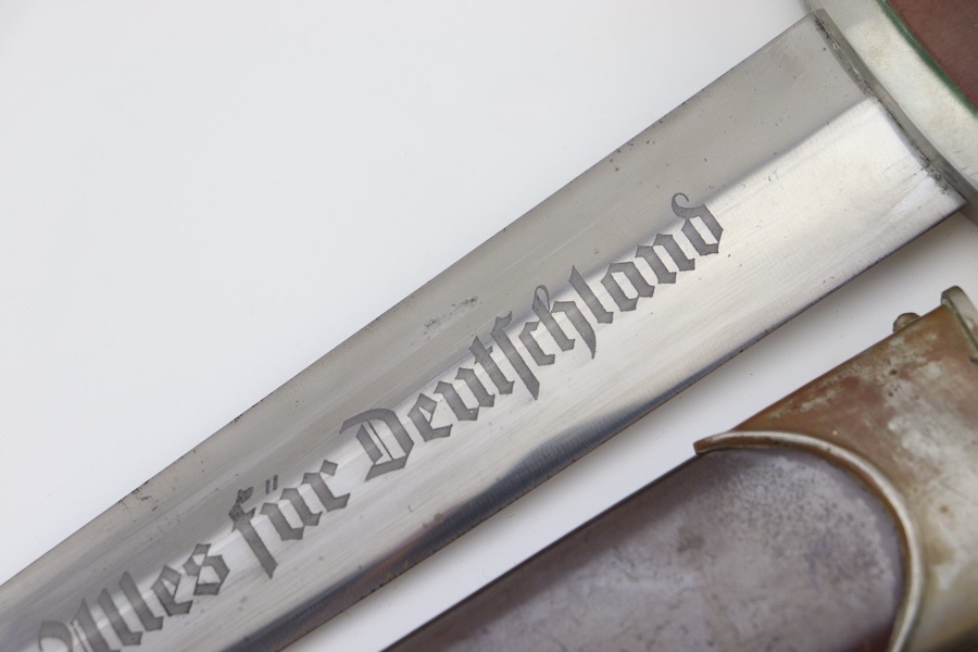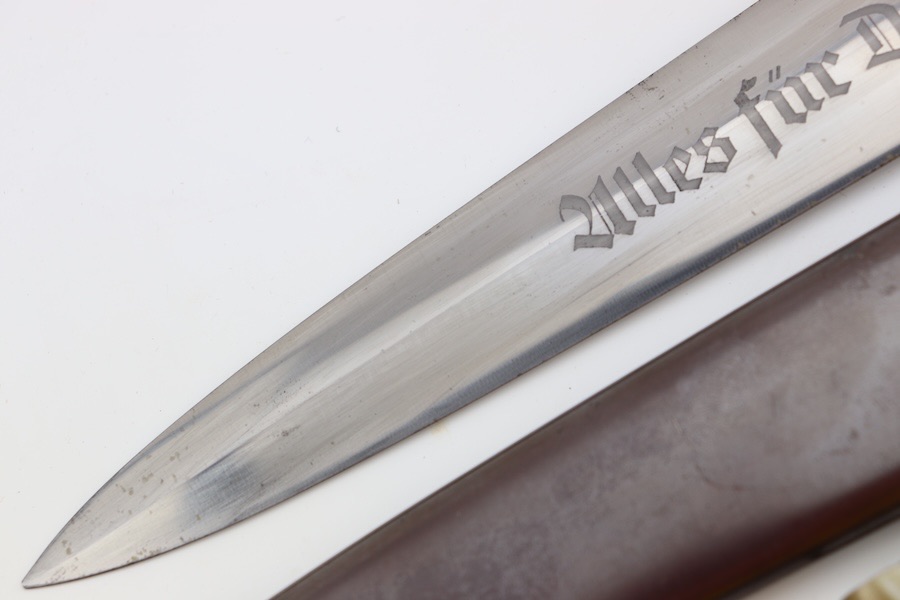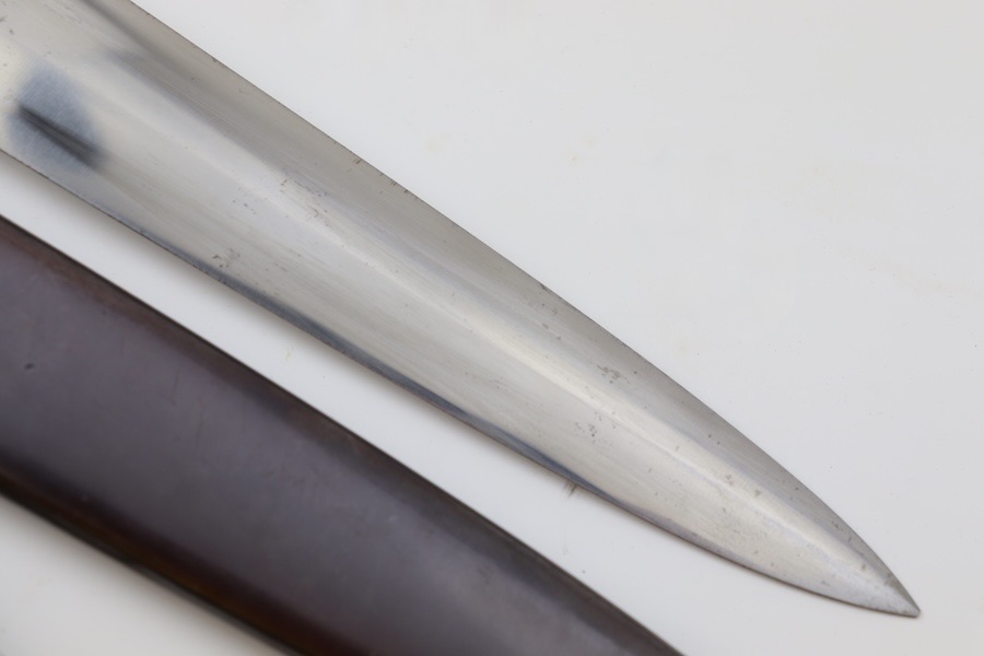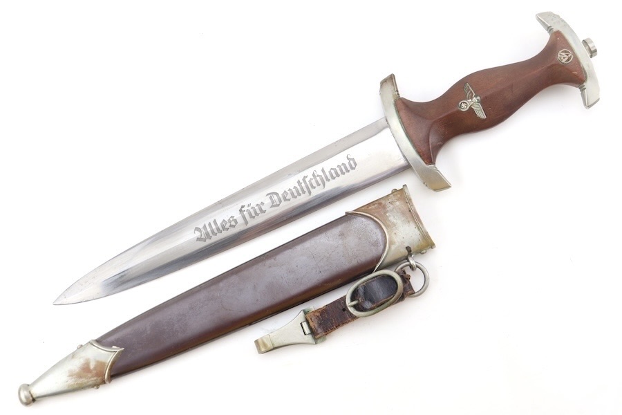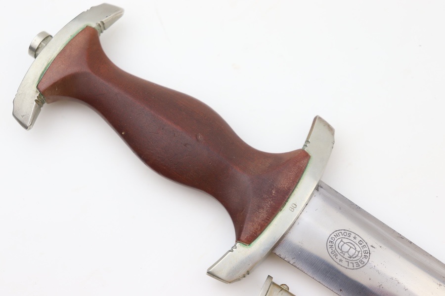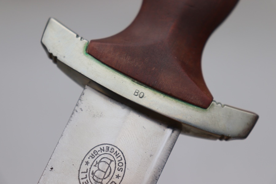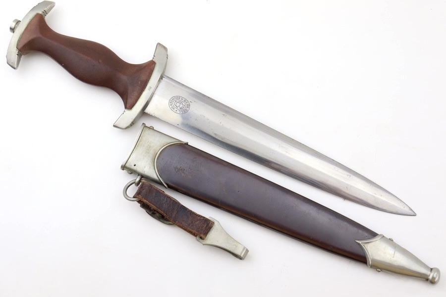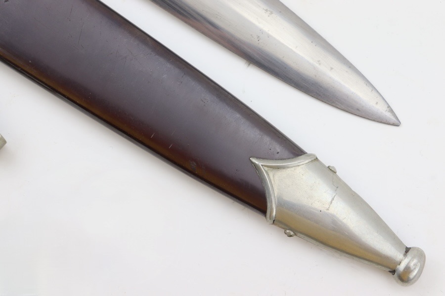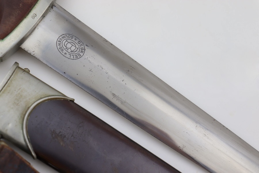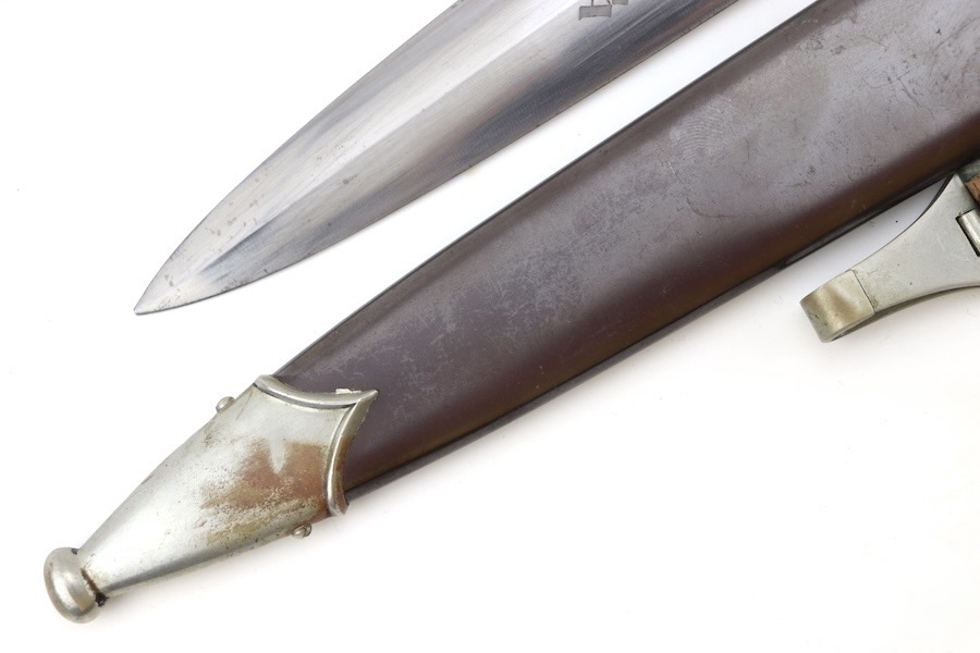 3/7/24 – This is an original WW2 SA Dagger with an original scabbard and attached hanger. The leather strap on the hanger has light cracking but has good structural integrity. The dagger blade has natural scabbard rub wear and areas of light surface patina. There’s still visible cross-graining, and the edges are clean and unsharpened. Nice, crisp maker marking and inscription on the blade. The cross guards are early nickel and non-magnetic. The lower cross guard is “BO” Gruppe stamped. The cross guards have a nice natural patina and no significant issues or unsightly discoloration. The wood handle has a few minor surface scuffs with no chips or cracks. There’s some discoloration on the emblem embedded in the grip. The scabbard has an early brown anodized finish and has a few minor spots of speckled patina. Discoloration on the metal accent tip and mouth. A very nice early example with some honest wear and aging.