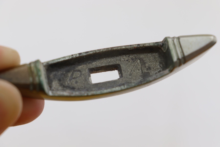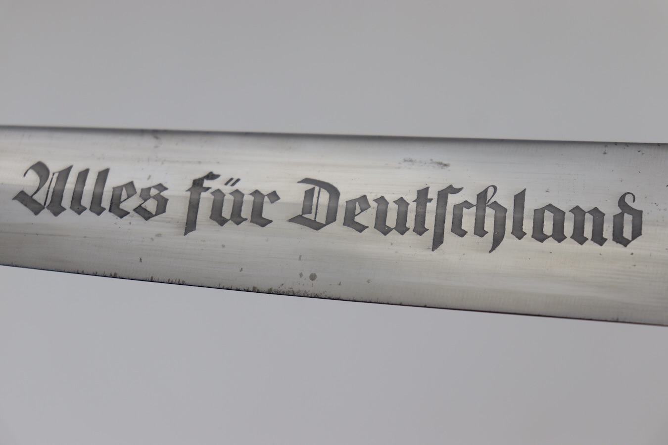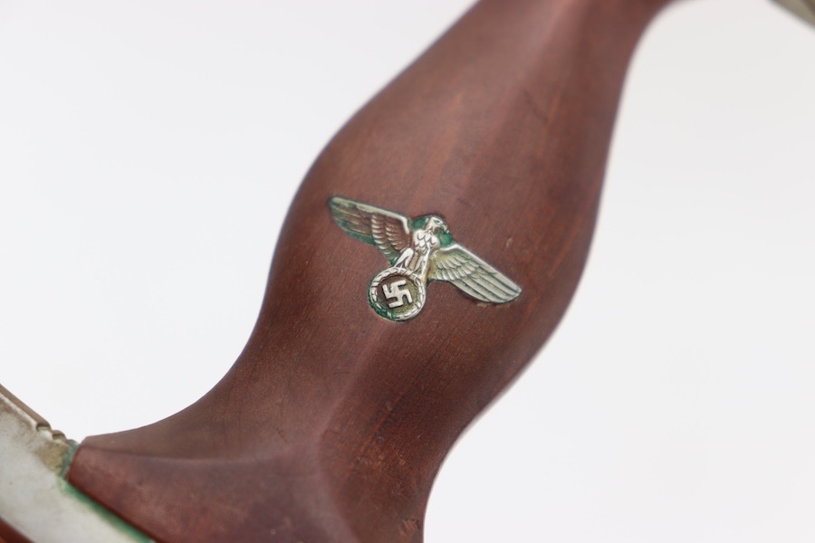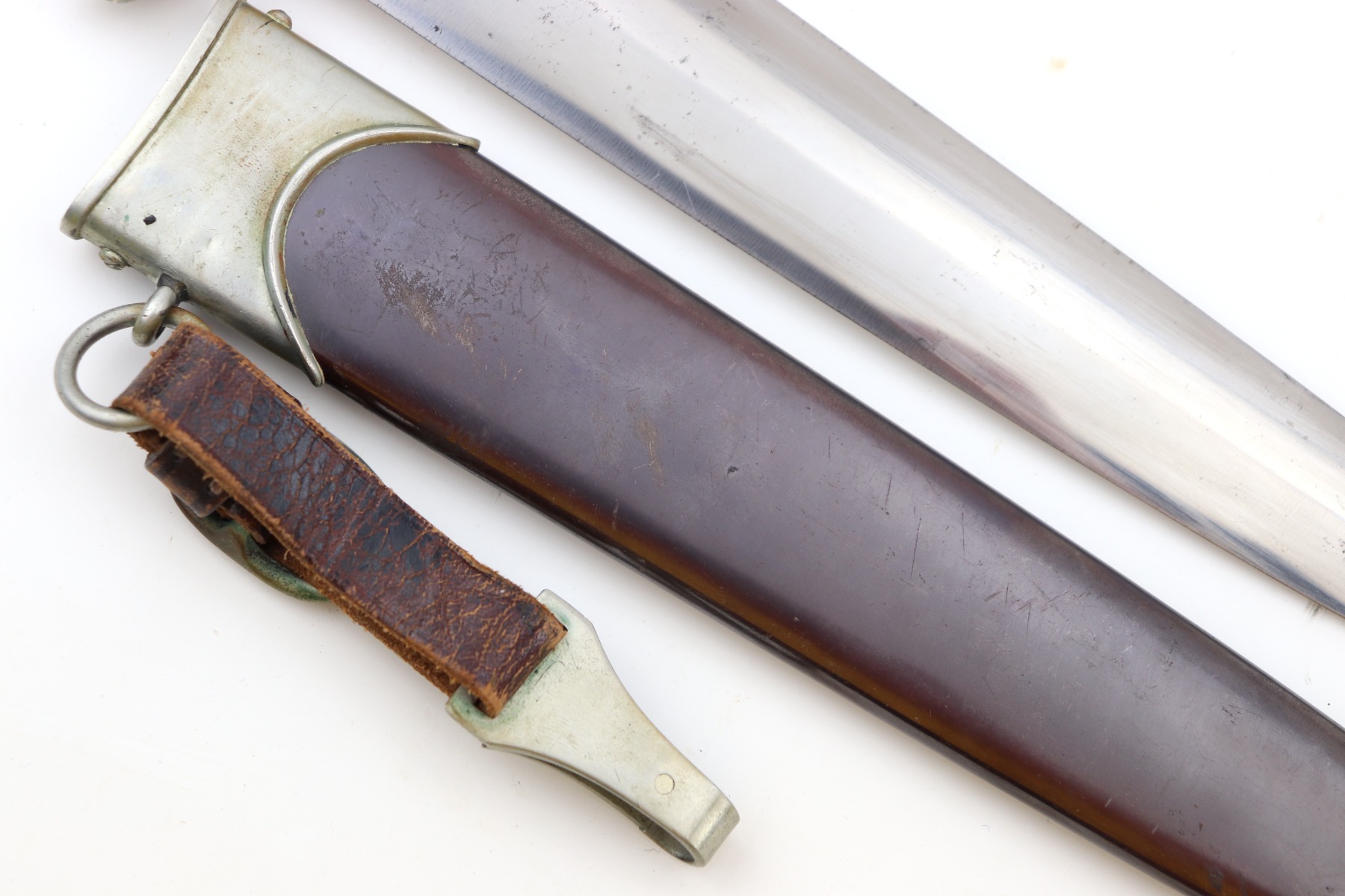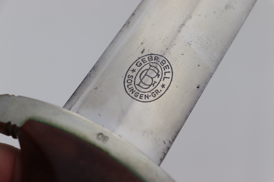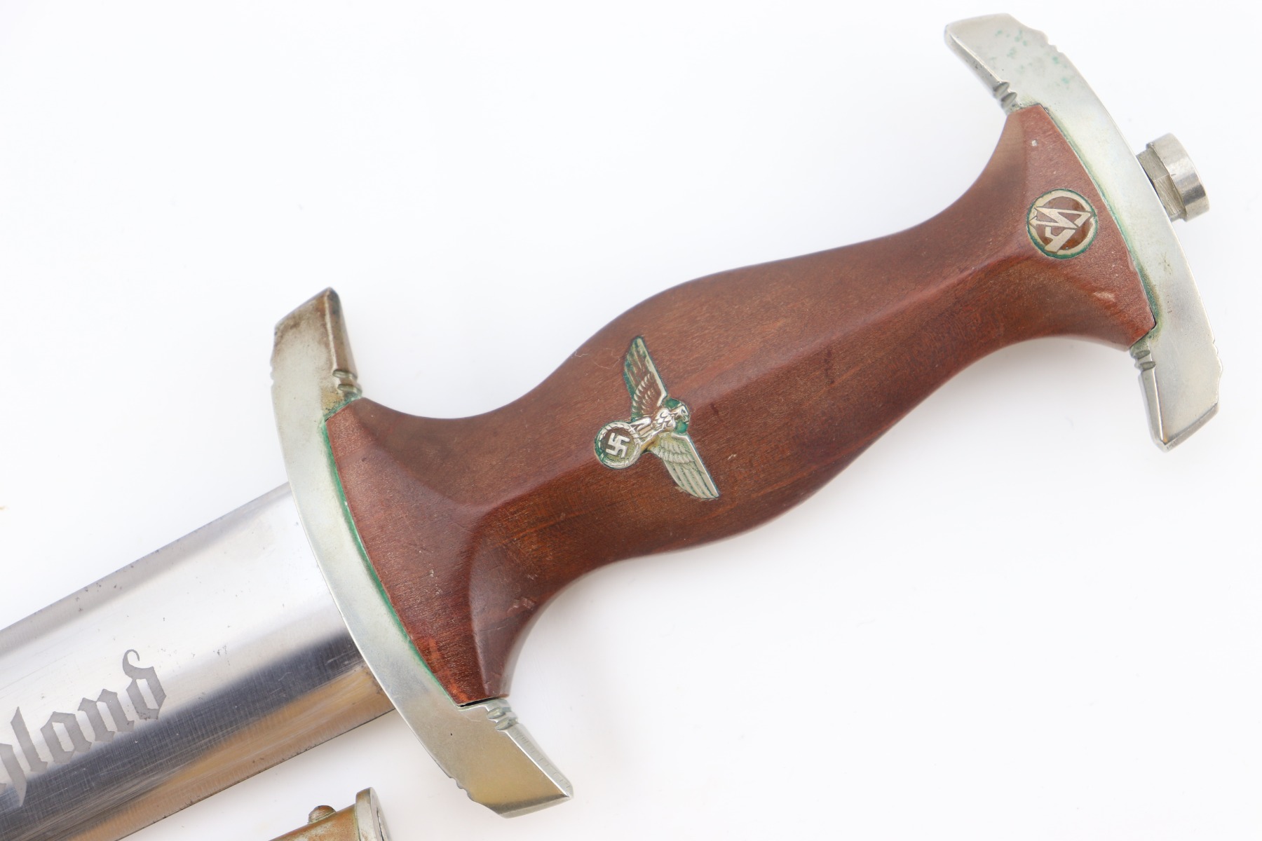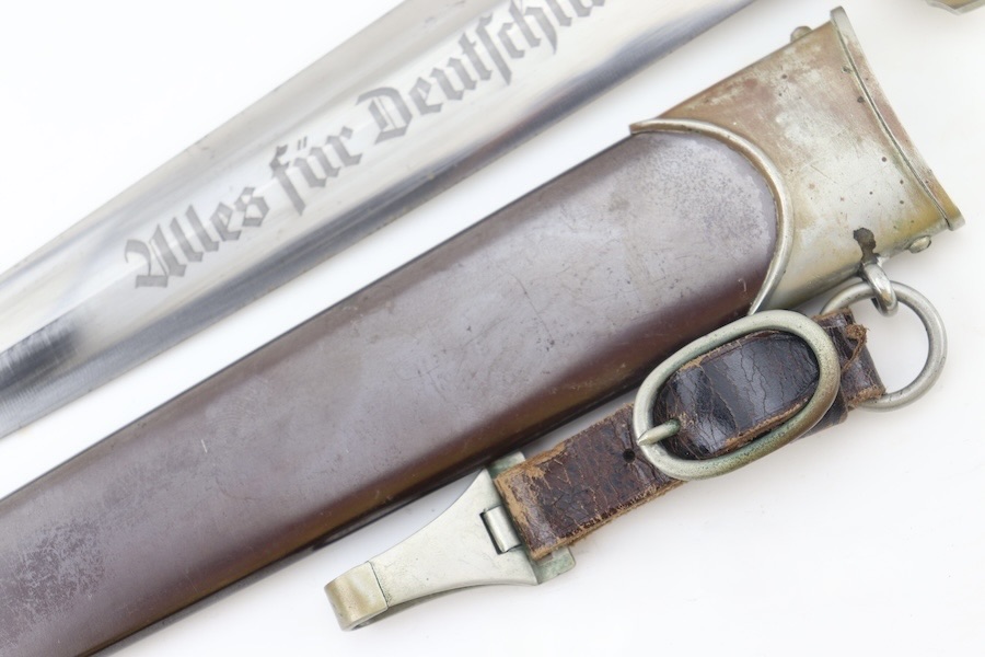 3/7/24 – This is an original WW2 SA Dagger with an original scabbard and attached hanger. The leather strap on the hanger has light cracking but has good structural integrity. The dagger blade has natural scabbard rub wear and areas of light surface patina. There’s still visible cross-graining, and the edges are clean and unsharpened. Nice, crisp maker marking and inscription on the blade. The cross guards are early nickel and non-magnetic. The lower cross guard is “BO” Gruppe stamped. The cross guards have a nice natural patina and no significant issues or unsightly discoloration. The wood handle has a few minor surface scuffs with no chips or cracks. There’s some discoloration on the emblem embedded in the grip. The scabbard has an early brown anodized finish and has a few minor spots of speckled patina. Discoloration on the metal accent tip and mouth. A very nice early example with some honest wear and aging.