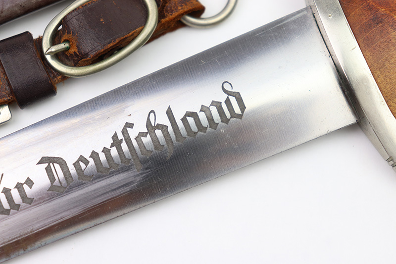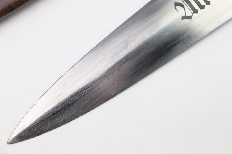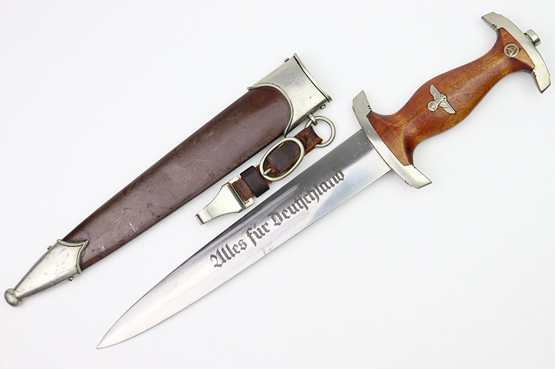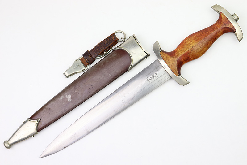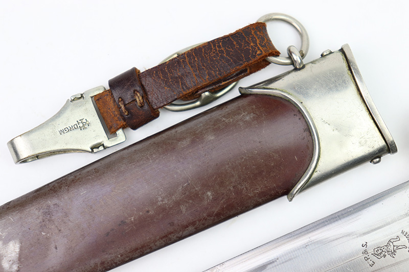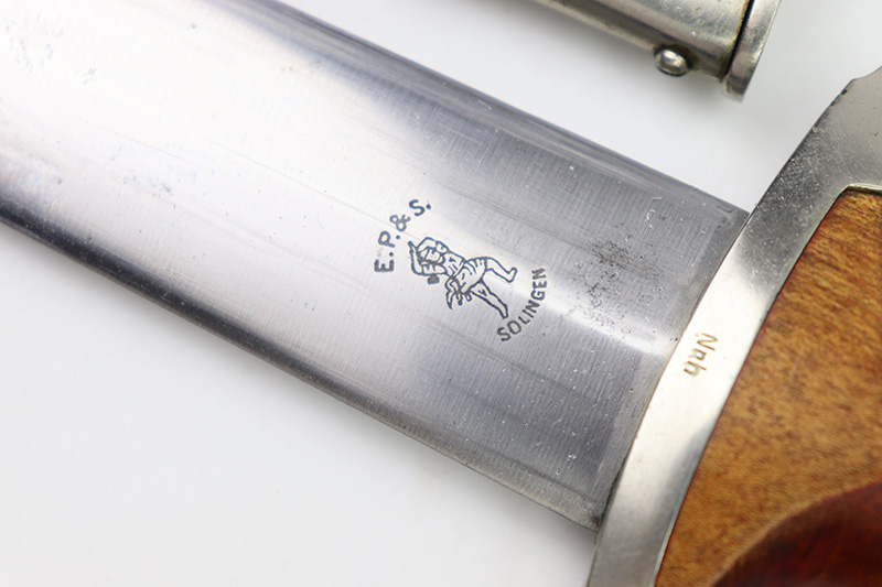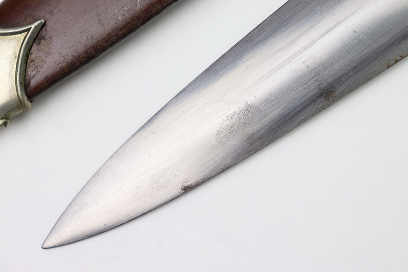 11/22/22 – This is an original SA Dagger by E. Pack & Sohne. The dagger has a fairly clean, shiny blade in great overall condition. There’s no signs of sharpening along the edge, and cross graining is visible on each side. There is some spotty discoloration and mild speckling on the blade, as well as surface scratches and scabbard wear. The cross guard is SA Gruppe stamped “Nrh” on one side. The cross guard and pommel are in great condition with mild patina. Early nickel with early style emblems on the wood handle. No cracks or chips in the wood handle. The scabbard is the earlier brown anodized metal style, with thinning throughout and a few mild dings in the metal. The hanger is in good condition with some mild surface wrinkling and maker stamped by Assmann.