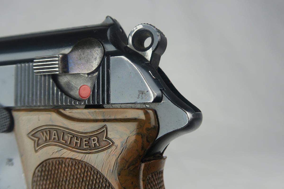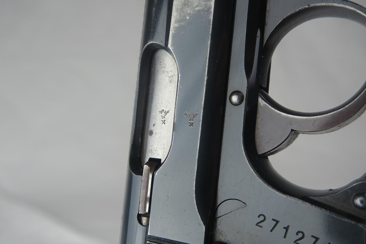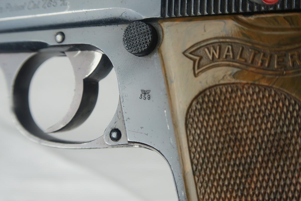 8/14/17 – This is a rare and early waffen PPK, with E/359 proof on frame and slide rather than the more common WaA359. It is a vet bringback that was brought to us by the vet’s children. There were only 3,500 of this variation produced, with high-polish blue and Eagle/N proofs. Bluing rates at 92-93% with some muzzle wear and a notable area of finish loss on the right side of the slide. Excellent grip with no cracks or chips. Correct magazine. Common theory on these guns is that all of the early waffen PPK’s were issued to the Luftwaffe. Very nice bore with no major flaws.