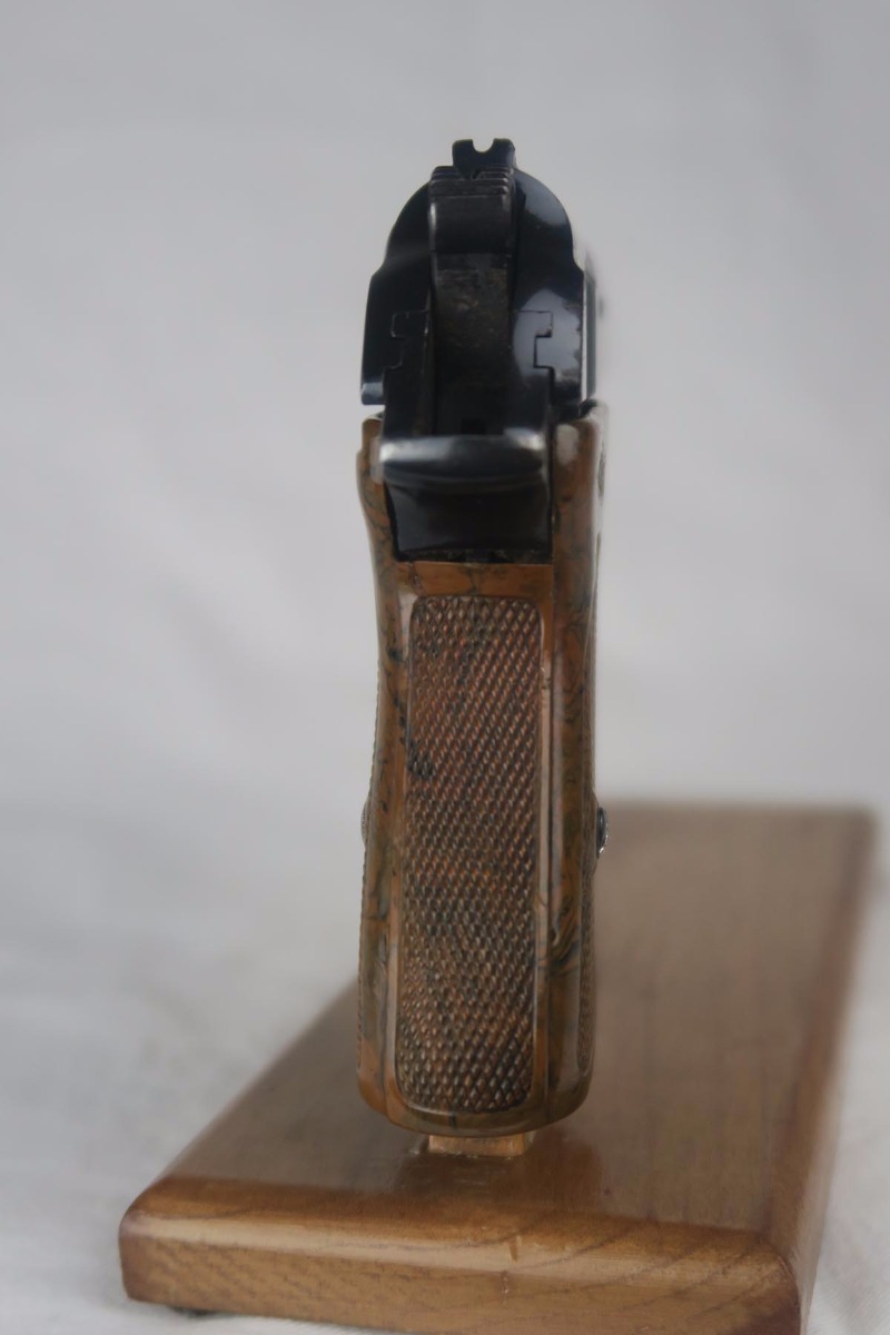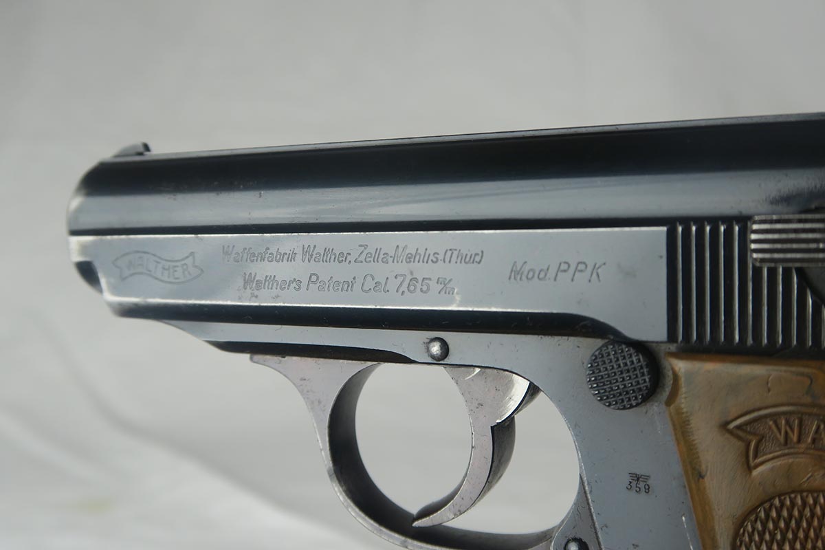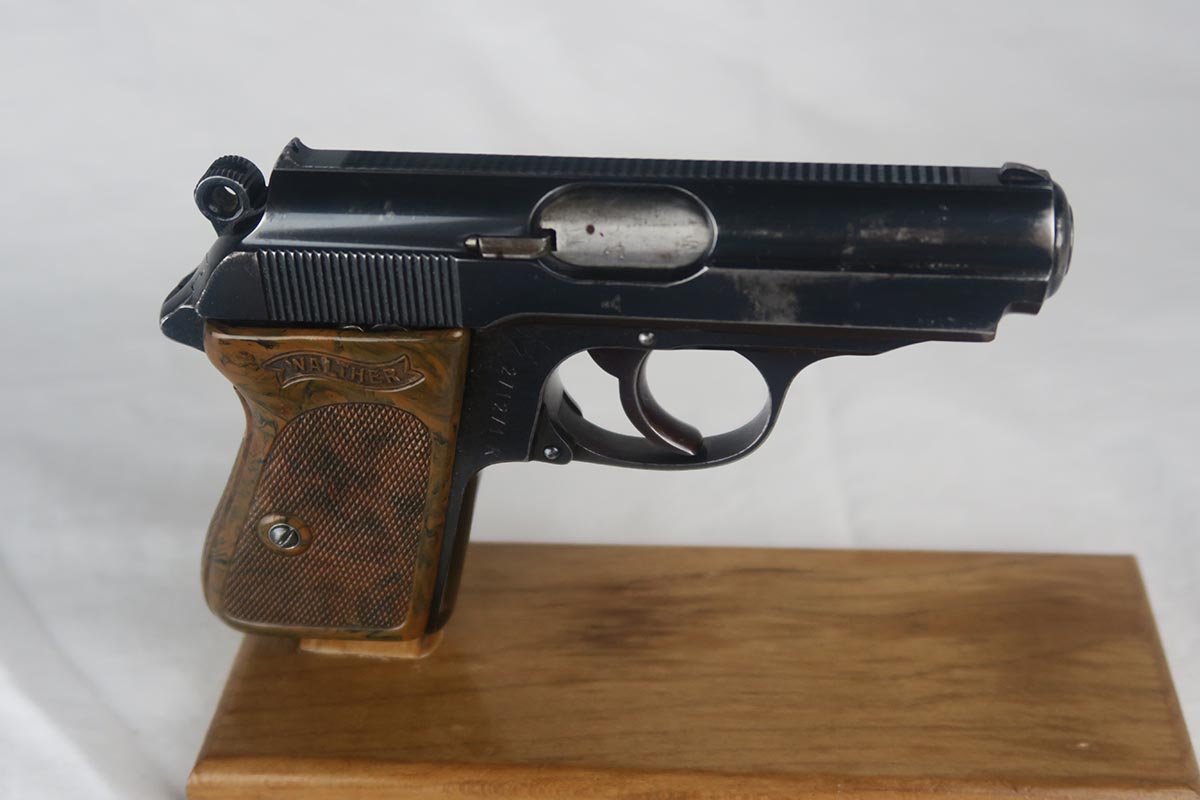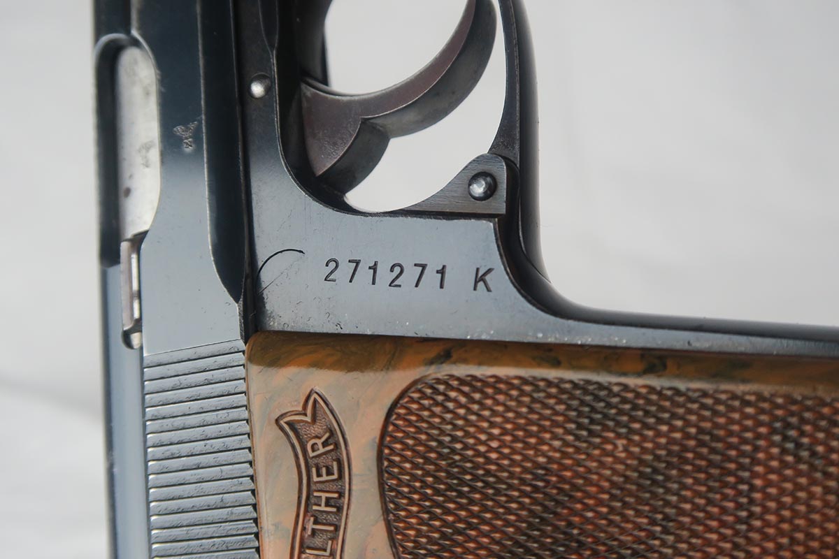 8/14/17 – This is a rare and early waffen PPK, with E/359 proof on frame and slide rather than the more common WaA359. It is a vet bringback that was brought to us by the vet’s children. There were only 3,500 of this variation produced, with high-polish blue and Eagle/N proofs. Bluing rates at 92-93% with some muzzle wear and a notable area of finish loss on the right side of the slide. Excellent grip with no cracks or chips. Correct magazine. Common theory on these guns is that all of the early waffen PPK’s were issued to the Luftwaffe. Very nice bore with no major flaws.