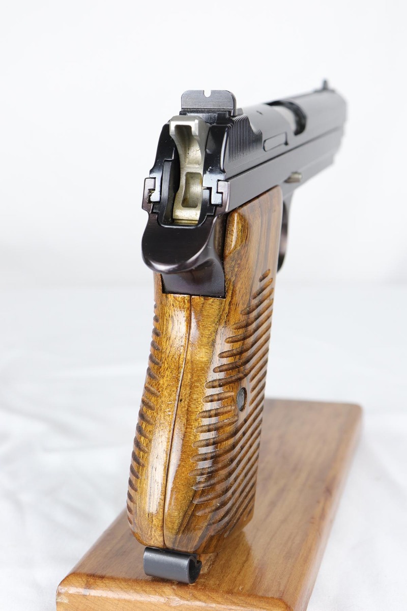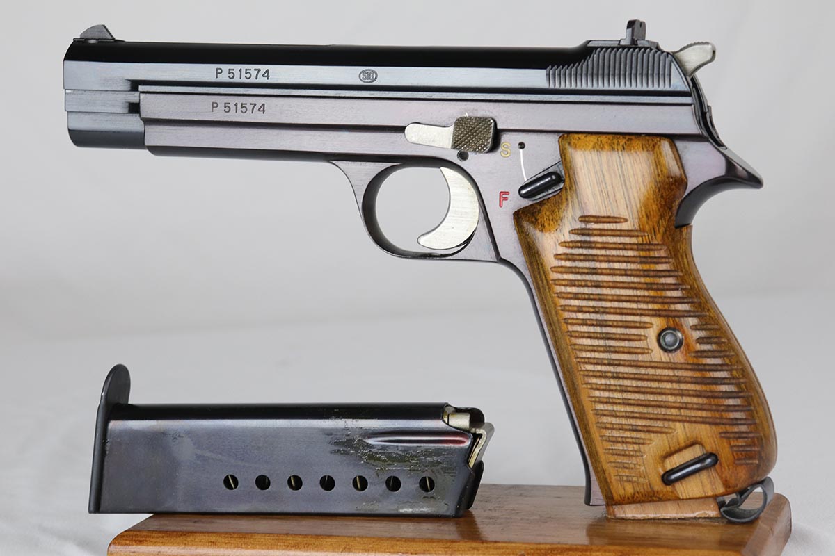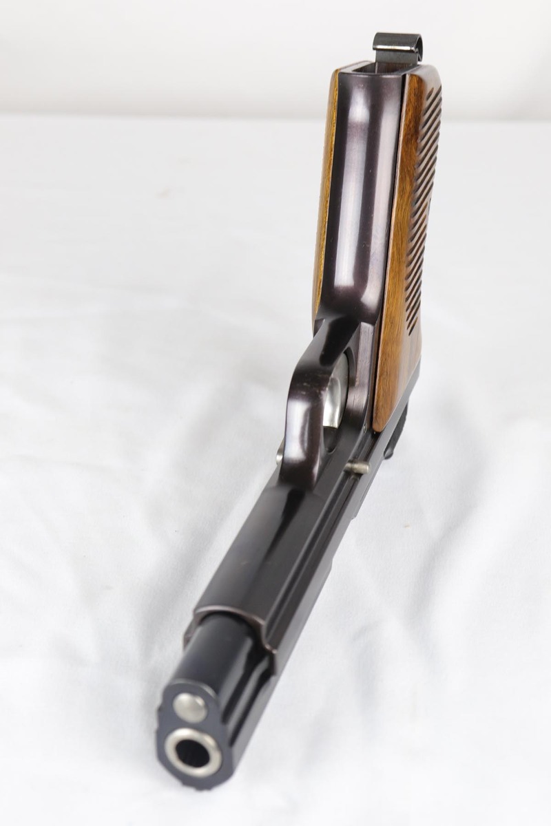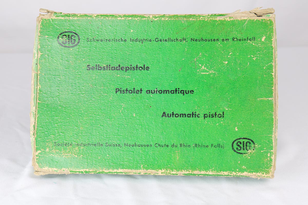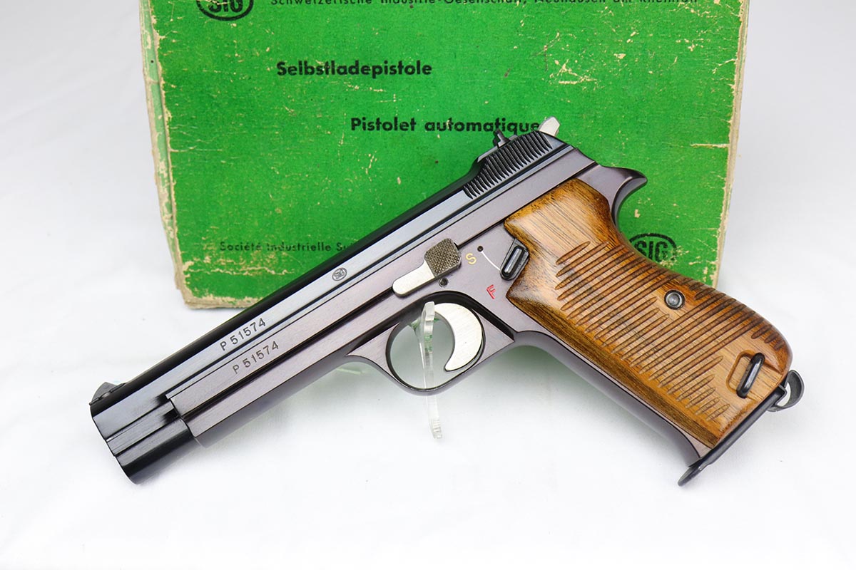 4/17/18 – This is an absolutely incredible, early Sig P210 that was made in the late 1940’s and is probably a first or a second year production gun. Serialization for Sig P210 models started at 50,000 and this gun falls into the first batch of 2,000 – actually the 1,574th made. It is in as new original condition with no wear evident. We don’t believe it was ever shot after leaving the factory . All matching with mint grips and bore. The bluing is the early Sig lustrous high polished blue that was only used in the beginning of the production run before being superseded by a more durable but less aesthetically pleasing dull finish. The early green box is original and numbered to the gun. It shows age appropriate wear but is all intact with no pieces missing. SIG P210 is universally considered to be the best “out of the box” semi-auto ever made, compared by many to a high quality Swiss watch. The slide design with the slide rails running inside the frame eliminates any slop between the two and the tolerances are nothing short of amazing. The trigger rivals the triggers of the custom tuned guns. Used by the Swiss Army and West German Border forces, Sig P210 was also the favorite of many target shooters, including the Swiss Olympic team of the era. It is near impossible to find an early high polished Sig in such outstanding condition.