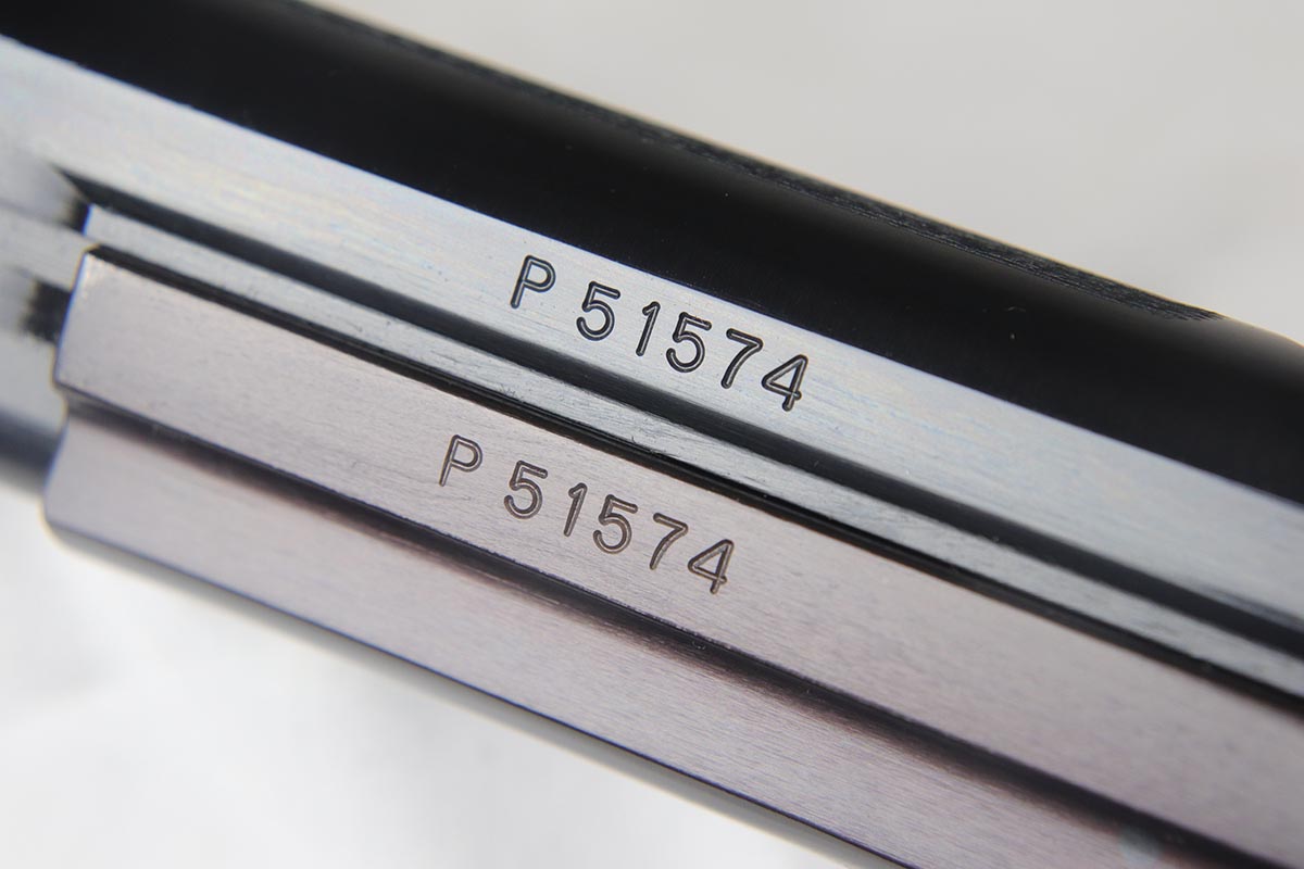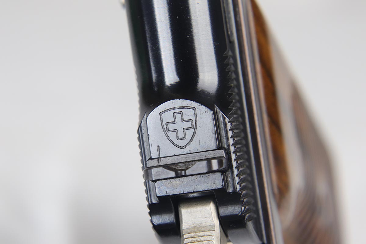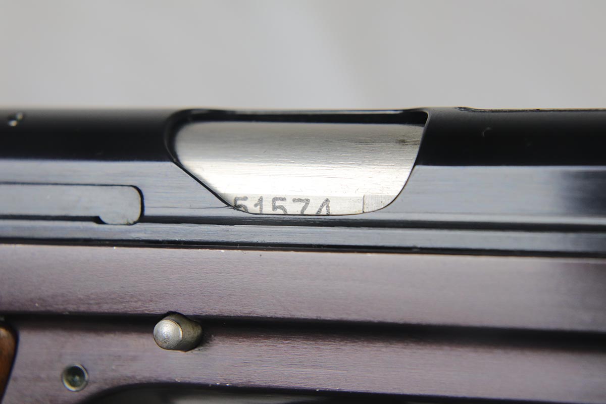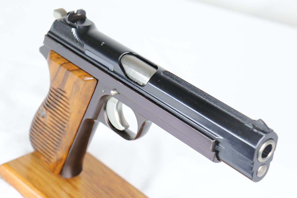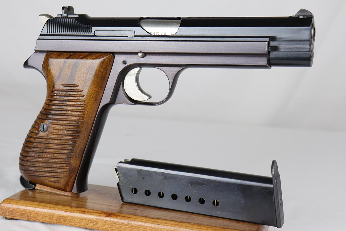 4/17/18 – This is an absolutely incredible, early Sig P210 that was made in the late 1940’s and is probably a first or a second year production gun. Serialization for Sig P210 models started at 50,000 and this gun falls into the first batch of 2,000 – actually the 1,574th made. It is in as new original condition with no wear evident. We don’t believe it was ever shot after leaving the factory . All matching with mint grips and bore. The bluing is the early Sig lustrous high polished blue that was only used in the beginning of the production run before being superseded by a more durable but less aesthetically pleasing dull finish. The early green box is original and numbered to the gun. It shows age appropriate wear but is all intact with no pieces missing. SIG P210 is universally considered to be the best “out of the box” semi-auto ever made, compared by many to a high quality Swiss watch. The slide design with the slide rails running inside the frame eliminates any slop between the two and the tolerances are nothing short of amazing. The trigger rivals the triggers of the custom tuned guns. Used by the Swiss Army and West German Border forces, Sig P210 was also the favorite of many target shooters, including the Swiss Olympic team of the era. It is near impossible to find an early high polished Sig in such outstanding condition.