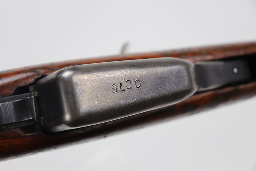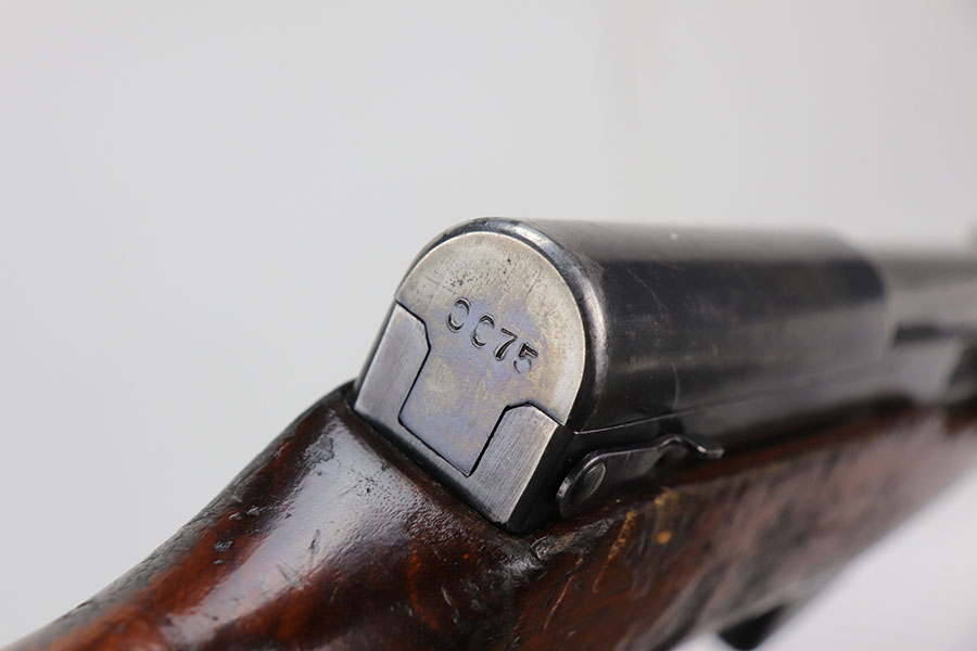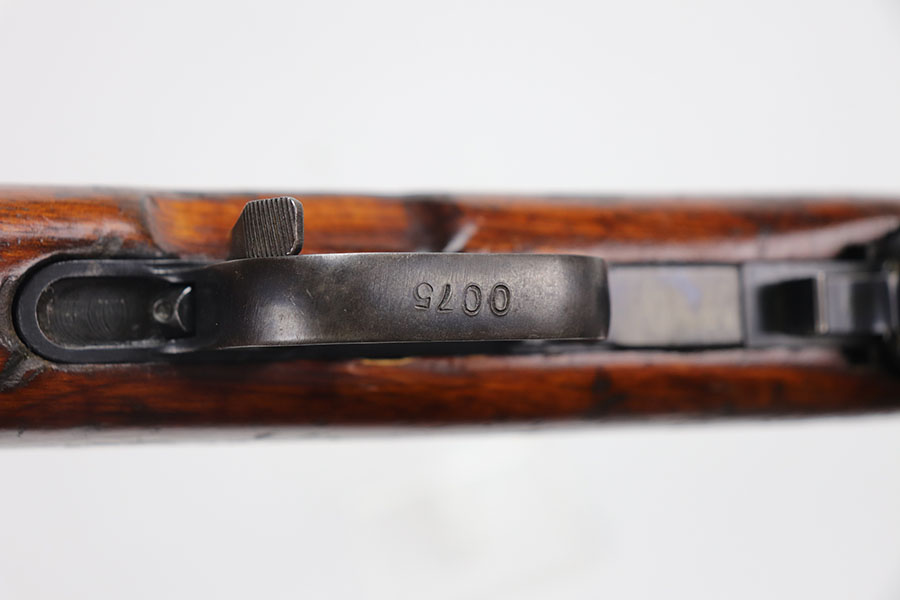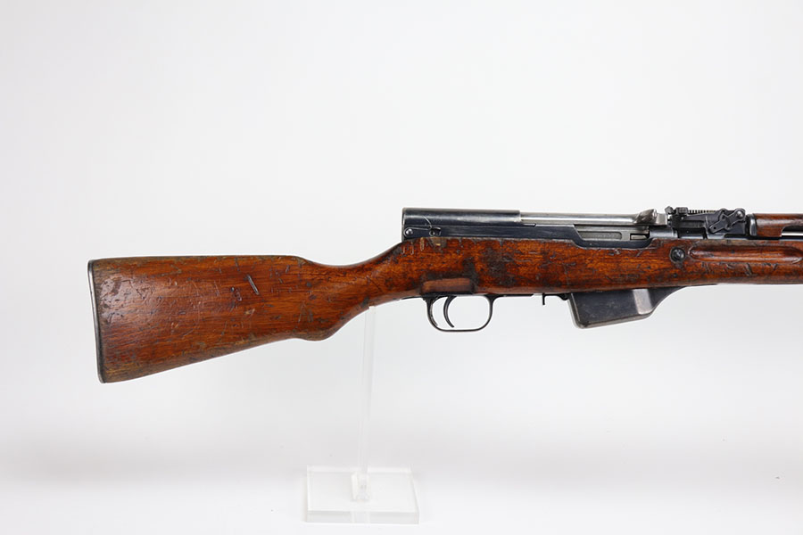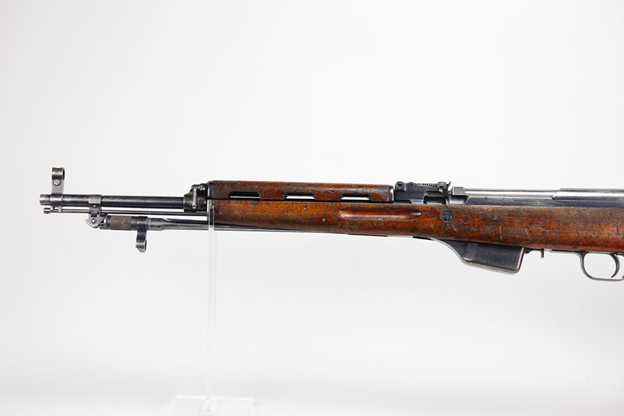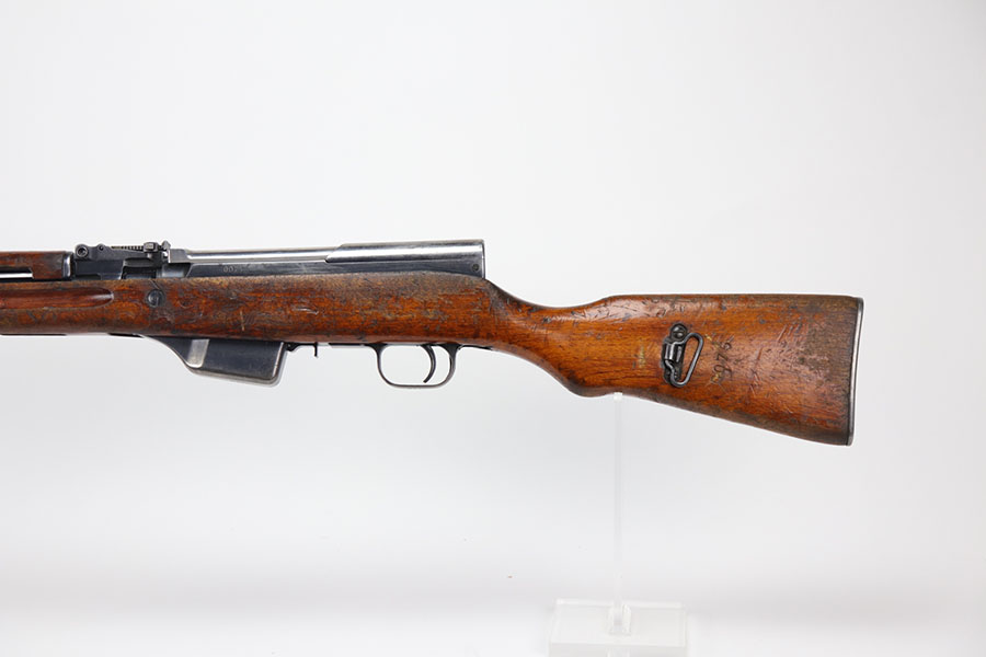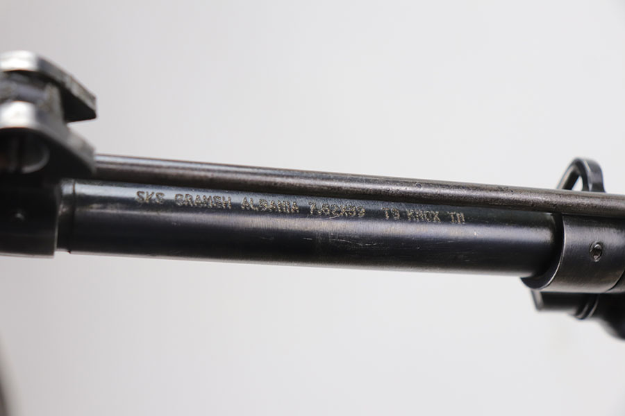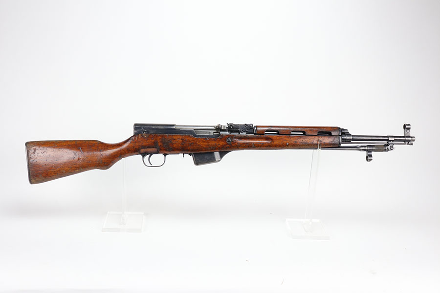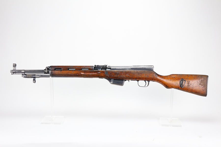 1/20/21 – This is a fairly rare and very early Albanian contract SKS that was made at the Um Gramsh factory in the late 1960s. Aside from the import mark under the barrel indicating it came from Gramsh in Albania, this variation can be identified by the longer stock and handguard, the design of the charging handle and the two holes for buttstock compartments. The gun is all matching, including receiver, stock, magazine, bolt, etc. Original finish is thin throughout but no pitting. Includes cleaning rod and folding bayonet. Mint bore. Stock has various dings and nicks but no structural issues. Very early serial, presumably indicating it was the 75th produced for this contract. There were only about 15,000-20,000 Albanian SKS rifles produced in total. C&R eligible.