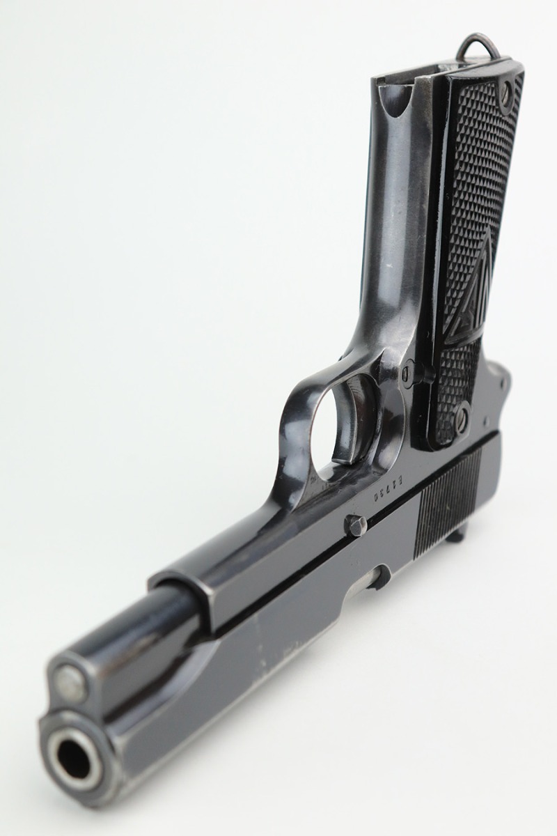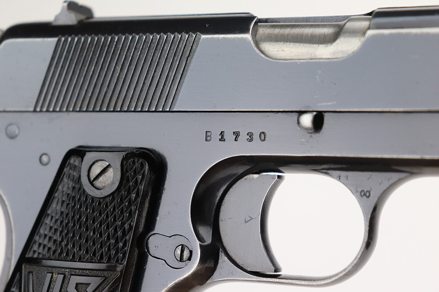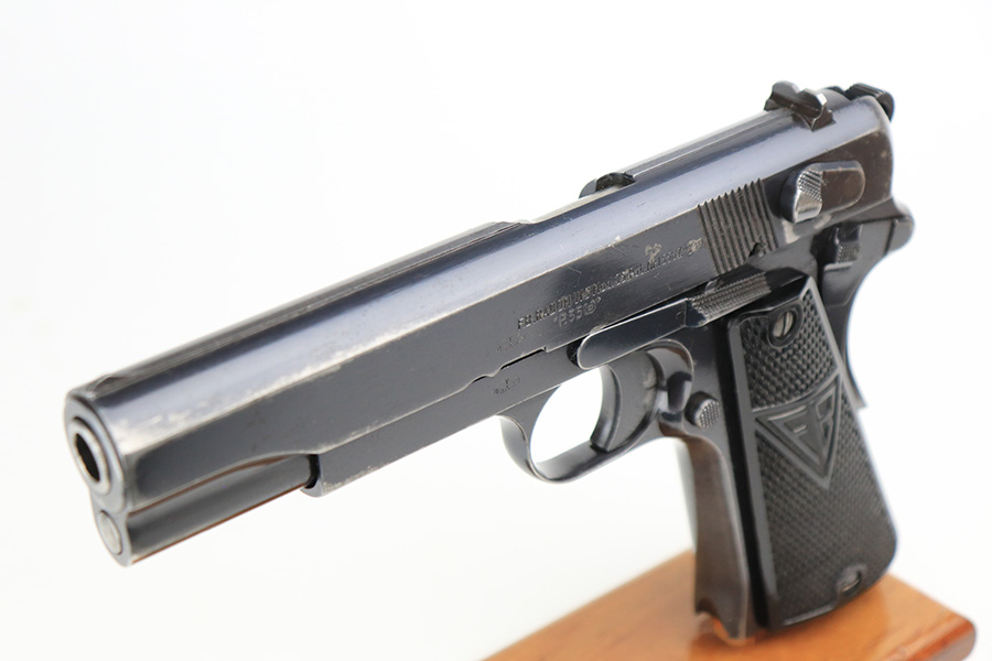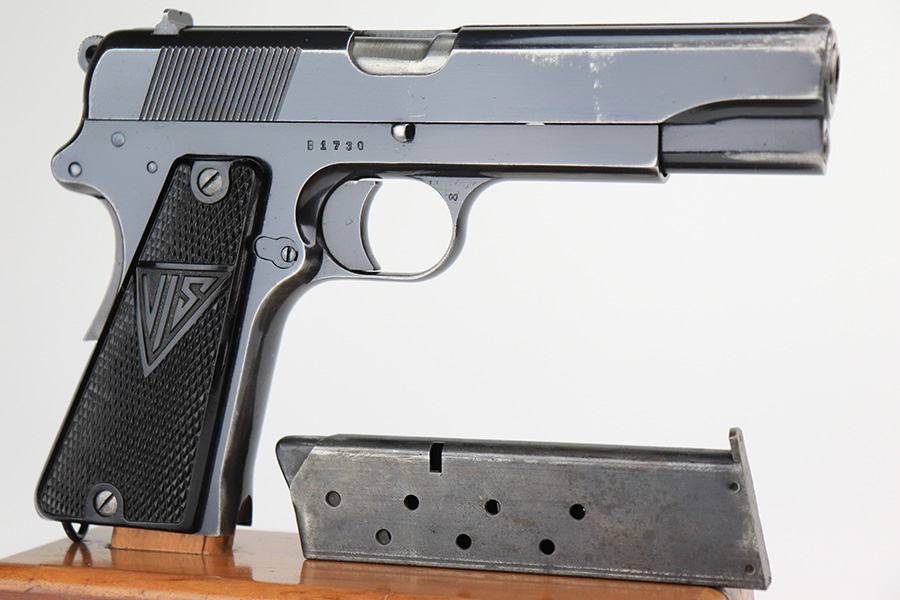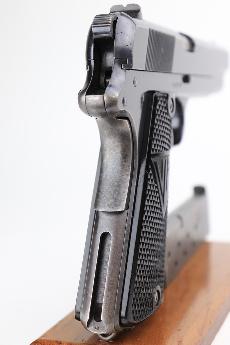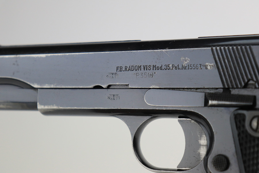 5/16/22 – This is an all matching and original Nazi Radom VIS Model 35 with early, slotted frame. The original blue rates at about 92-93%. Most of the finish loss around the muzzle and around the high edges of the slide. A couple of small spots of discoloration and some tiny scratches on the left side of the slide. Minor thinning on the grip straps. Comes with excellent period-correct black bakelite grips and one proper waffen-proofed magazine. The bore is shiny with strong rifling, but there is light freckling throughout.